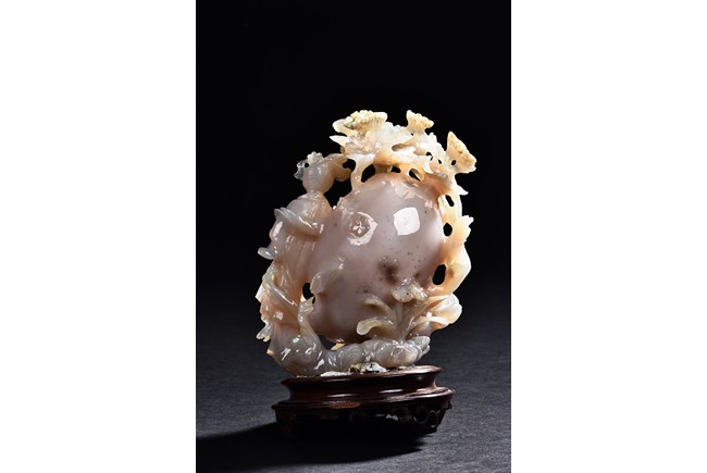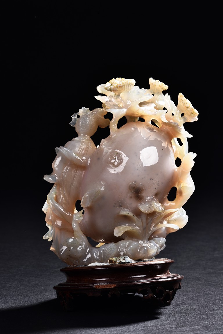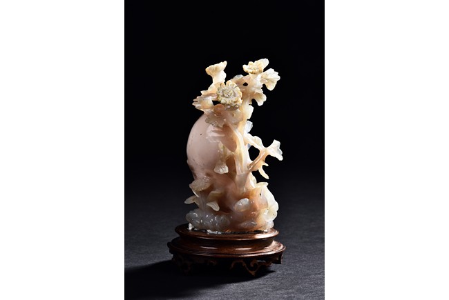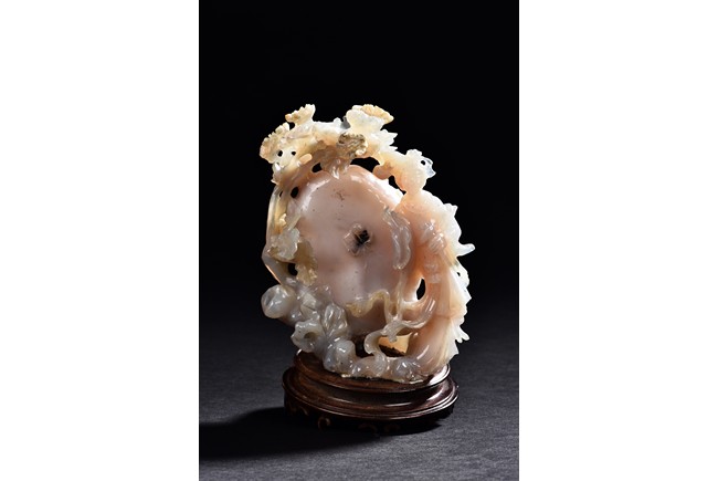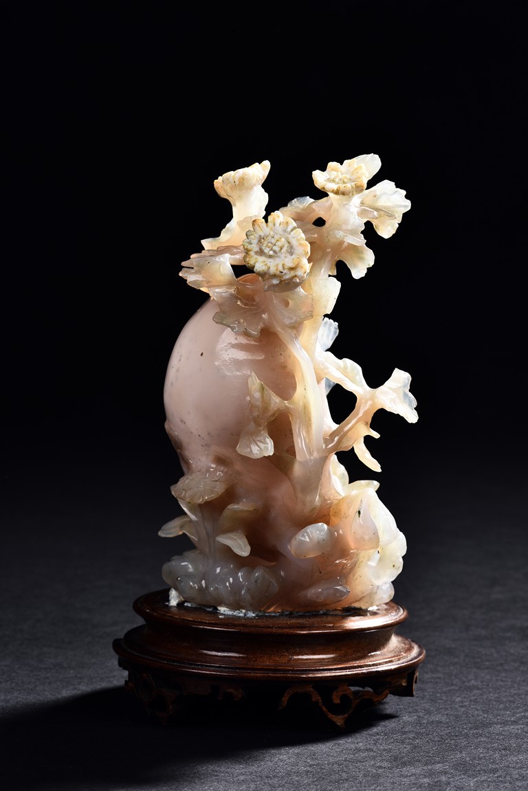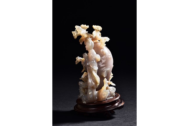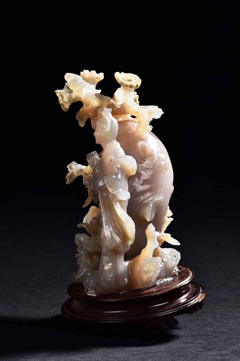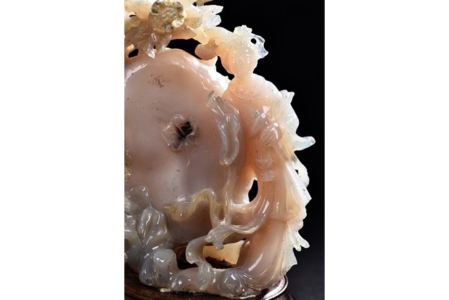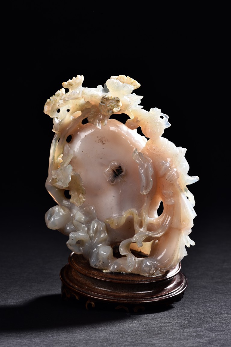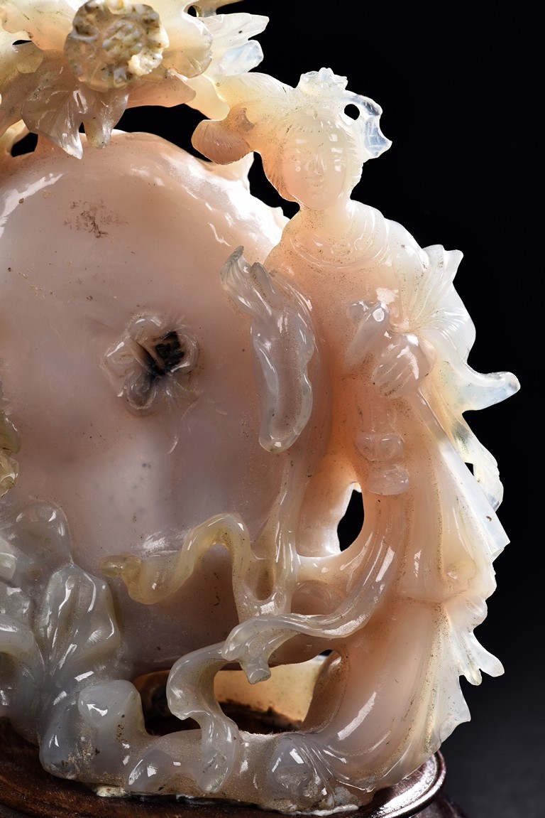 Carved with a slender beauty wearing long and flowing robe by a large and oblong shaped rockwork and flowers growing along the side.