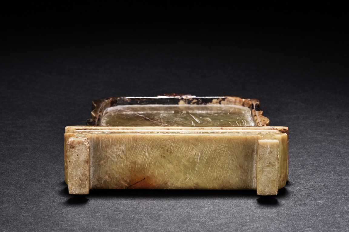 Rectangular, carved with a swimming duck and lotus flower, supported on stand. Qing Dynasty period.