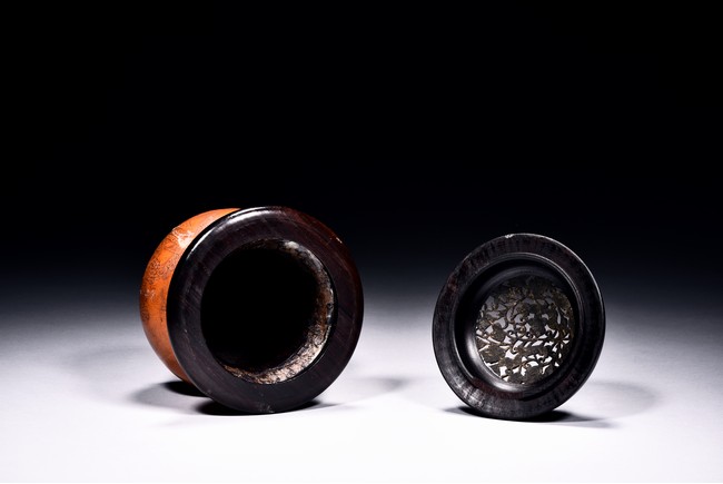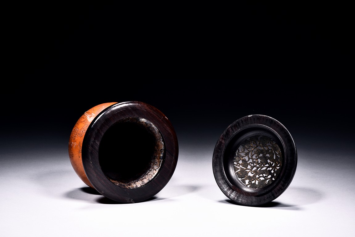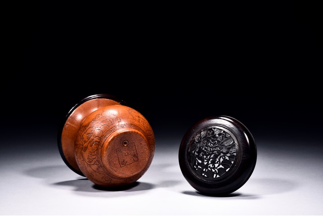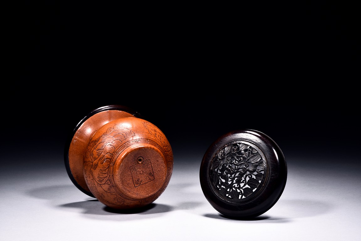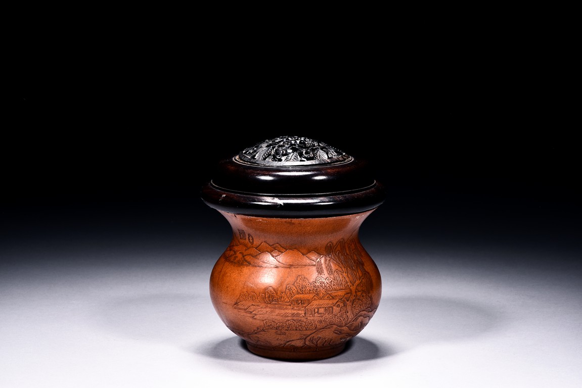 Of globular form with waisted neck and flared mouth mounted with a rosewood mouth rim, the exterior finely impressed with a mountainous landscape setting, including two scholars seated on the riverbank having a discussion and looking over the lake, with two seal marks on the upper body, the bottom inscribed with four character 'QIANLONG' mark, fitted with a reticulated dome cover. Qing Dynasty period.