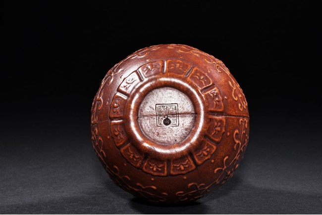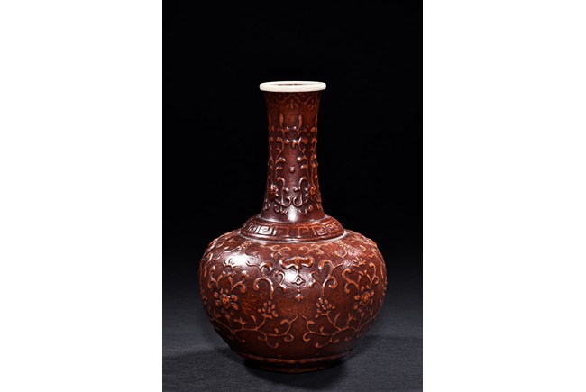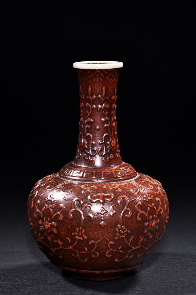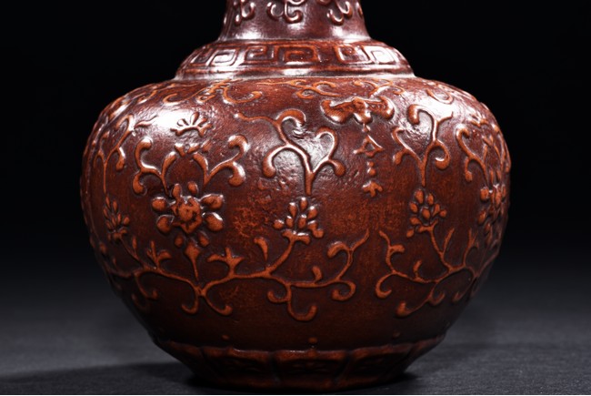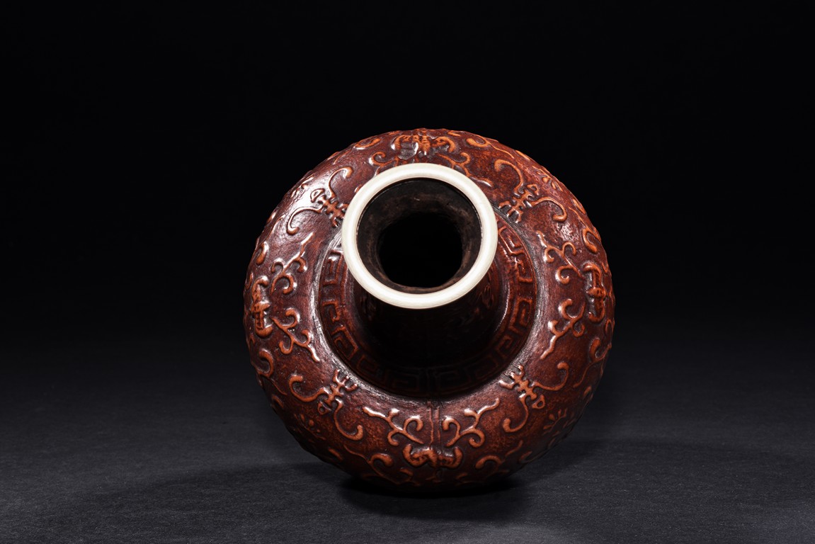 Rising to a long neck, the body carved an auspicious bat flanked by scrolling floral motif. The neck decorated with a key-fret band. The bottom base bearing a four character mark. Qing Dynasty Period.