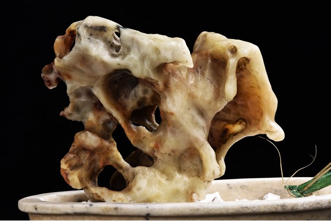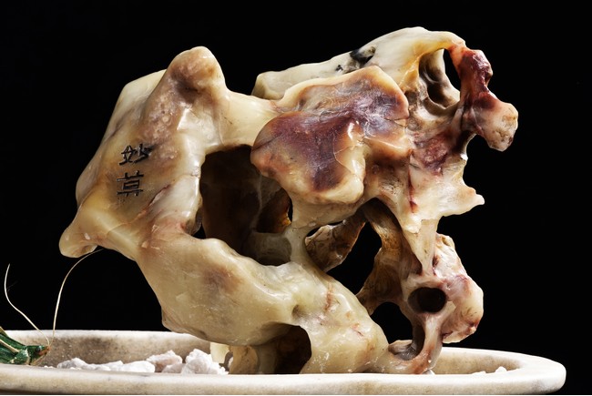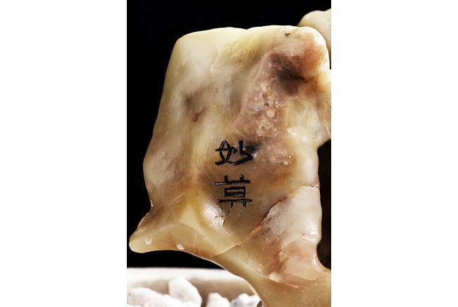 The tray raised on four low tab-feet, the vertical side carved with panel in relief; the soapstone scholar's rock is of irregular shape, with two character 'Miao Suan' incised, the stone is of mottled ochre-caramel tone.