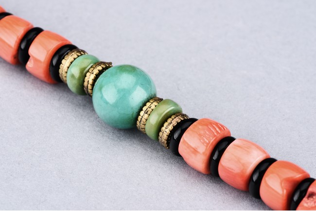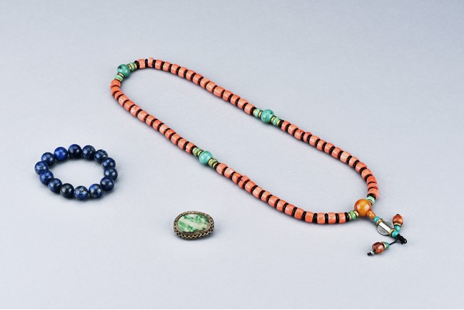 A GROUP OF LAPIS LAZULI, CORAL, AND JADEITE JEWELRY 青金石手串, 珊瑚珠鏈, 翡翠胸針各一隻