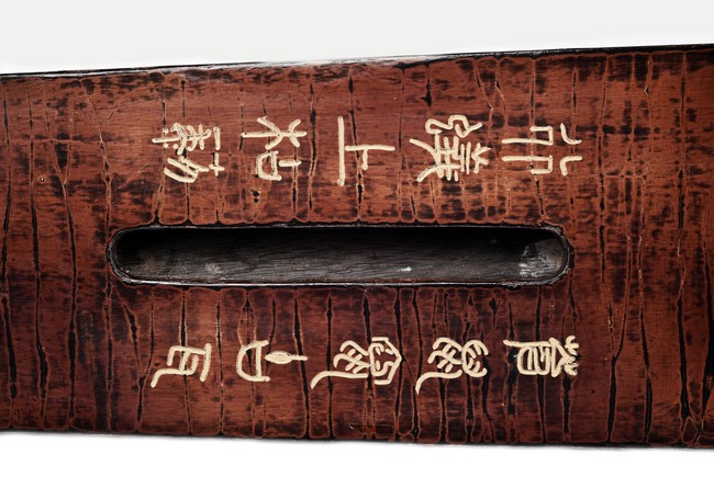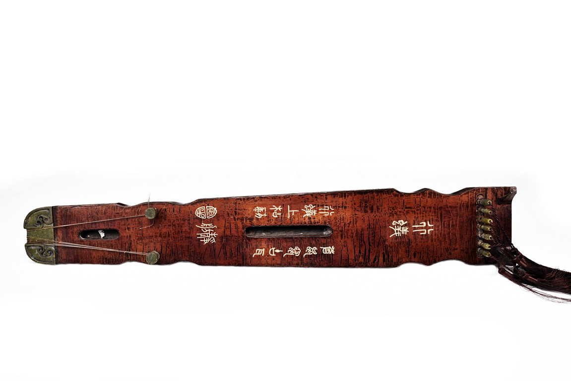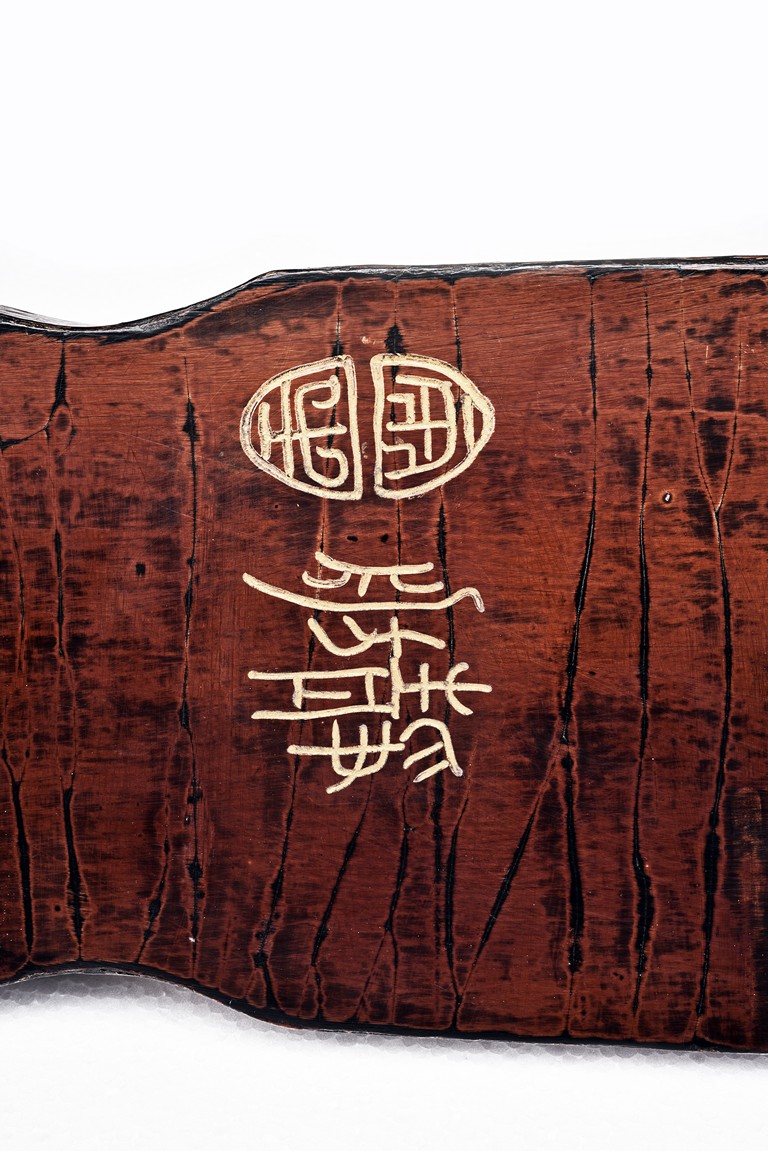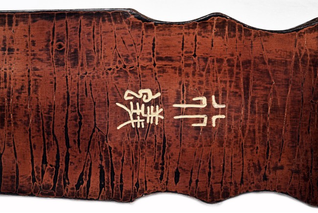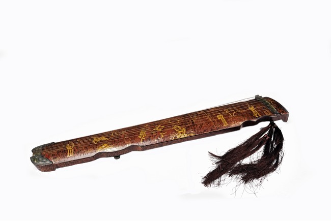 The stringed instrument Qin with arched hardwood board raised at the bridge with two short feet, front gilt-painted with figures, fitted with seven strings, the reverse incised with inscriptions and seal mark.