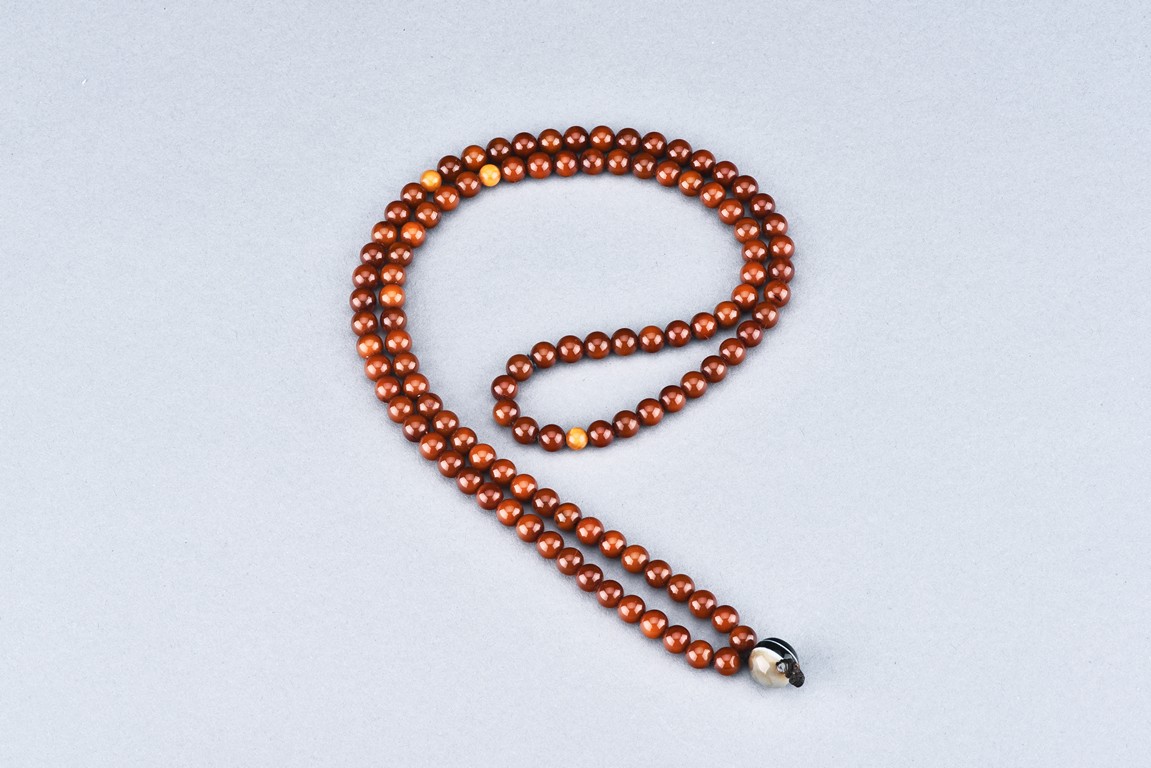 Comprising of numerous rounded amber beads and a rounded black and white 'goat eye' Dzi bead.