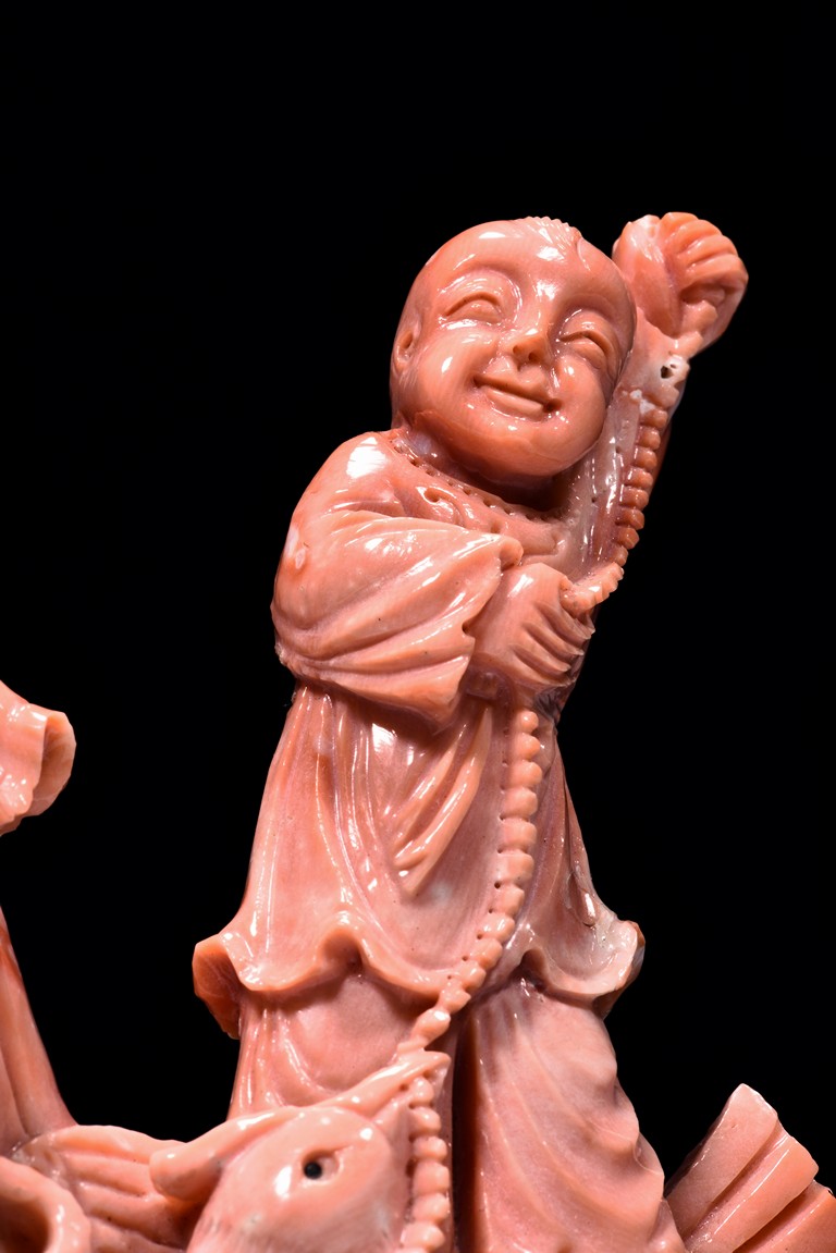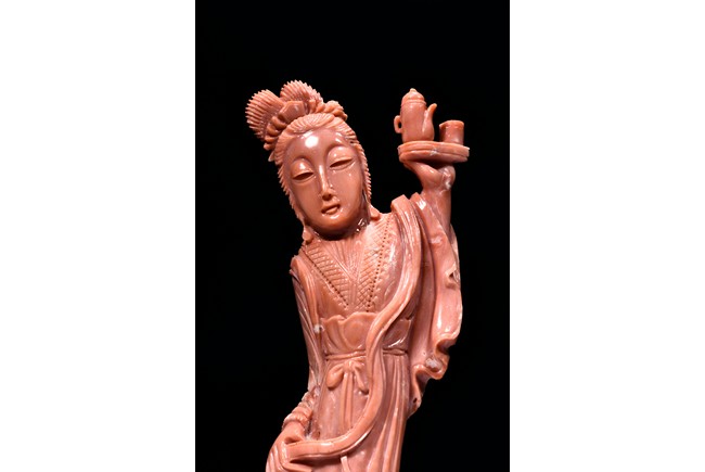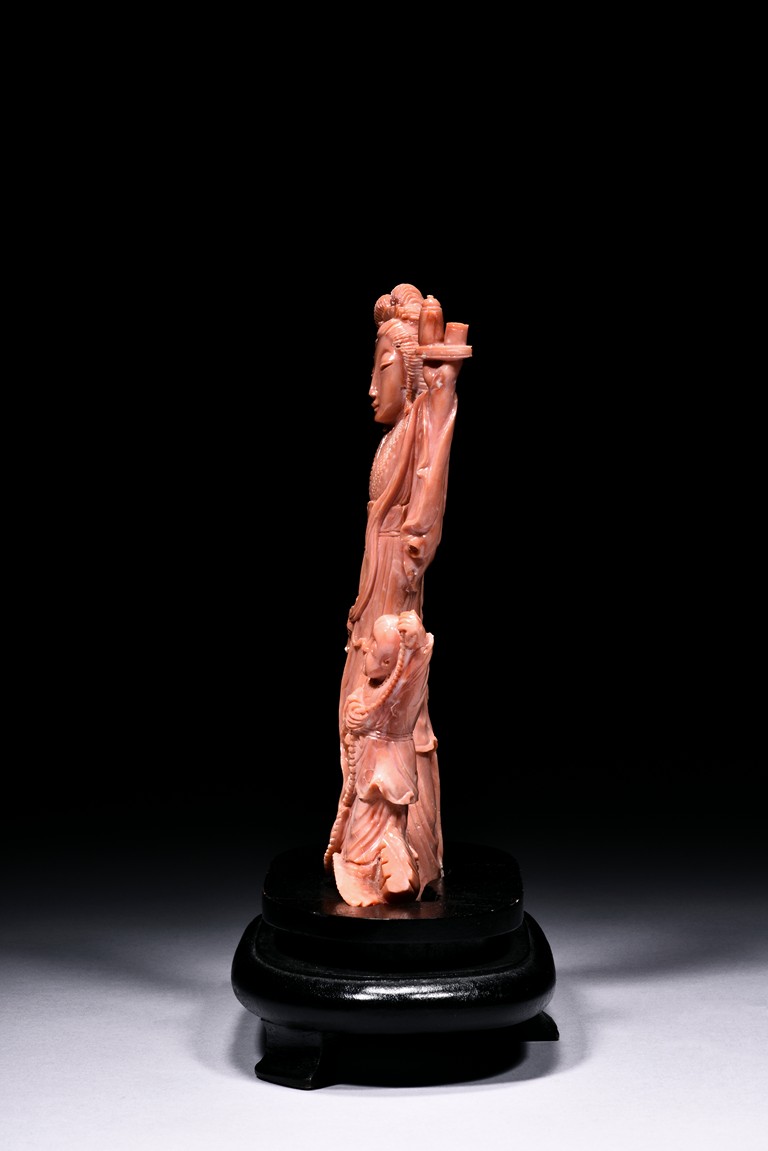 Finely carved as a female attendant with left hand raised high and holding a plate holding a teapot set, wearing long robe with folds, the right hand holding a ribbon, accompanied with a young boy standing upon a phoenix and holding a beaded string tied to its beak. Qing Dynasty period.