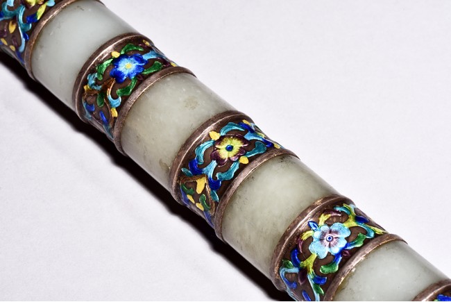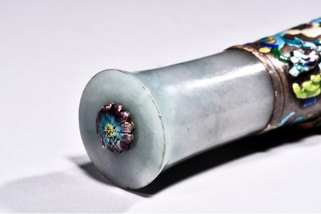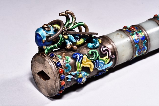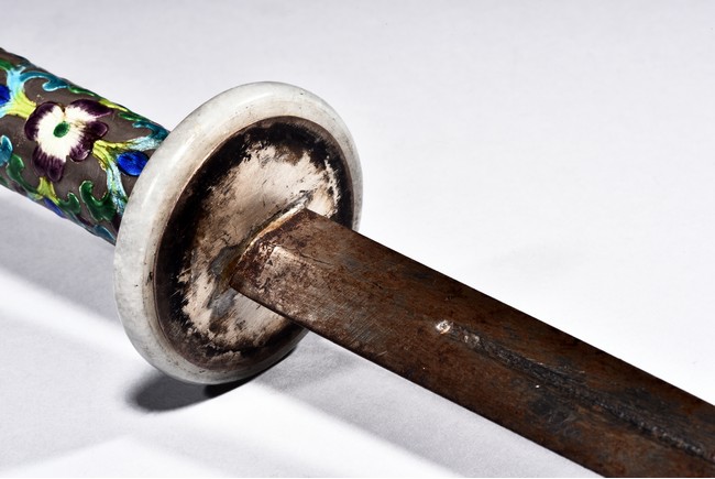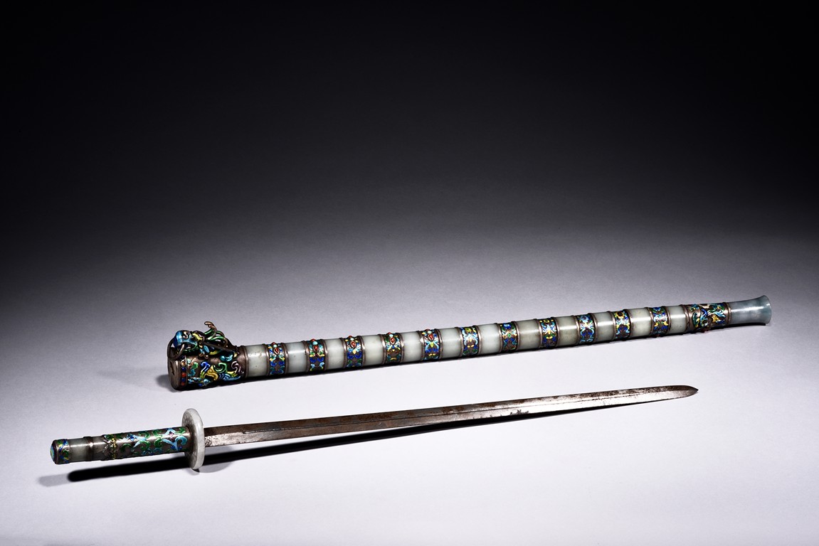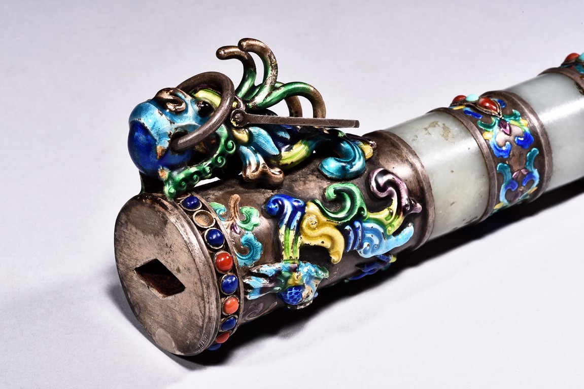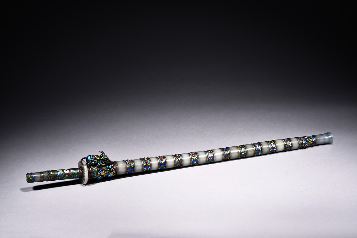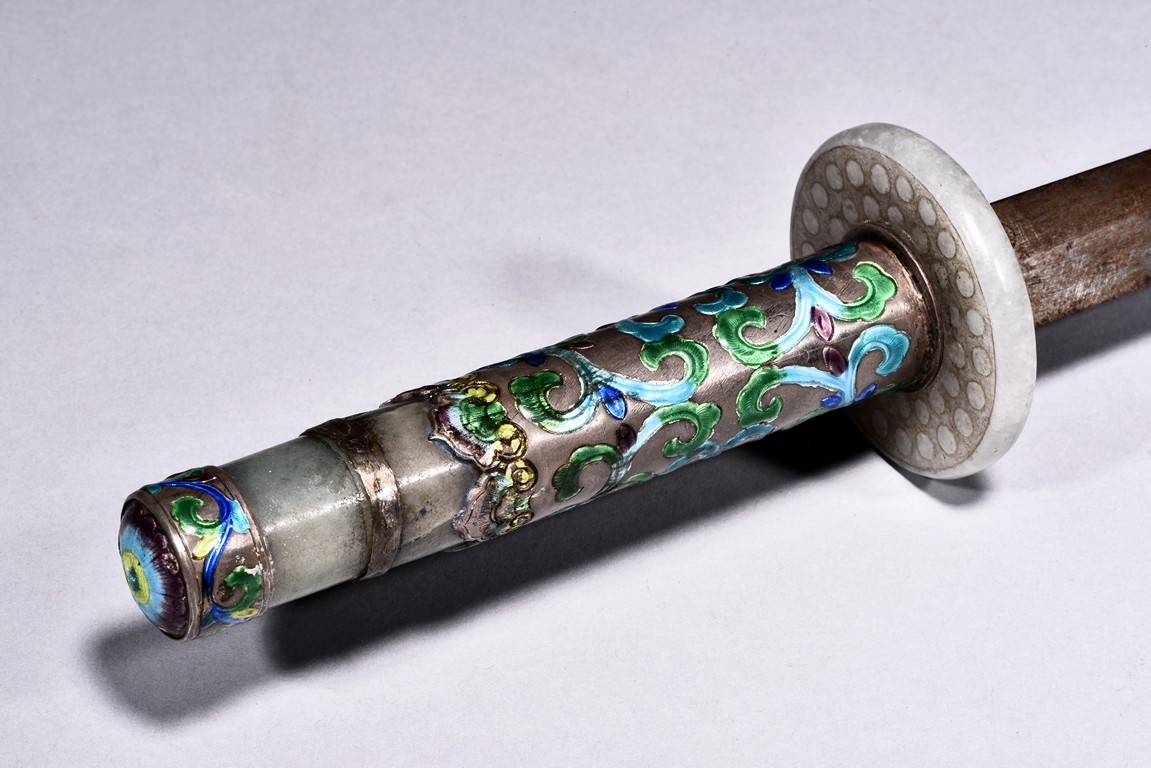 The sheath is finely decorated with alternating silver enamelled floral bands with semi-precious gem beads, spaced by white jade rings, each softly polished with good translucency, the end mounted with a dragon head mask with ring. The handle is further decorated with circular white jade disk and enamelled decoration. Late Qing/ Early Republic period.