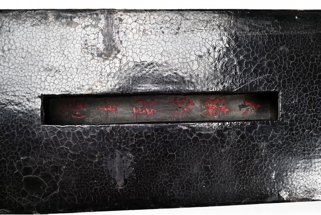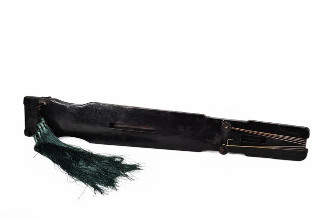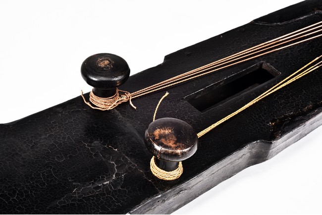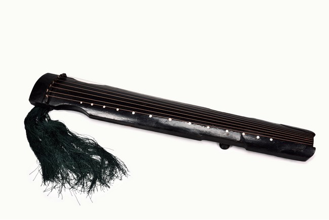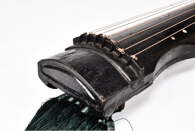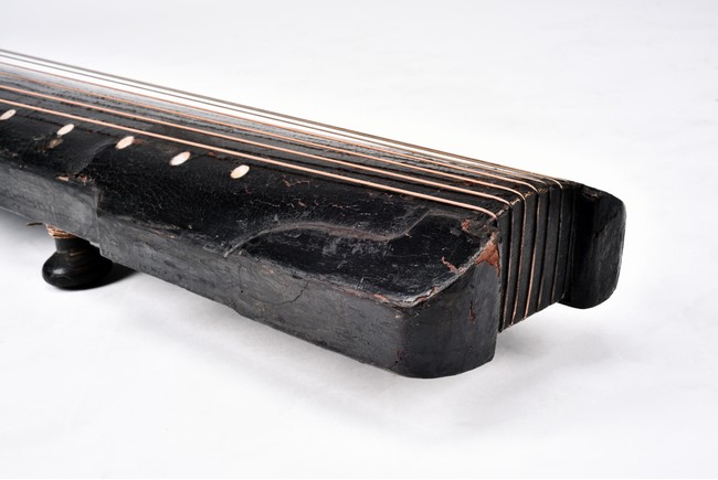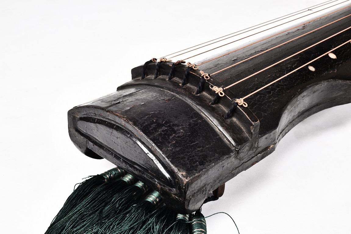 The stringed instrument Qin with arched black lacquered board raised at the bridge with two short feet, fitted with seven strings, the reverse bears a six character 'QIANLONG' painted mark. Qing Dynasty period.