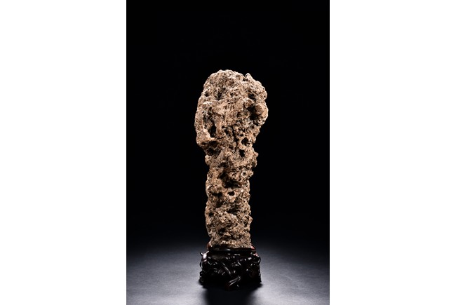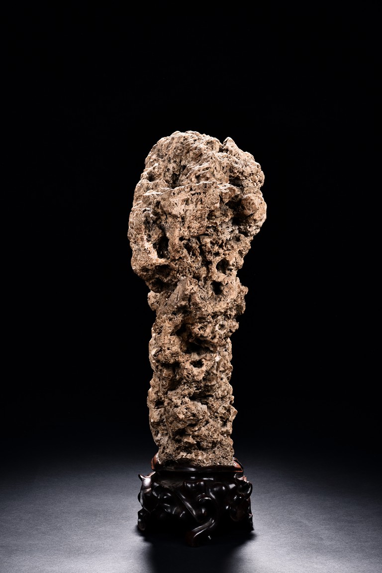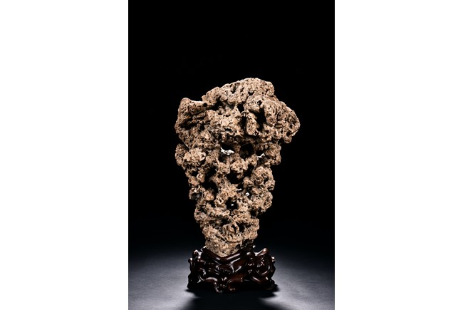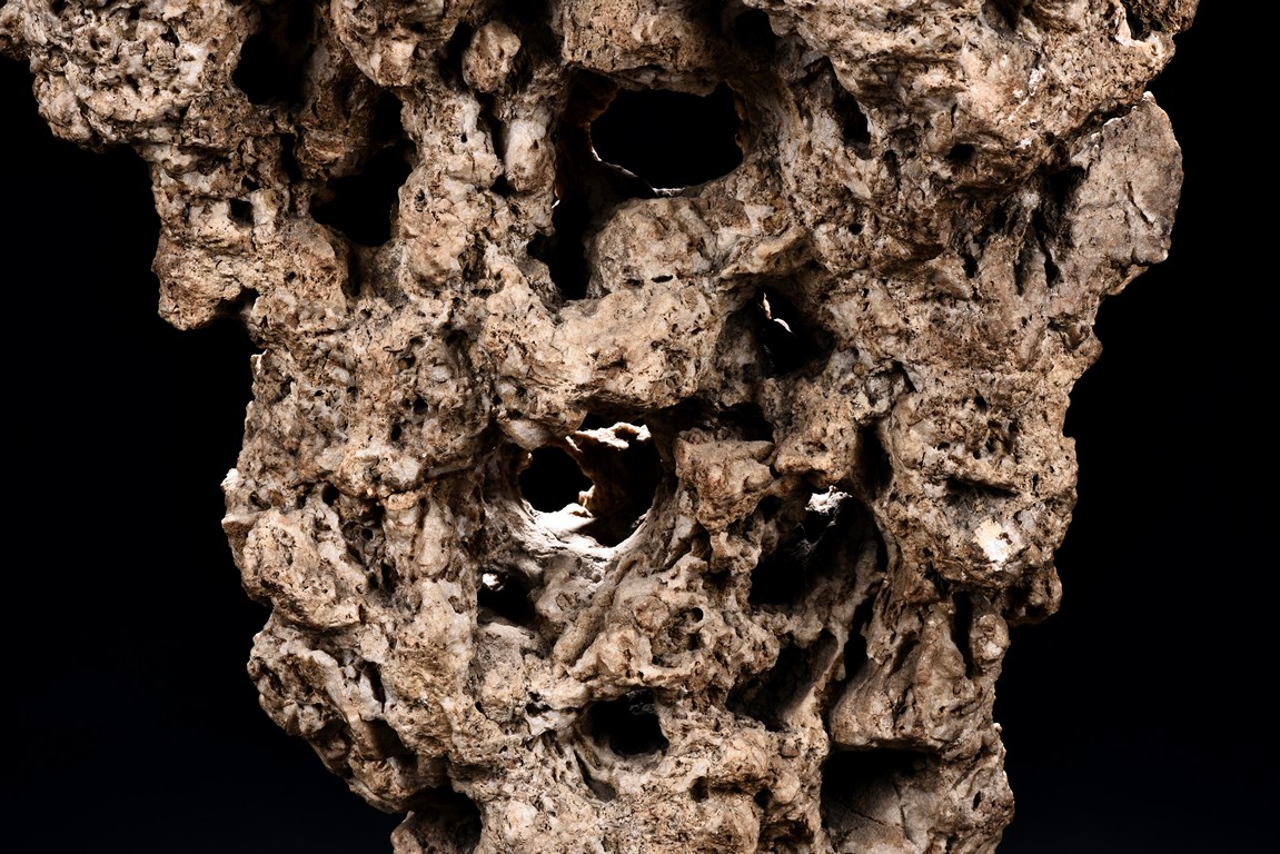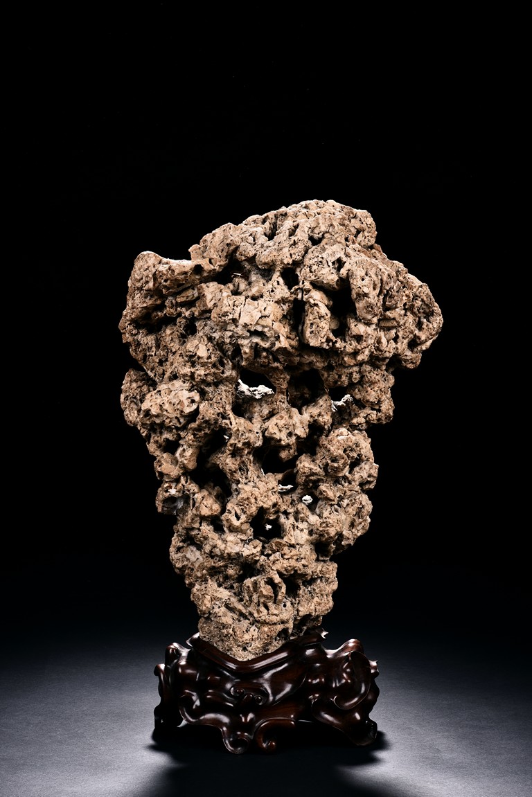 In the form of a jagged mountain with numerous rocky peaks, outcrops, and crevices. Fitted with hardwood stand.