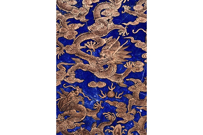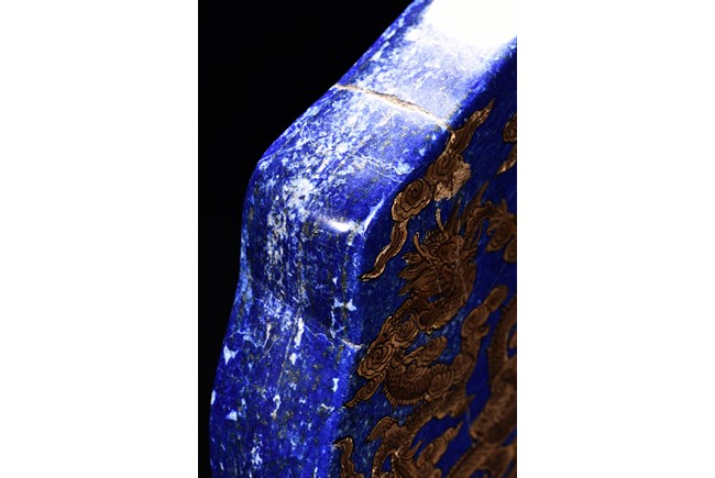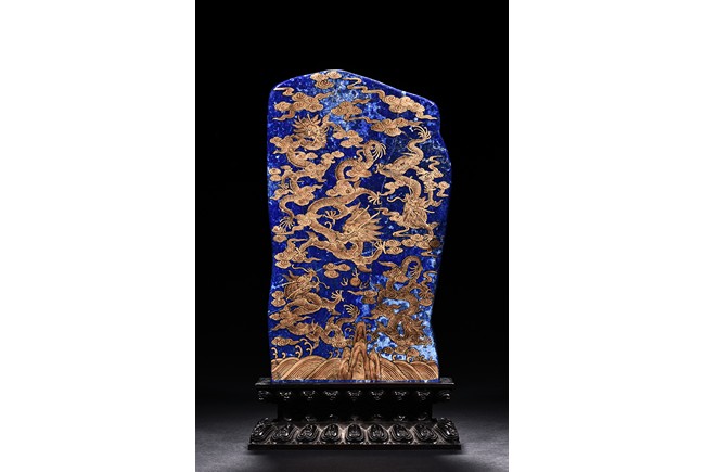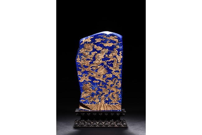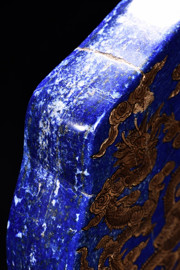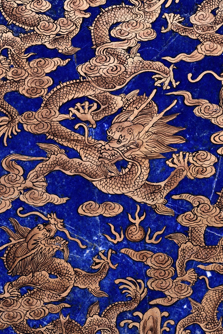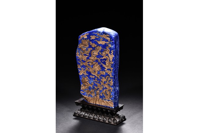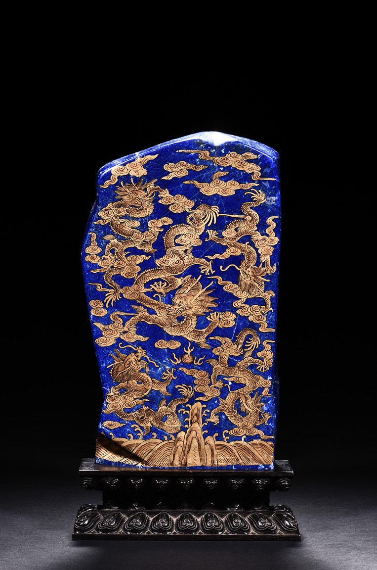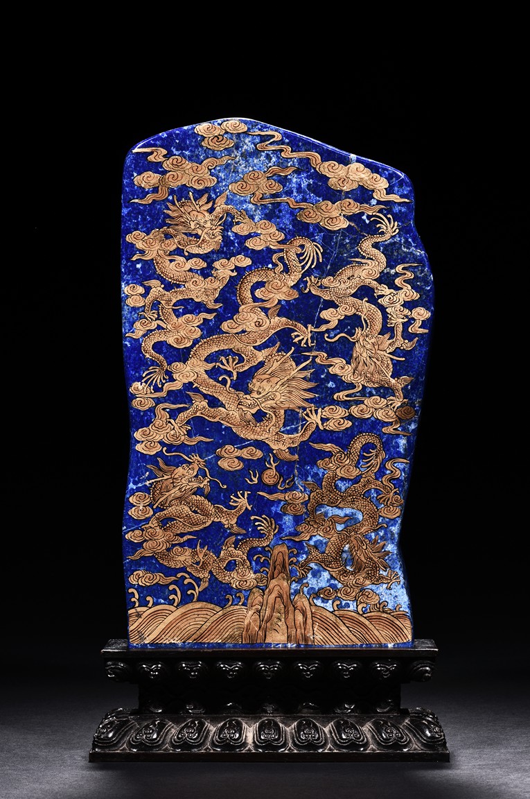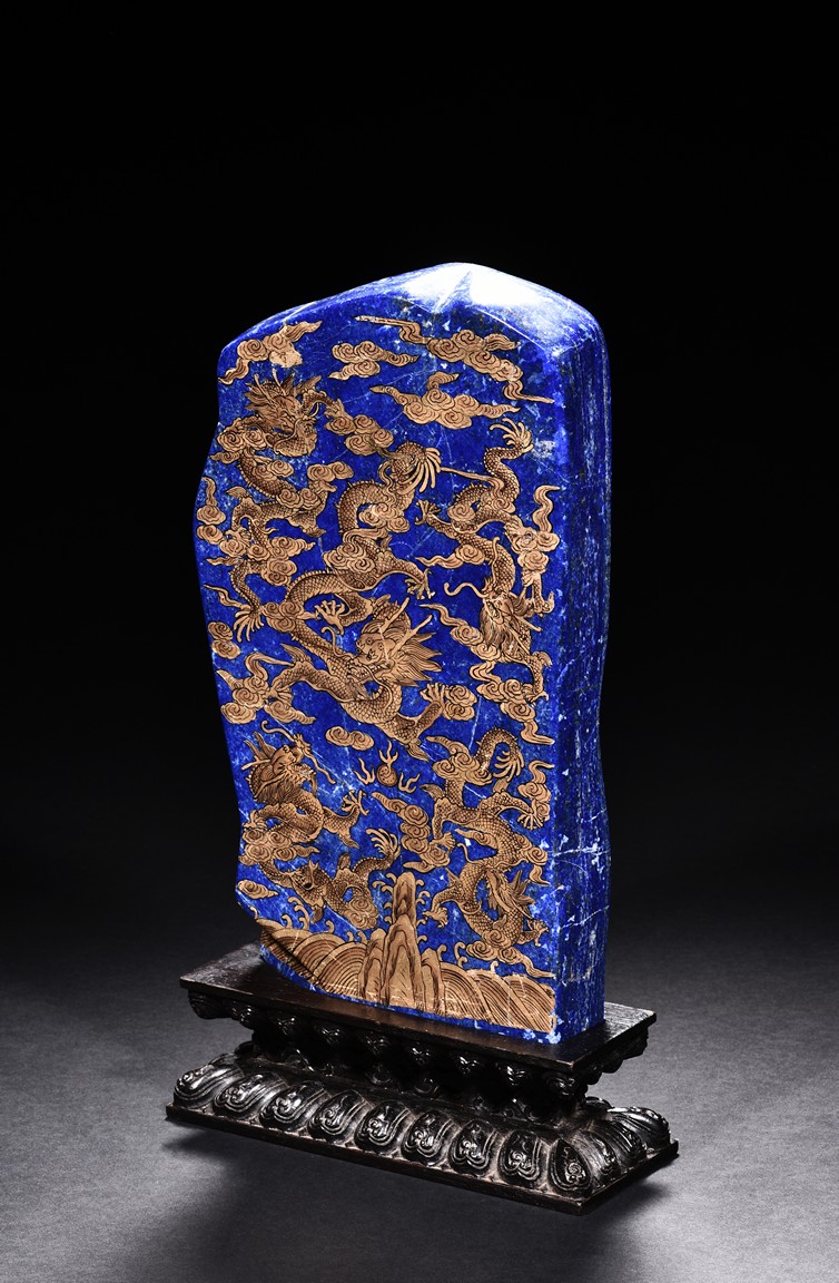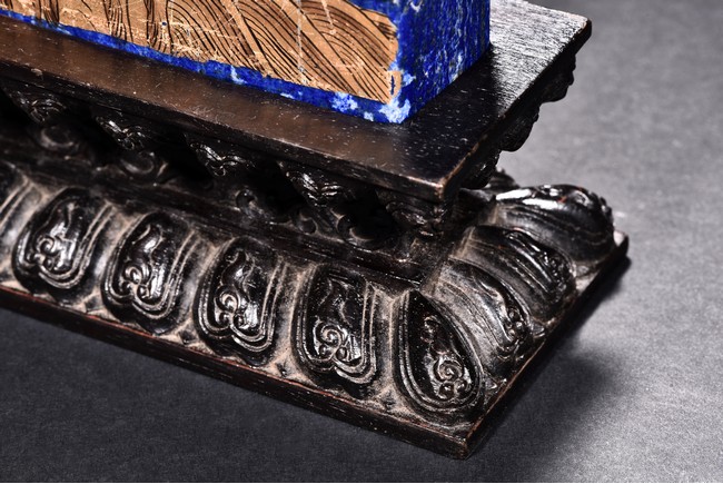 Of irregular vertical rectangular form, both sides are exquisitely painted in gilt with five powerful dragons amid auspicious clouds above the sacred mountain and scudding waves, all supported on a zitan double lotus throne carved in deep relief.
