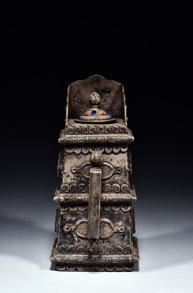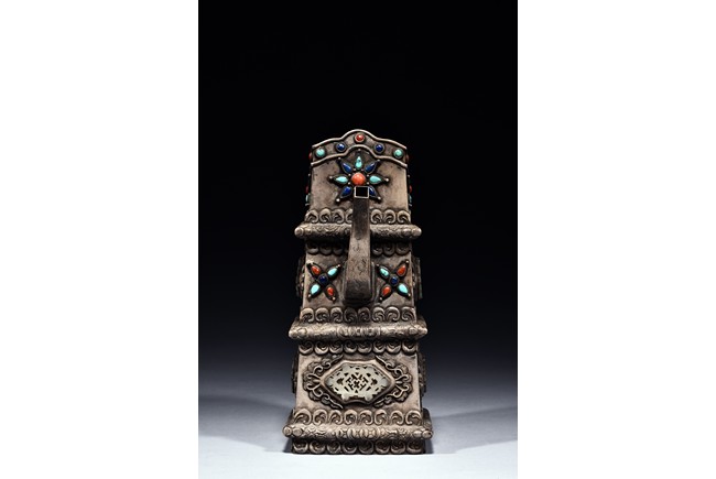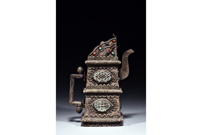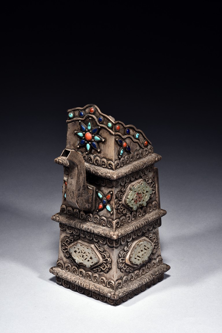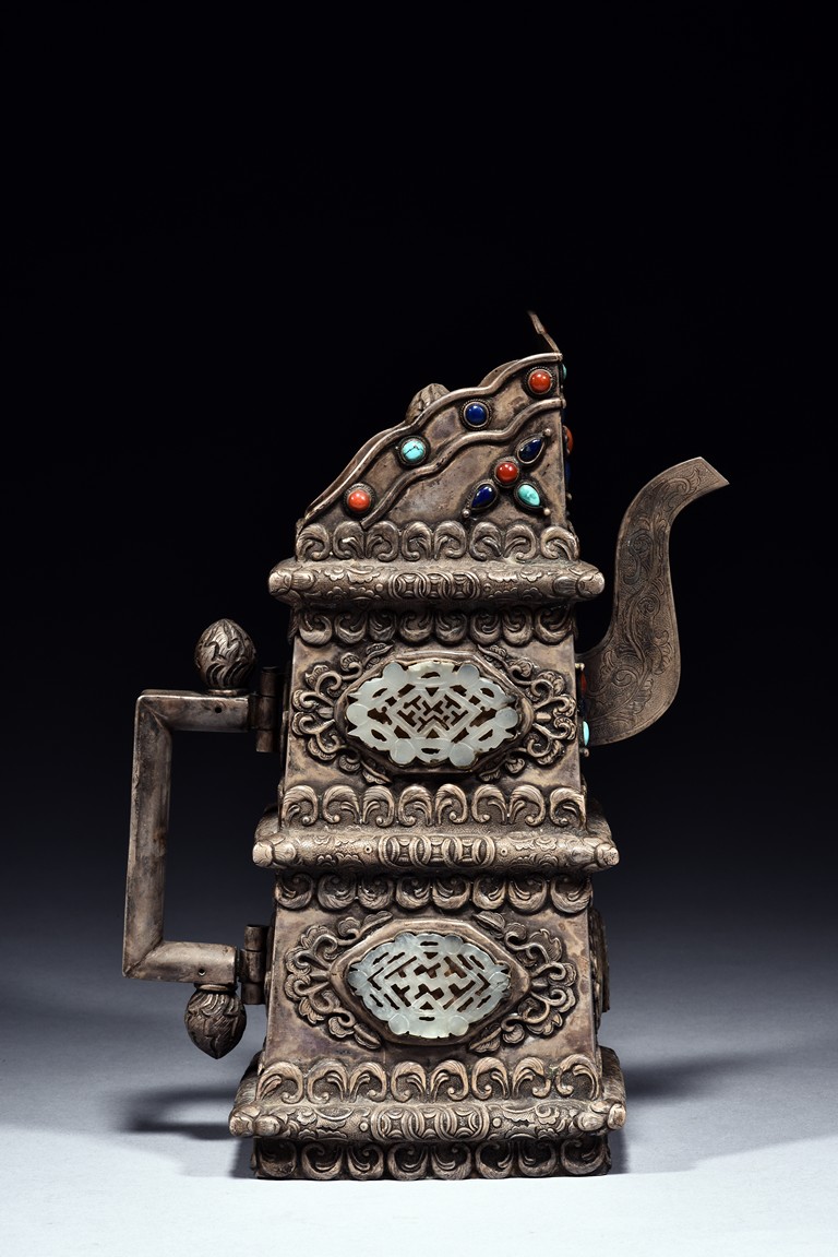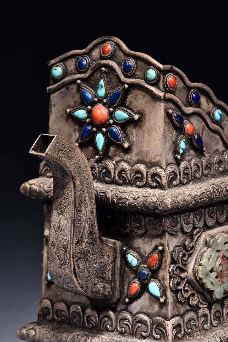 Of rectangular section, the ewer is divided into three sections by raised bands decorated with scrolling floral pattern. Each of the lower two sections is mounted with reticulated jade plaques and turquoise, coral, and lapis lazuli beads, further surrounded by raised floral pattern and border with repeated bands of ram horns, flanked by a spout incised with floral scrolls and a handle with two bead finials. Qing Dynasty period.