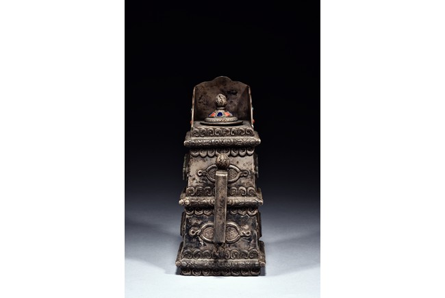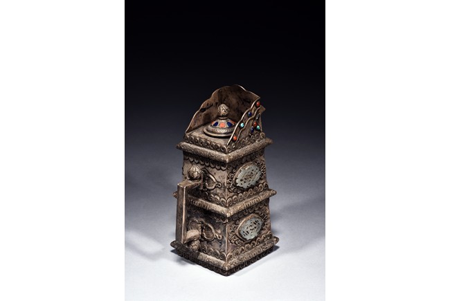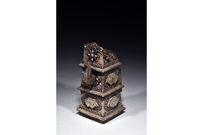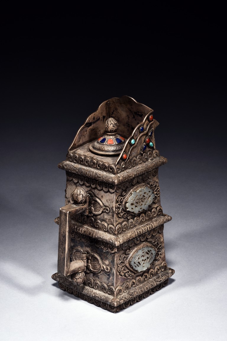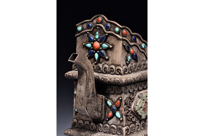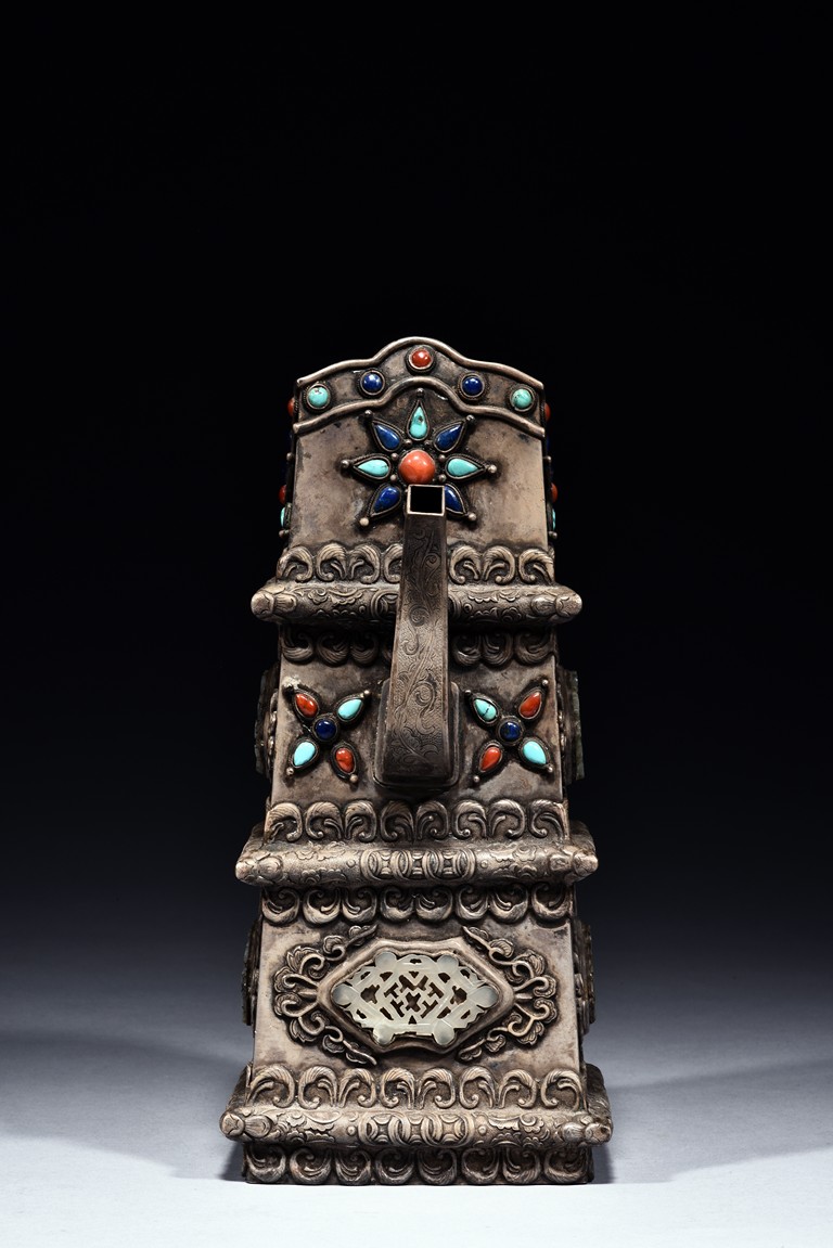 此瓶通體以銀為胎,嵌白玉,綠松石,珊瑚,青金石