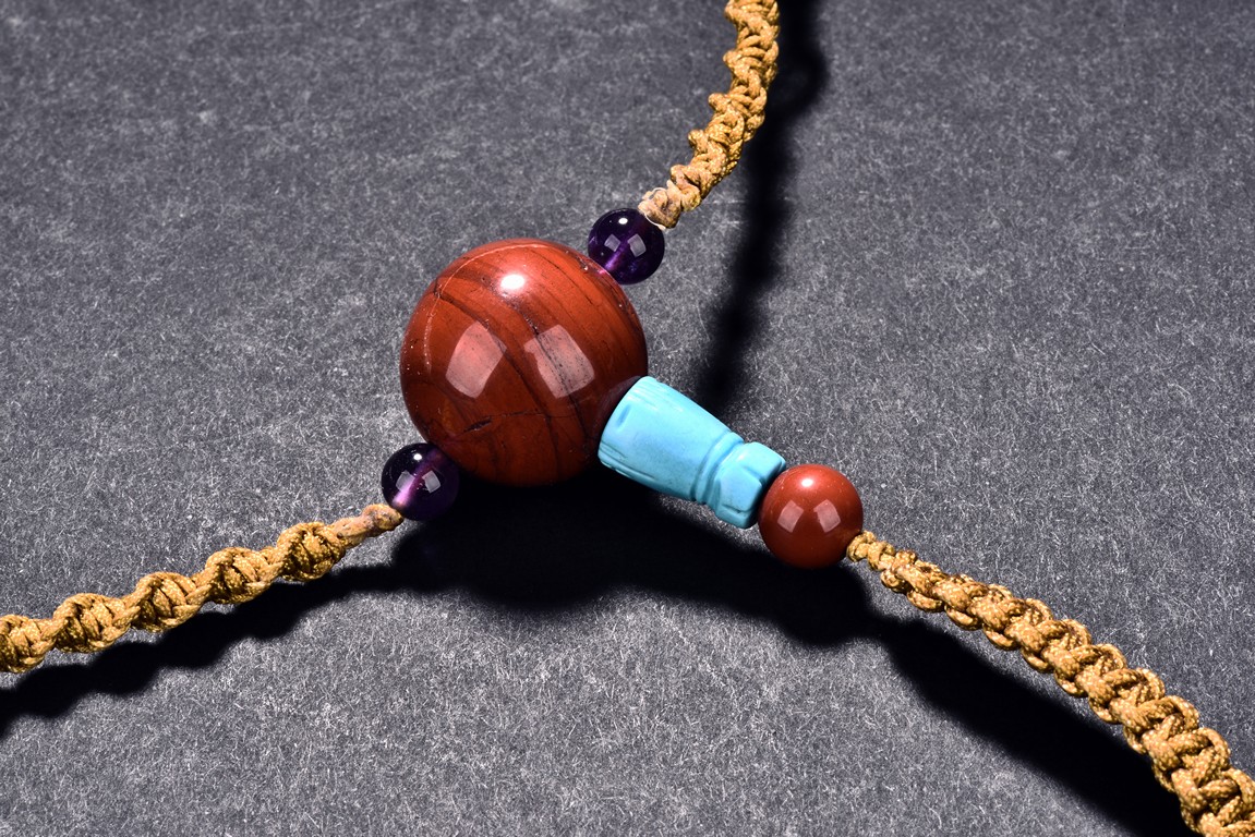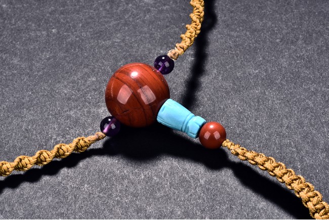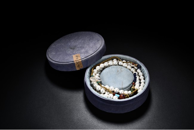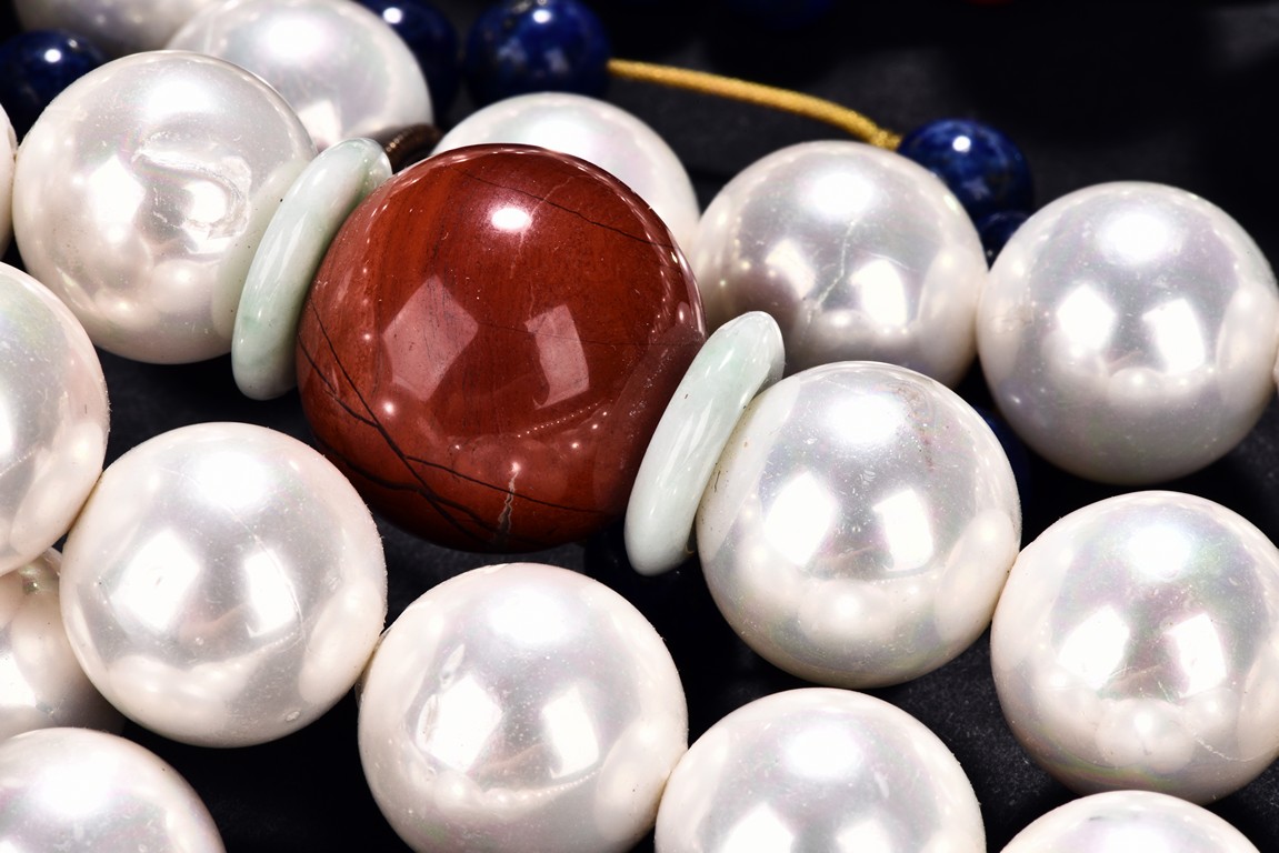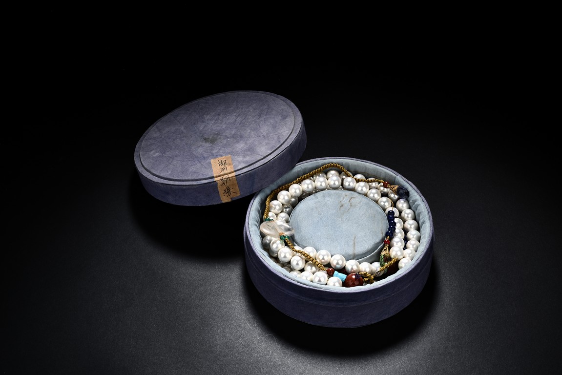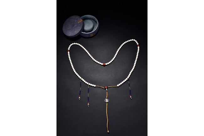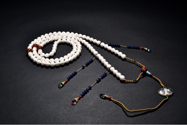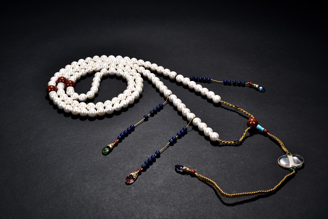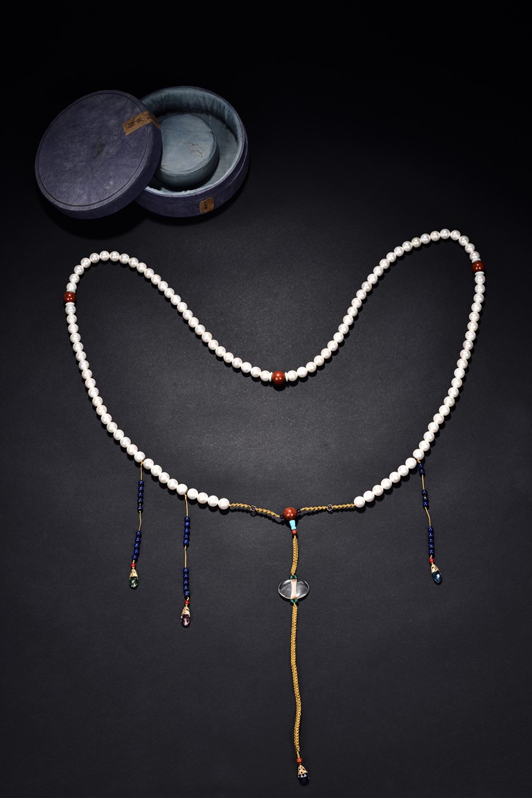 Consisting of 108 pearls spaced by red agate bead, the gourd foutouta suspending an oval rock crystal plaque, terminating with a tear-drop shaped gem, the three jinian strands of lapis lazuli beads each further suspending a similar tear-drop shaped gem, accompanied with a circular box.