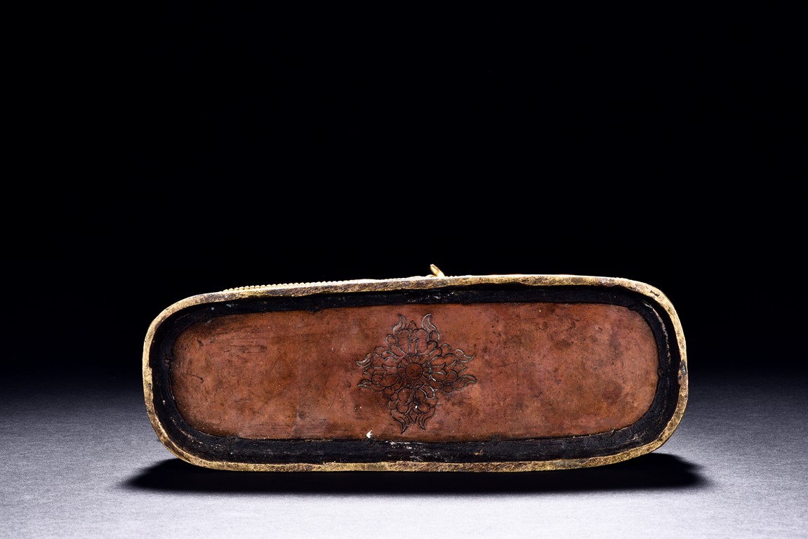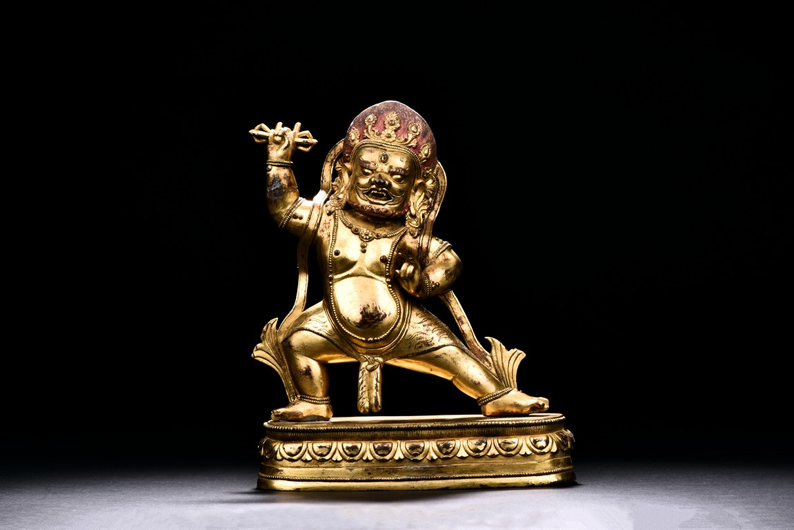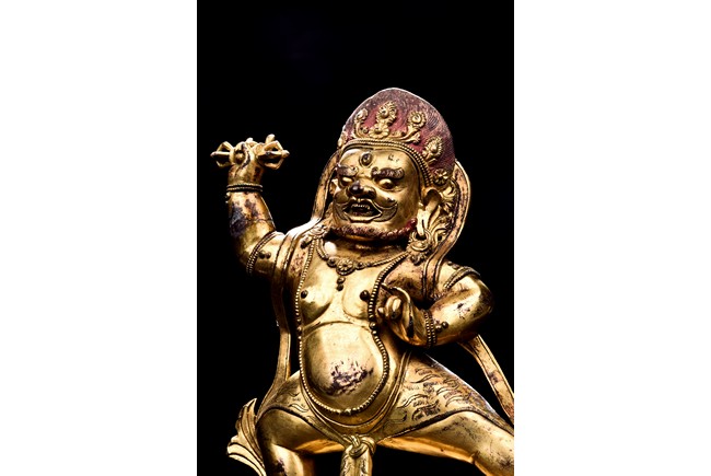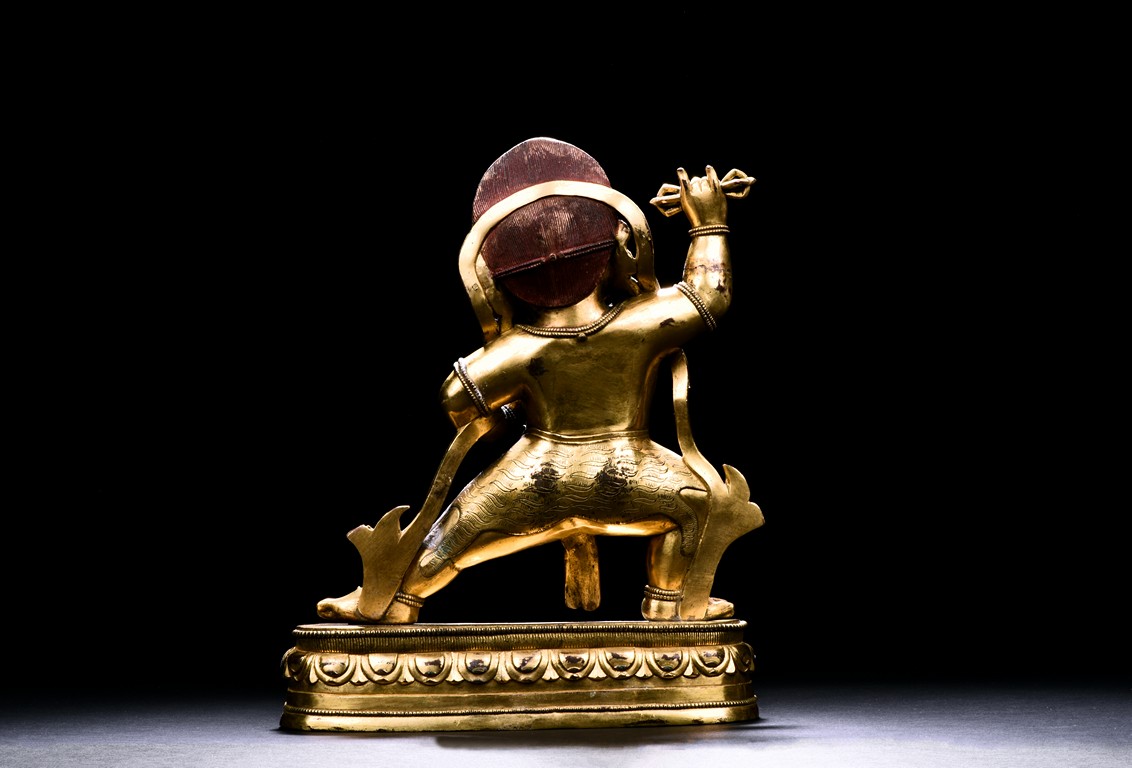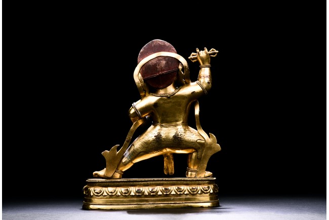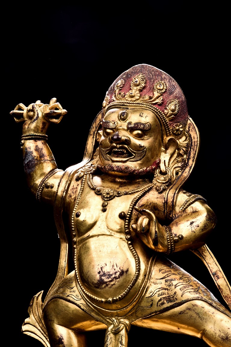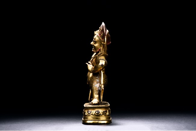 Shown standing on a lotus petal throne, the bodhisattva is shown in his raised right hand holding a vajra and left hand in apanamudra, dressing in tiger-skin dhoti, his ferocious and intense face is animated by bulging eyes and brushy eyebrows, the flaming red hair is secured by adorned crown. 18/19th Century.