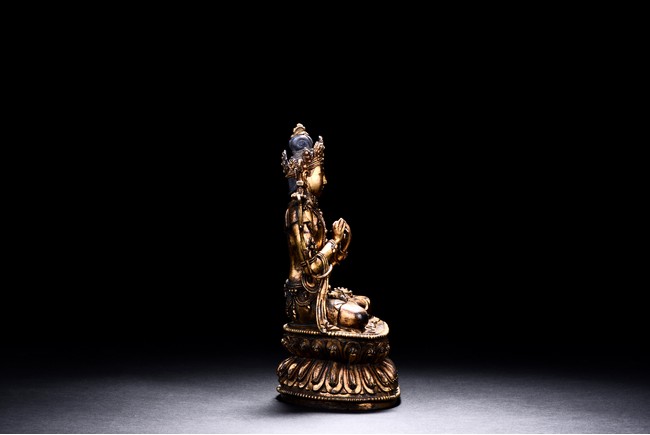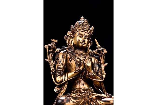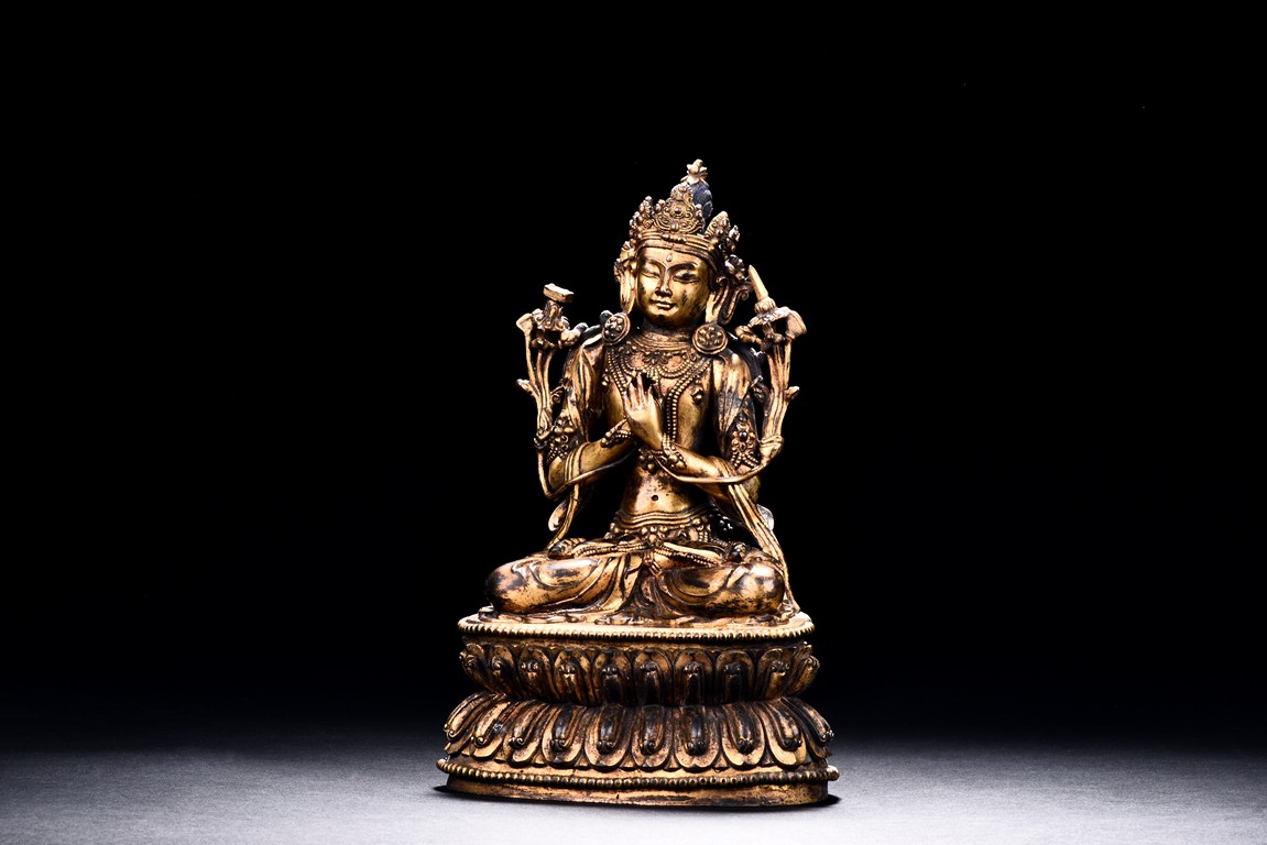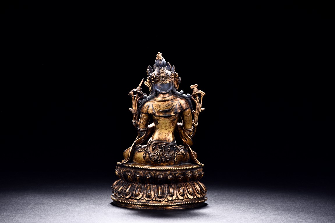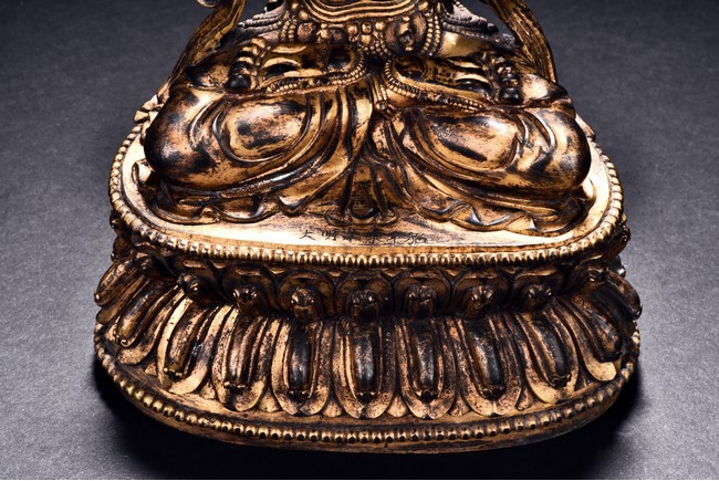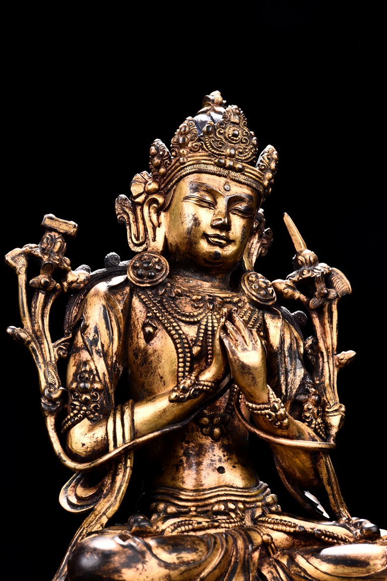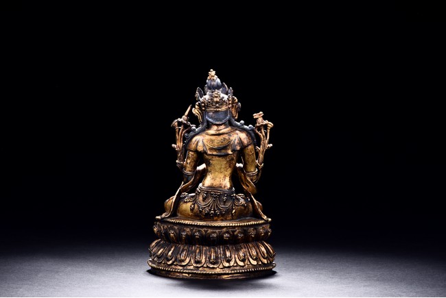 Finely cast seated in dhyanasana on a double-lotus pedestal, the hands held in dharmachakra mudra, flanked by two lotus stalks, wearing a foliate tiara, the body adorned with elaborate jewellery, the face with serene expression and topped with five pointed crown. The front base incised with six character 'YONGLE' mark.