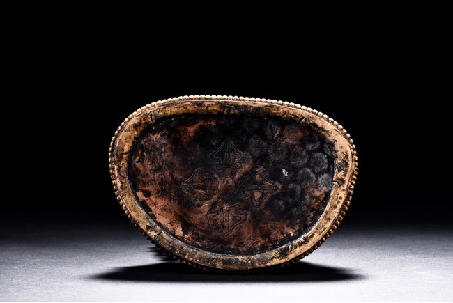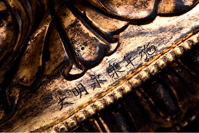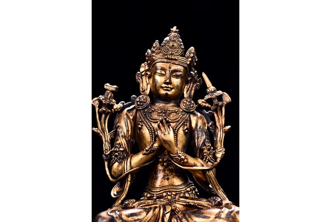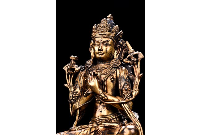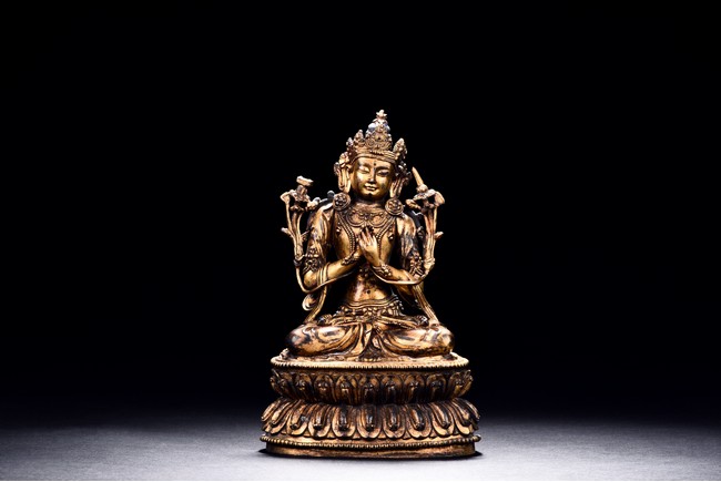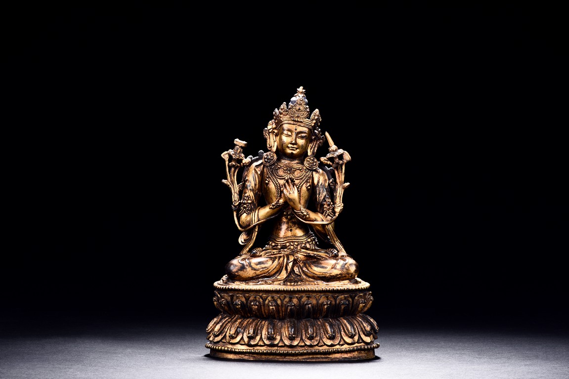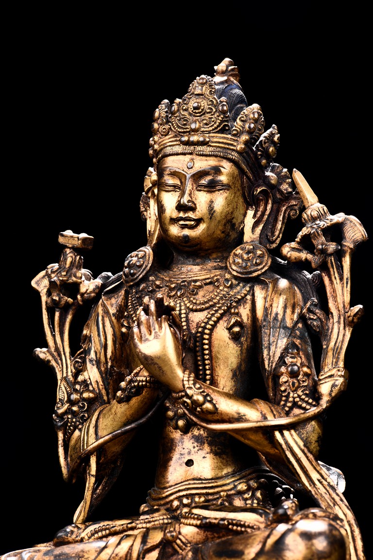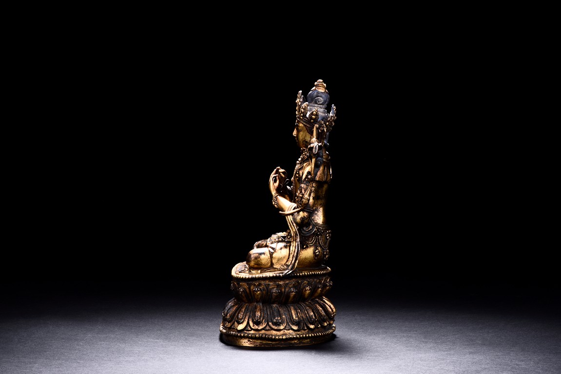 Finely cast seated in dhyanasana on a double-lotus pedestal, the hands held in dharmachakra mudra, flanked by two lotus stalks, wearing a foliate tiara, the body adorned with elaborate jewellery, the face with serene expression and topped with five pointed crown. The front base incised with six character 'YONGLE' mark.