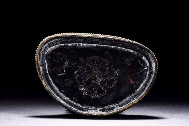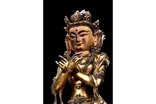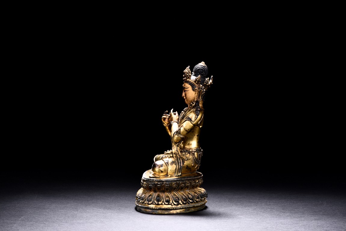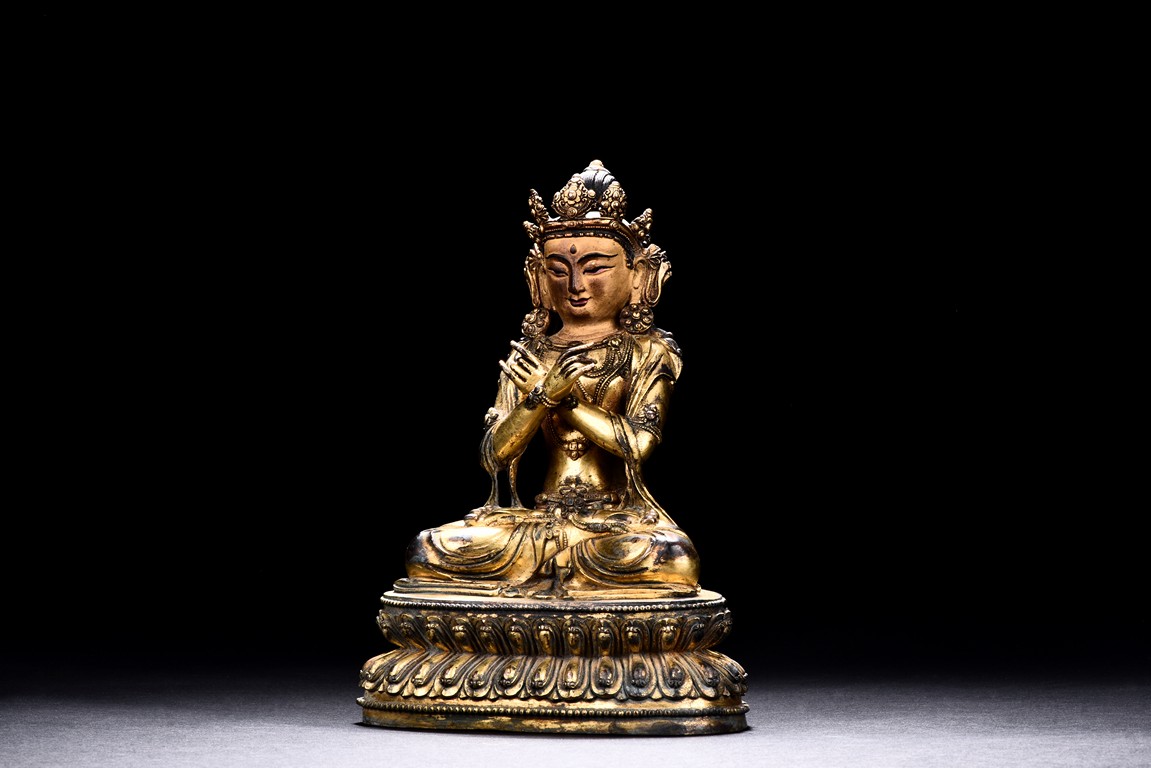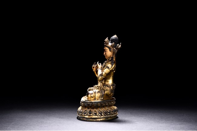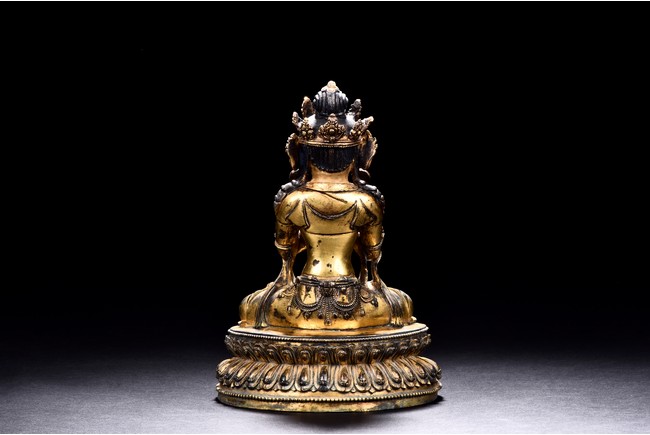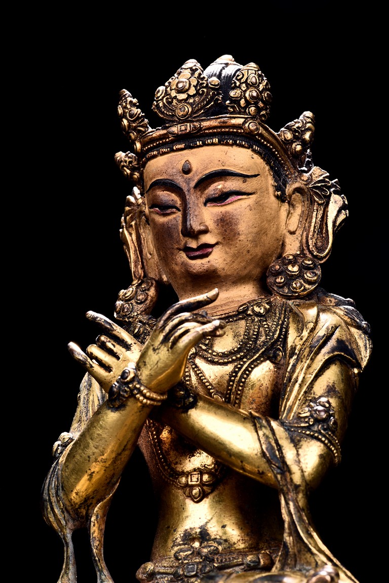 Shown seated on a double lotus throne in dhyanasana and both hands crossed over, the bodhisattva wearing long flowing robe and adorned with beaded jewelry, the face shown with benevolent expression and flanked by pendulous earlobes and circular earrings. The bottom base sealed.