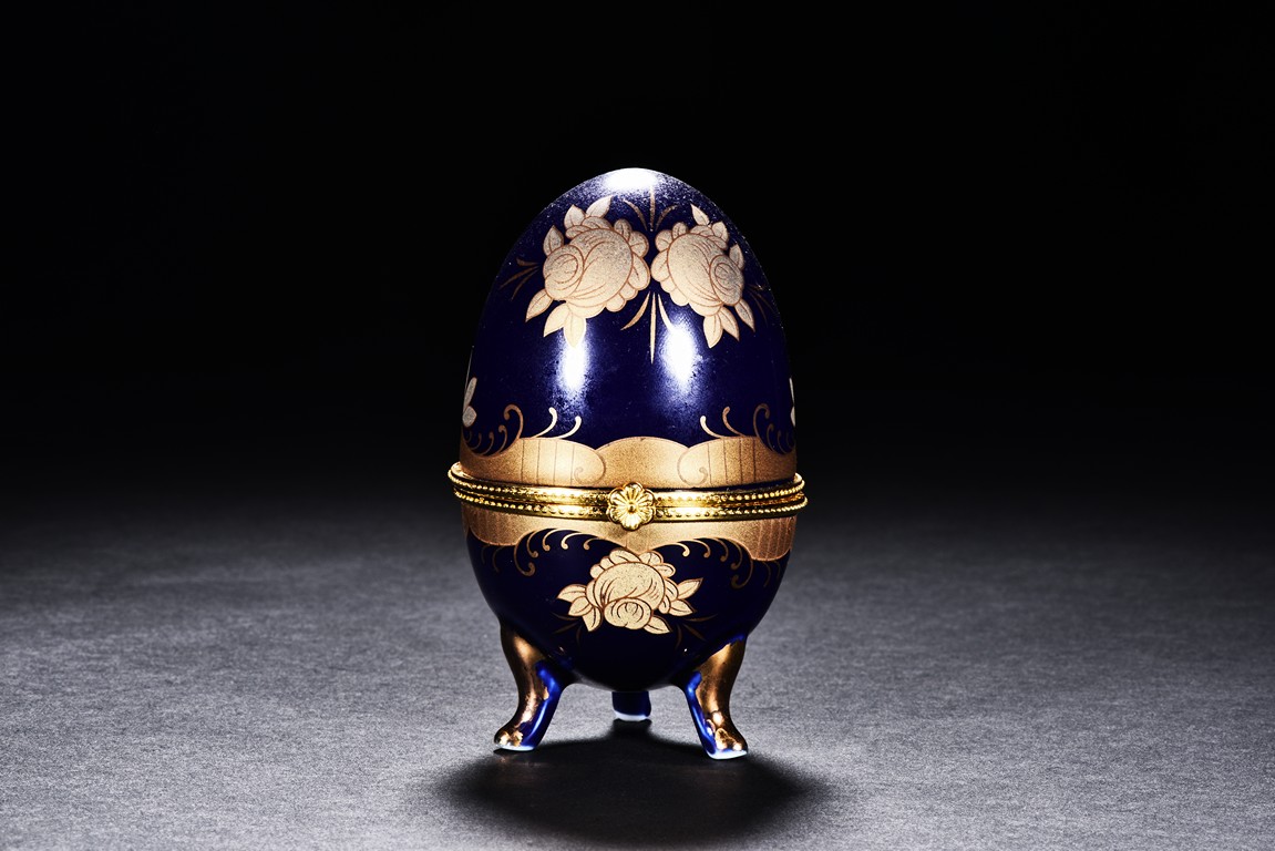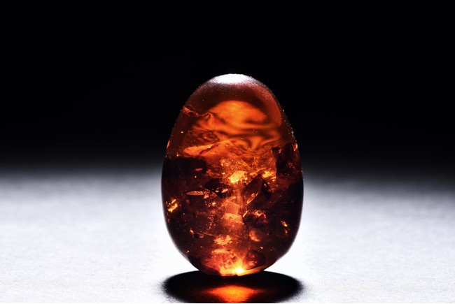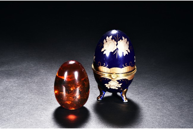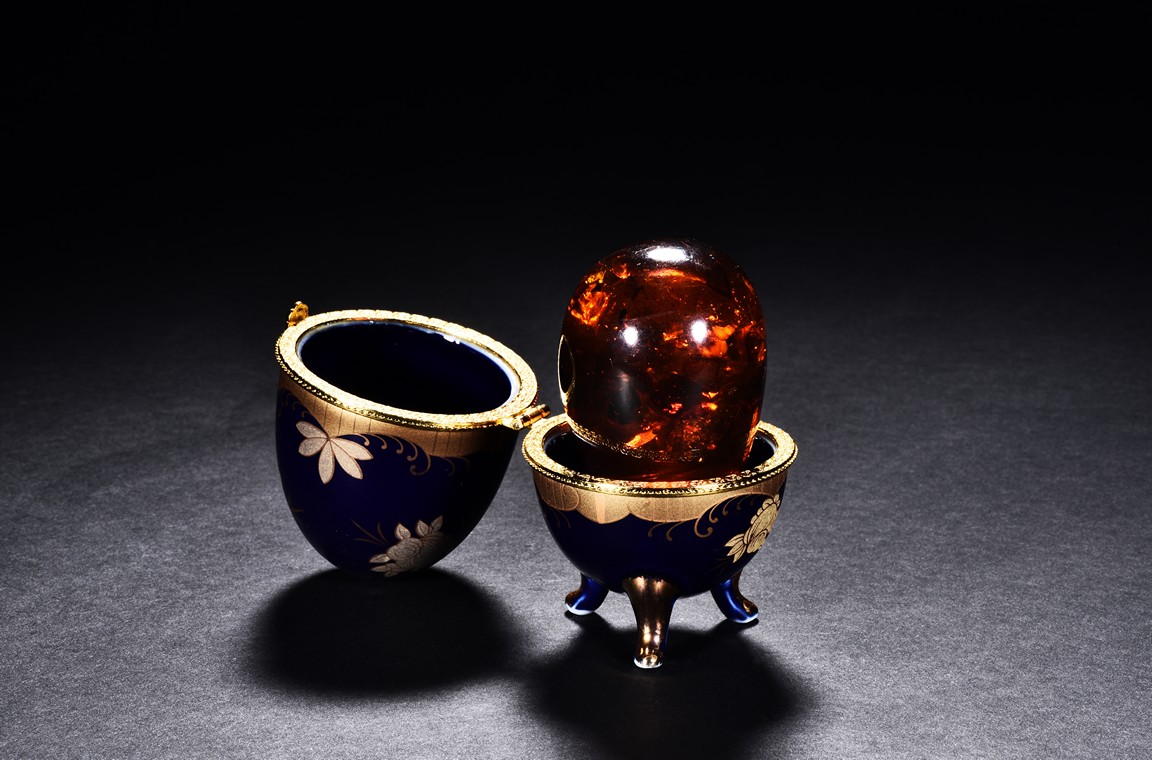 Amber-like or amber, modelled in the form of egg, of translucent caramel tone, accompanied with a cloisonne case.