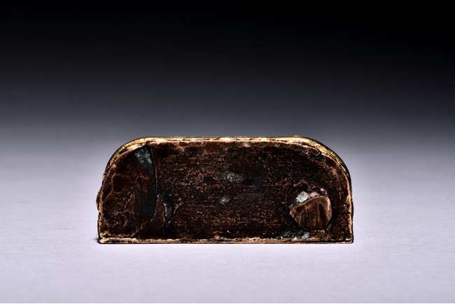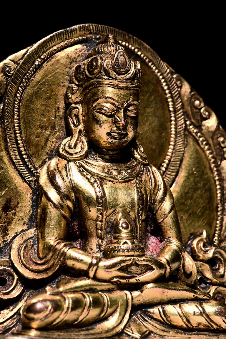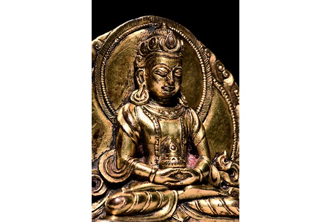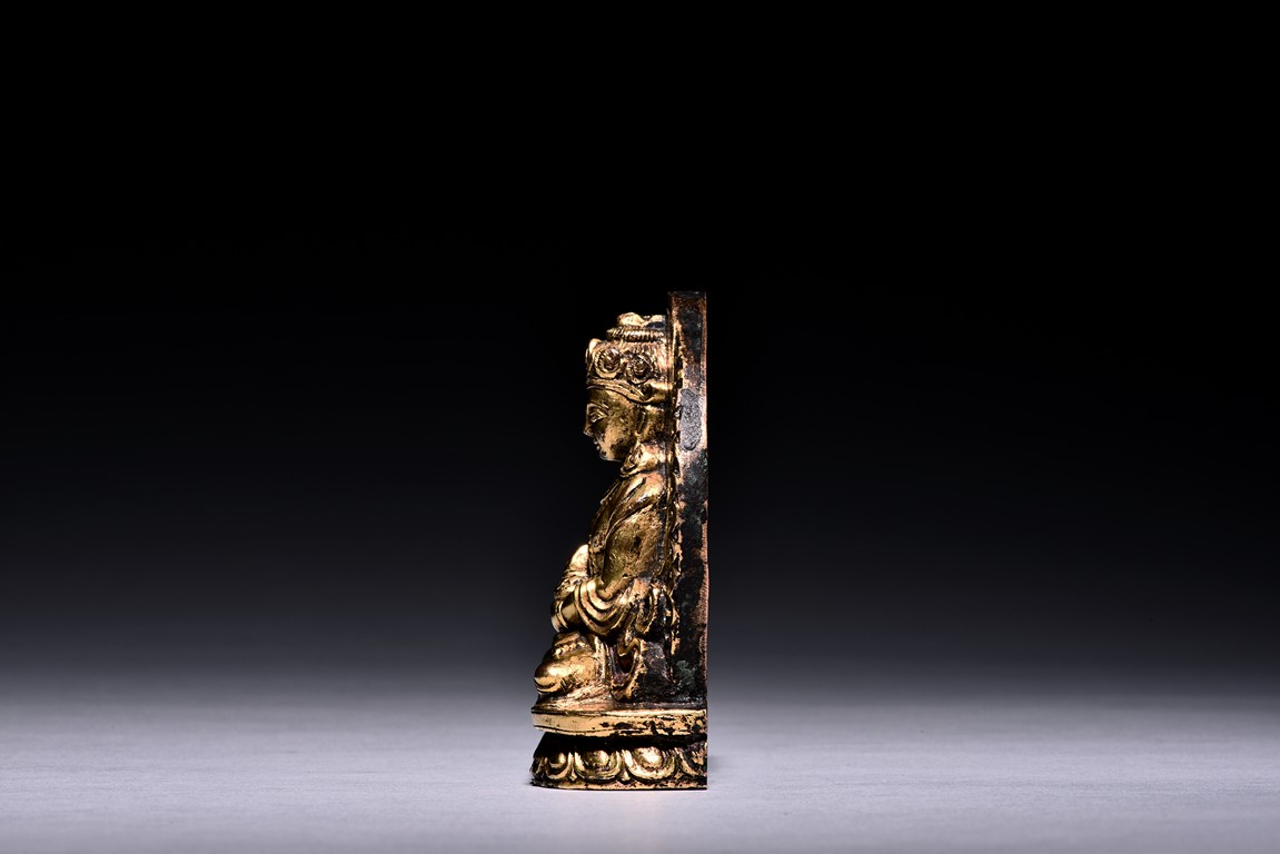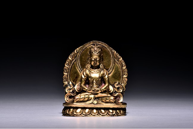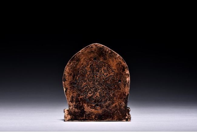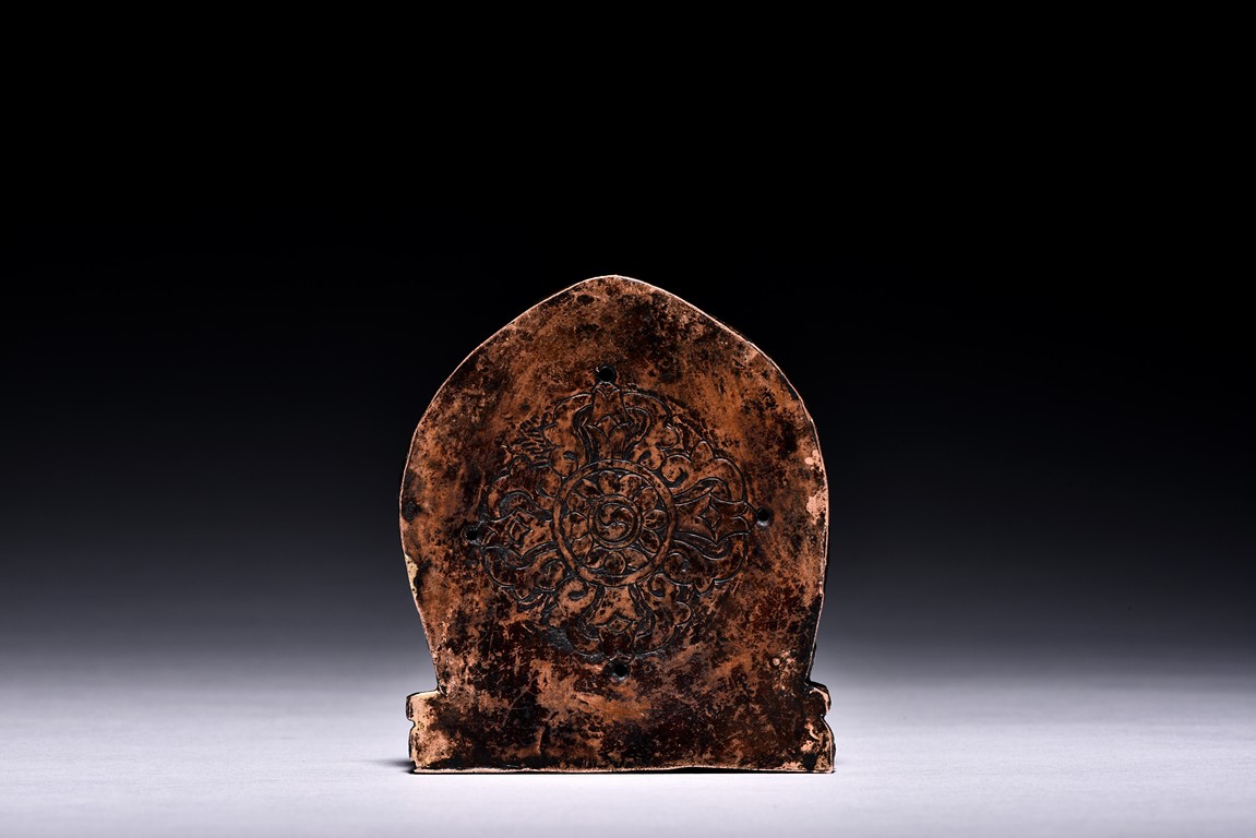 Shown seated on a lotus throne in vajrasana, both hands rested and holding alms bowl, wearing long robe, the face with meditative expression, backed by a large rounded mandorla, the back etched with a Buddhist symbol. Qing Dynasty period.