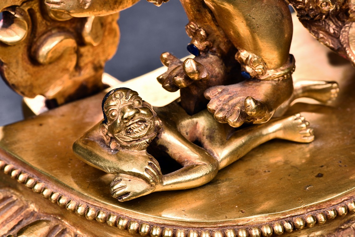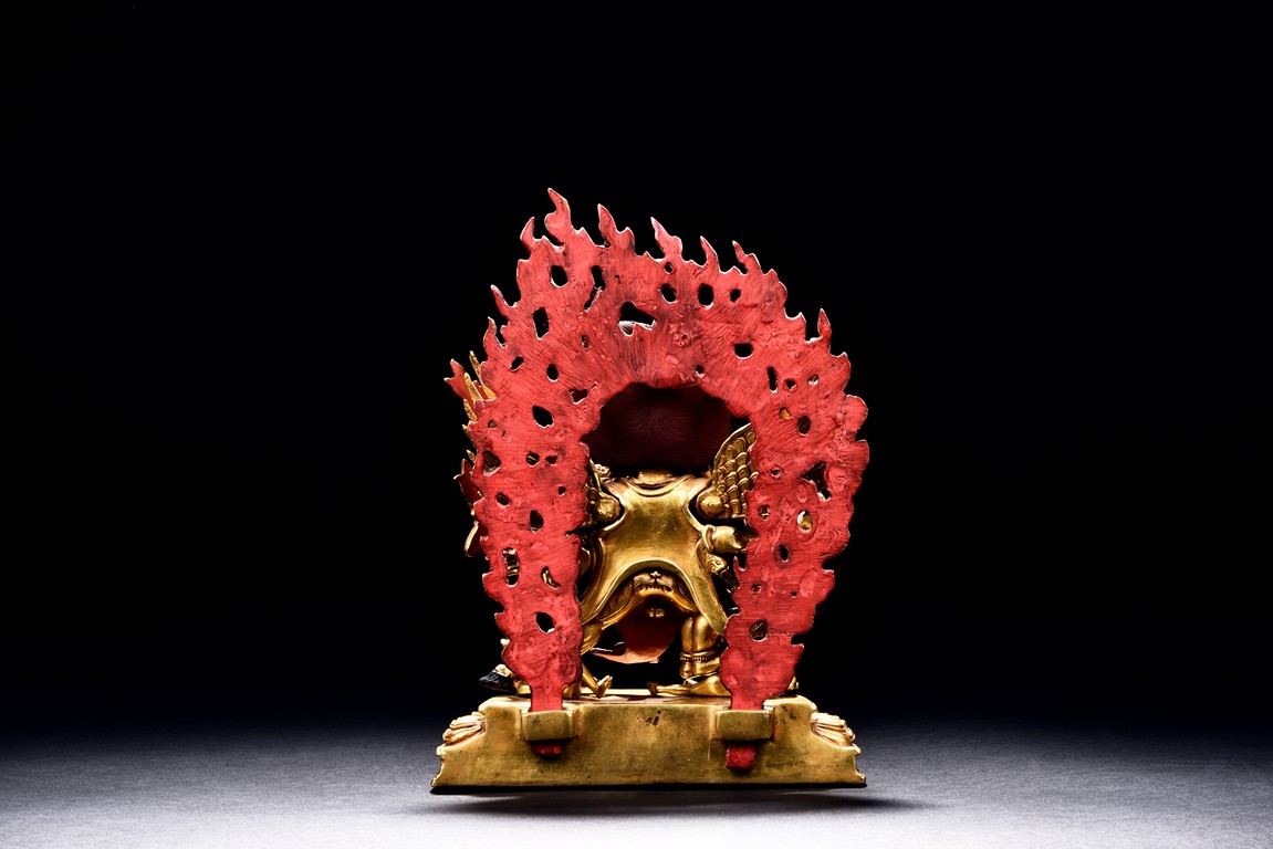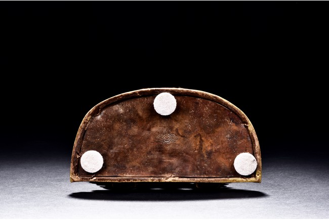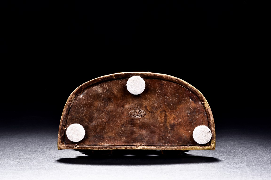 Of compressed globular form, the censer is cast with looped handles rising at an angle from the rim, raised on three short legs, the base of the censer bearing three character 'SHI GU ZHI BAO' mark in seal script, the surface wit brownish black patina. Qing Dynasty period.