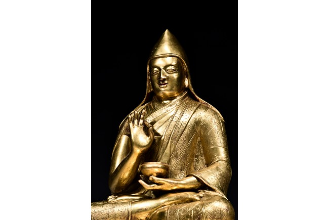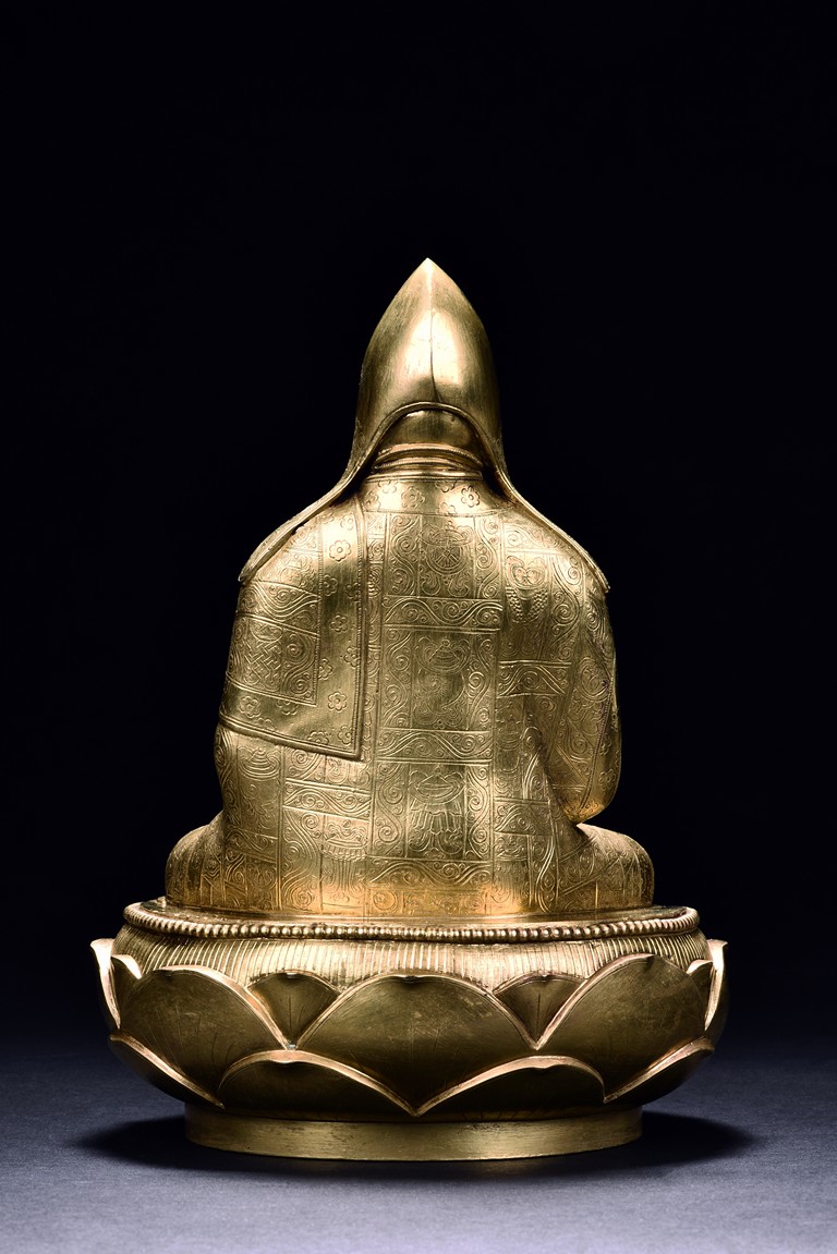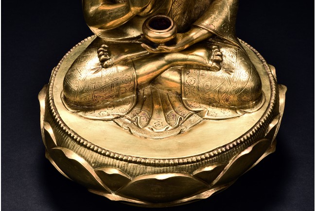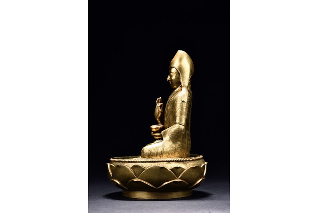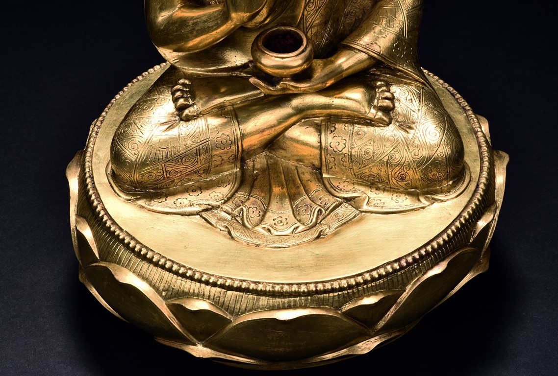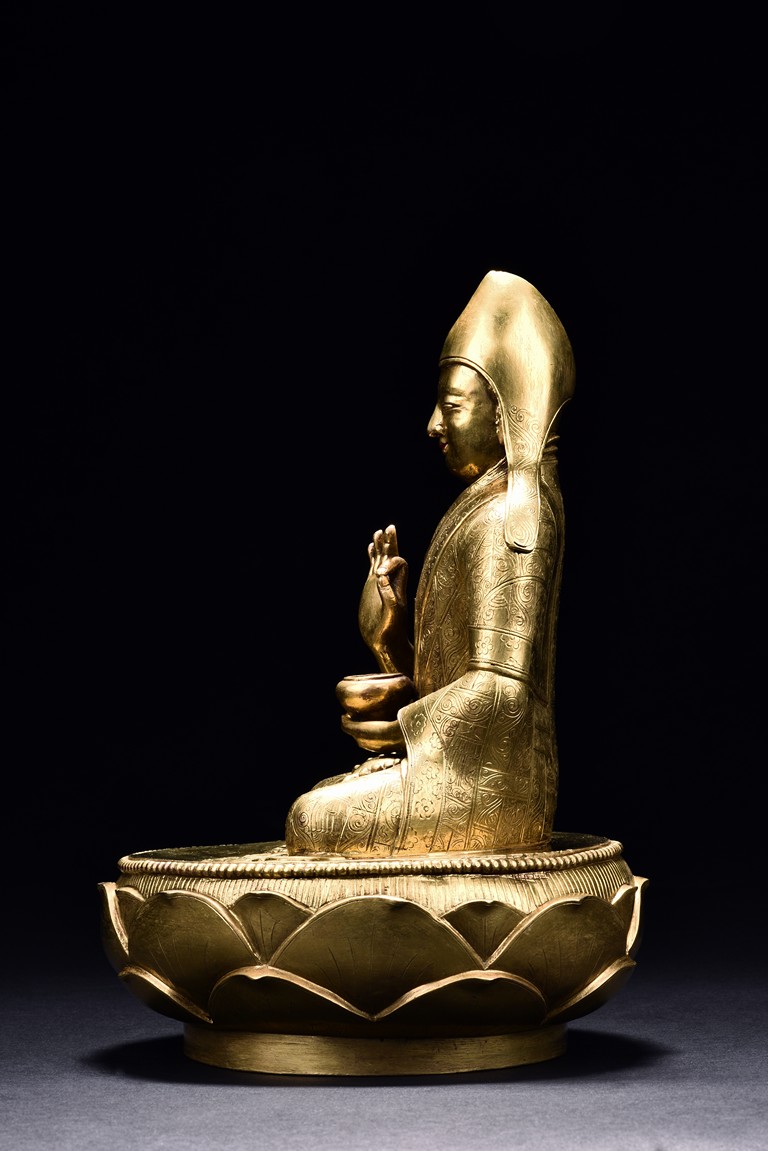 Zanabazar school. Mongolia. Powerfully and heavily cast, the figure is shown seated upon a circular lotus base throne, his right hand in vitarka mudra, left hand holding an alms bowl, dressed in heavy patchwork robes exquisitely incised with floral scroll pattern all over and wearing a conical hat, his face is shown with benign and serene expression, richly gilt overall. 18th Century.