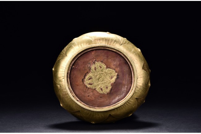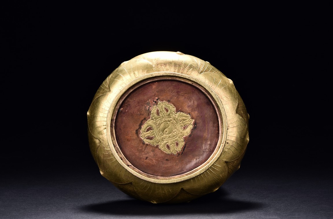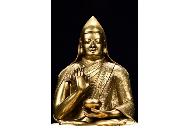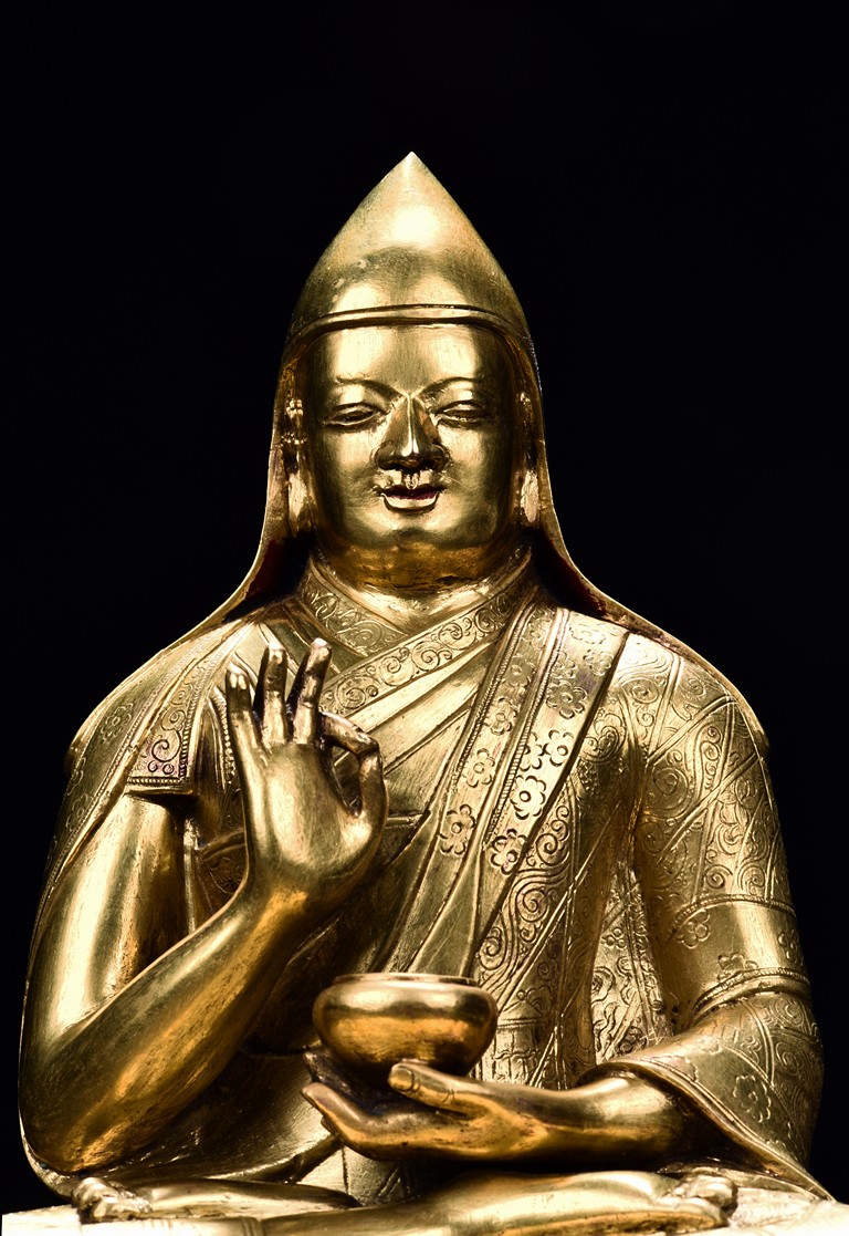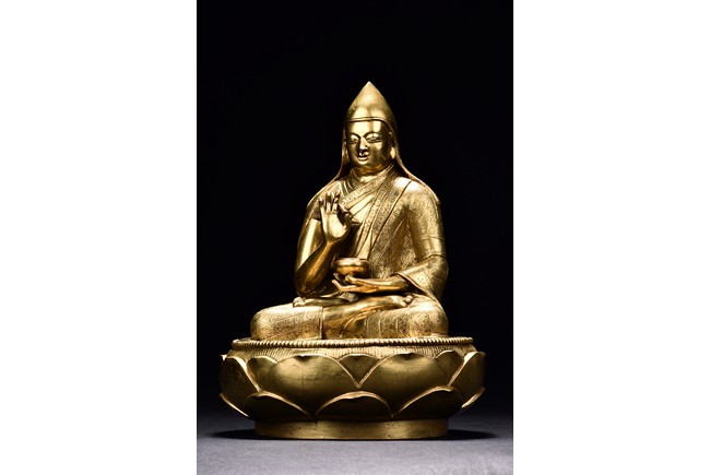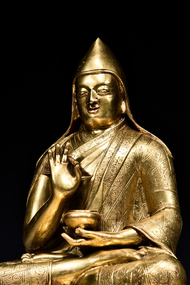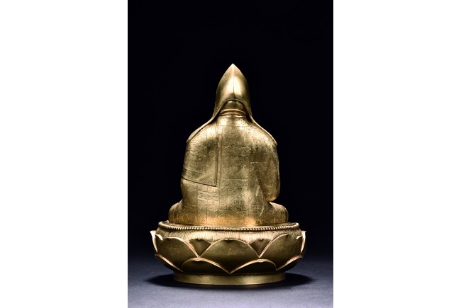 Zanabazar school. Mongolia. Powerfully and heavily cast, the figure is shown seated upon a circular lotus base throne, his right hand in vitarka mudra, left hand holding an alms bowl, dressed in heavy patchwork robes exquisitely incised with floral scroll pattern all over and wearing a conical hat, his face is shown with benign and serene expression, richly gilt overall. 18th Century.