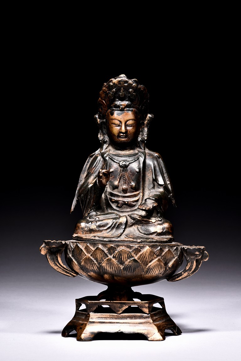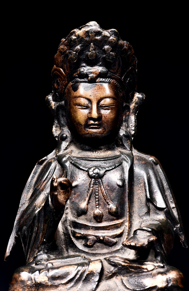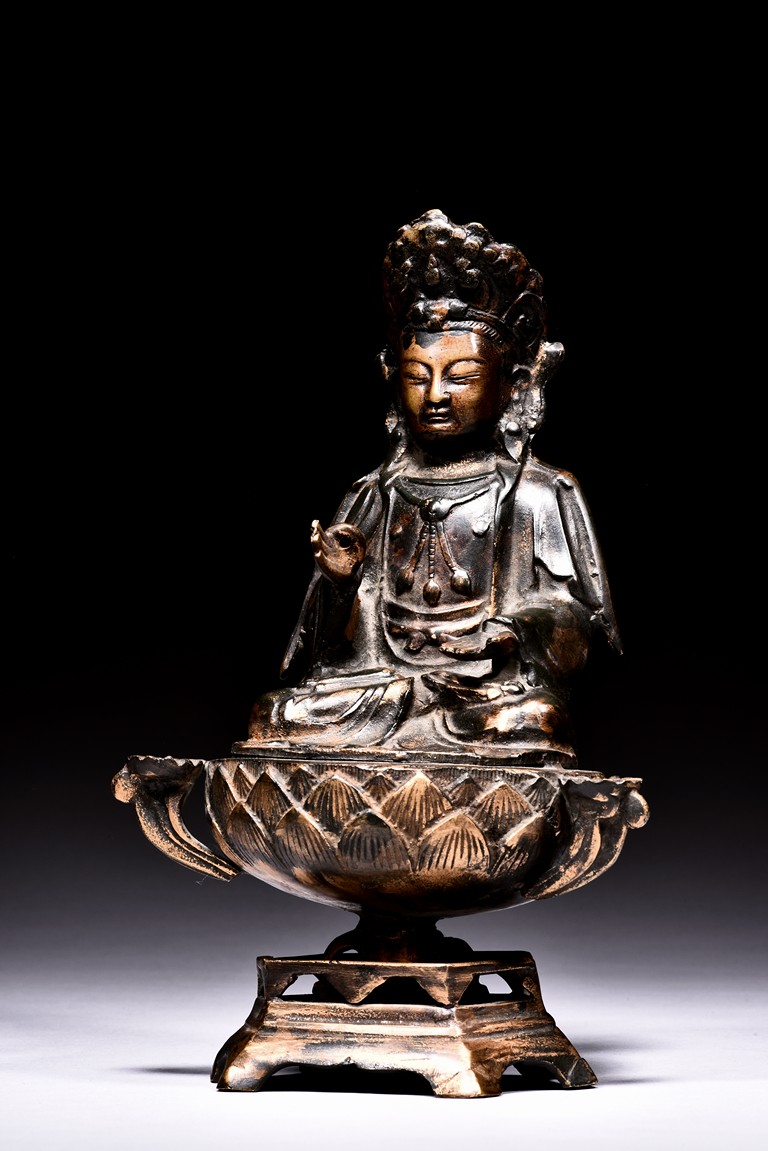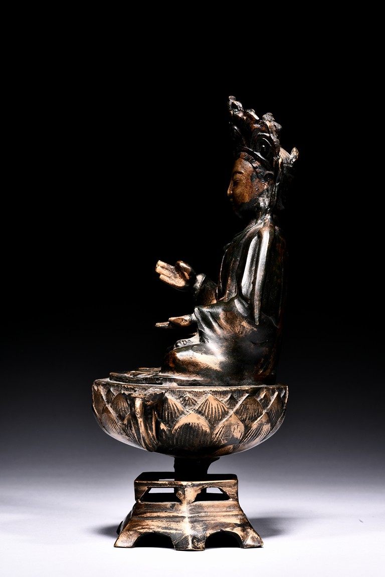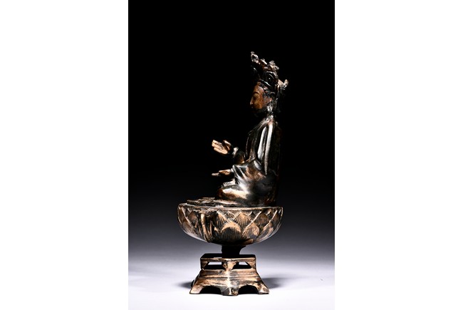 Shown seated on a lotus throne supported by a stand, the bodhisattva is shown in dhyanasana, hands in abhayamudra , wearing long and voluminous robe, chest adorned with beaded jewelery, the face shown in meditative expression, wearing a crown with a seated Amitabha at center. Qing Dynasty period.