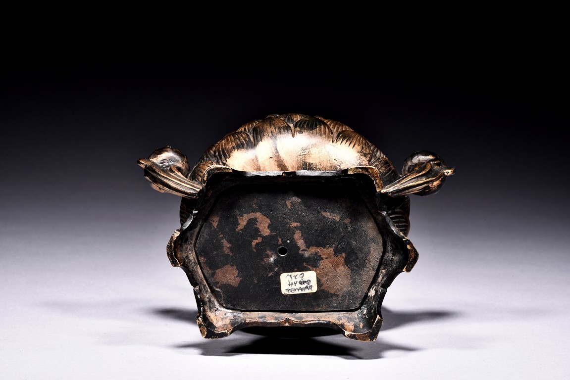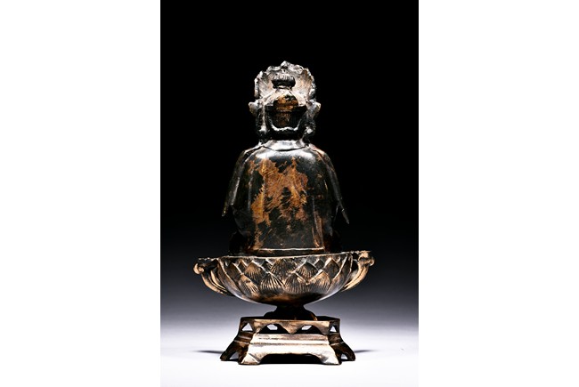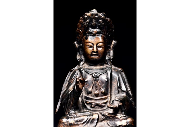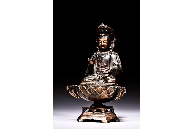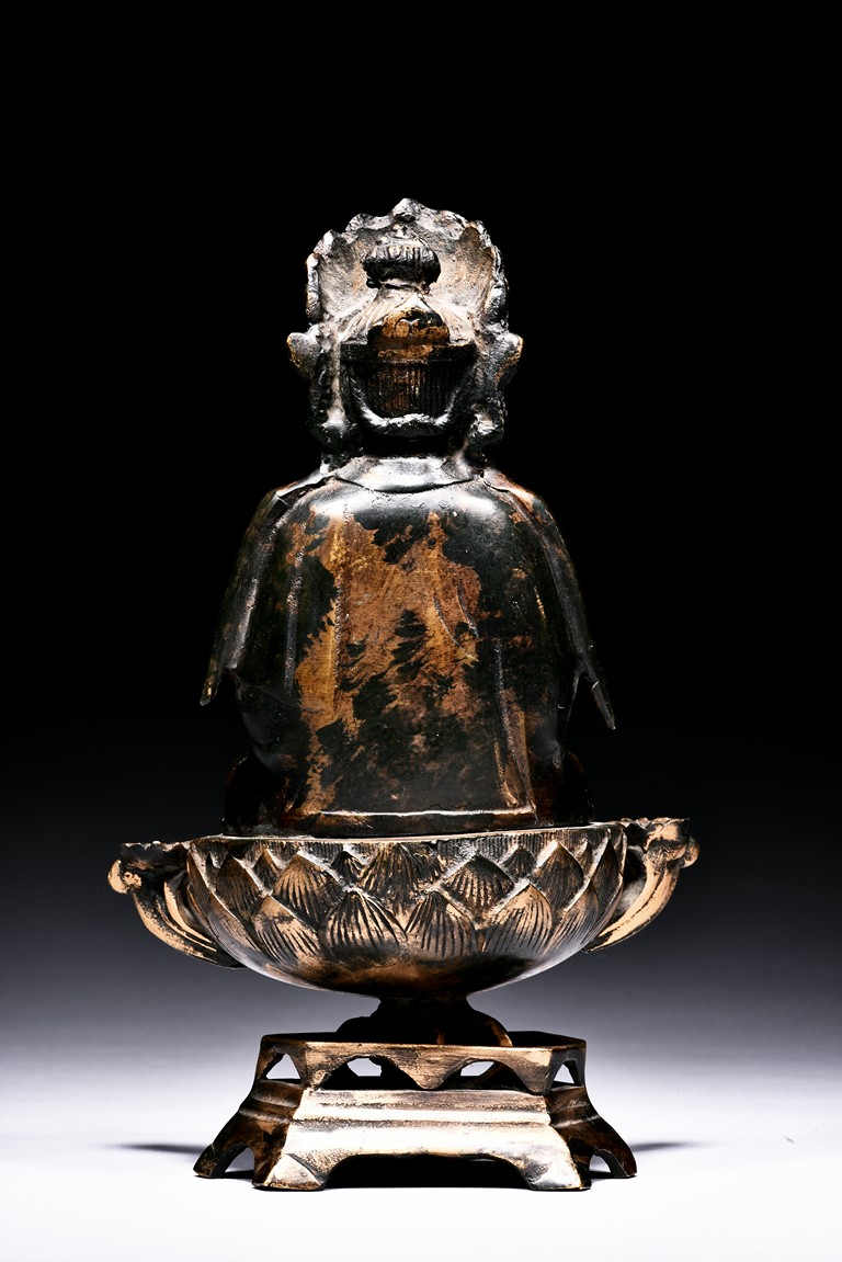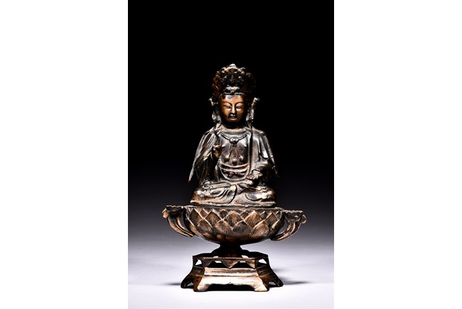 Shown seated on a lotus throne supported by a stand, the bodhisattva is shown in dhyanasana, hands in abhayamudra , wearing long and voluminous robe, chest adorned with beaded jewelery, the face shown in meditative expression, wearing a crown with a seated Amitabha at center. Qing Dynasty period.