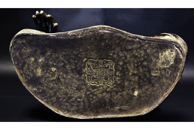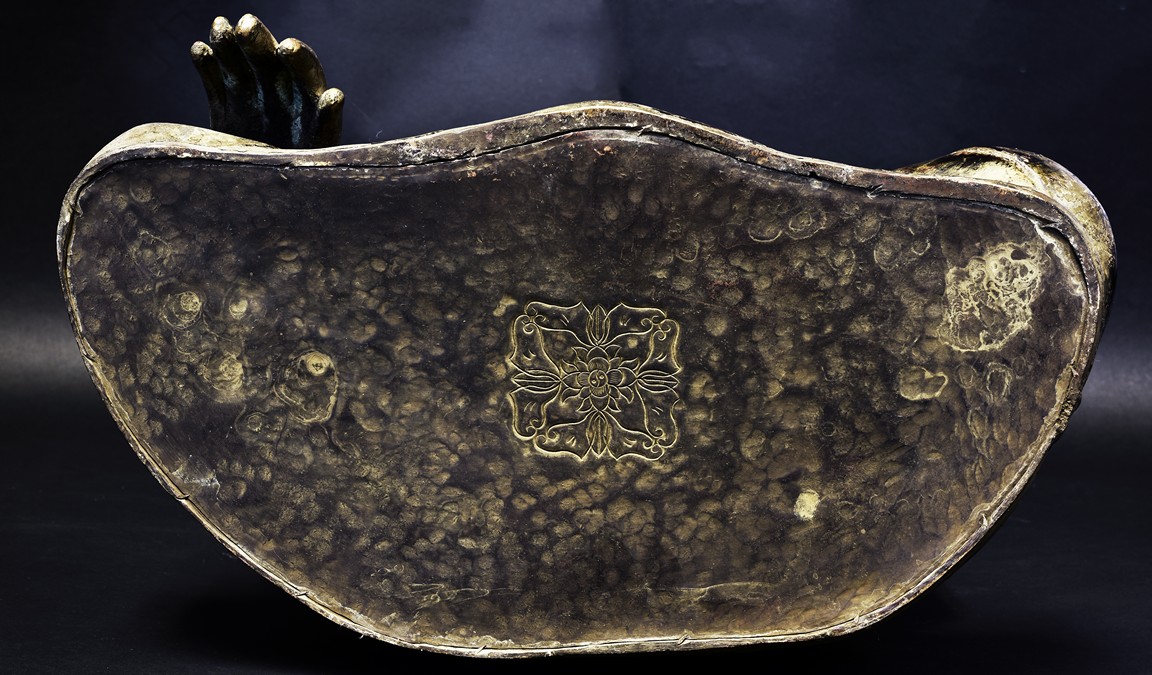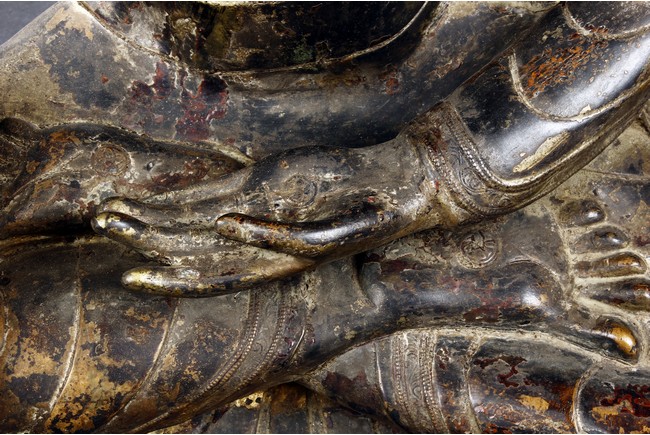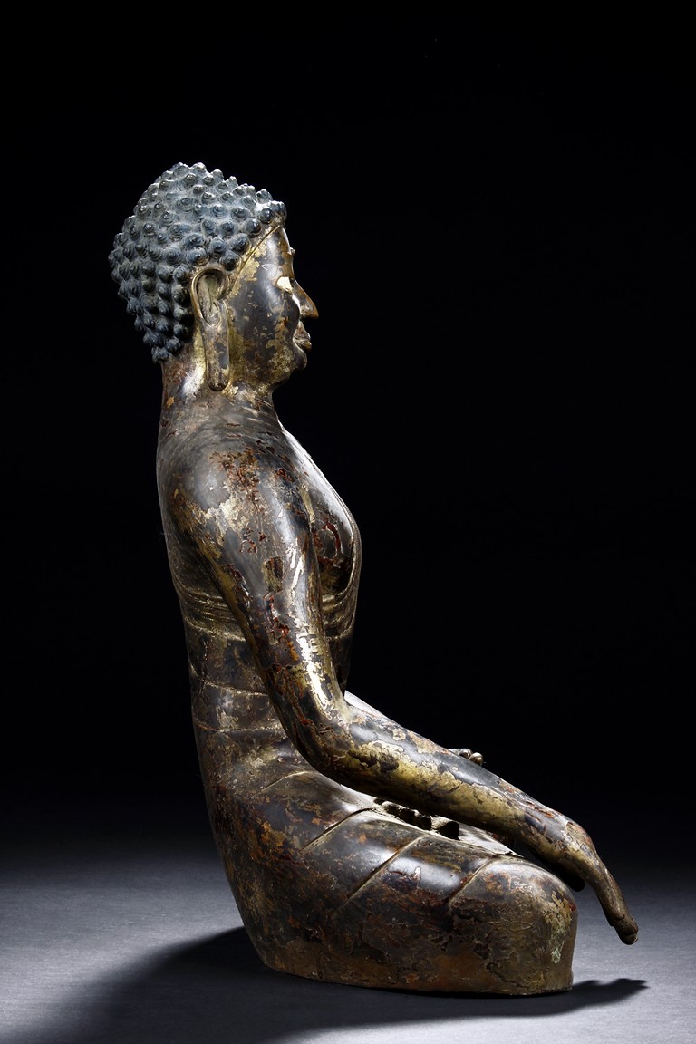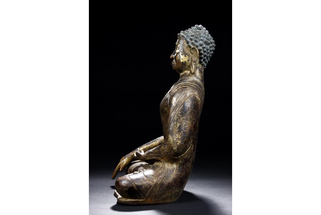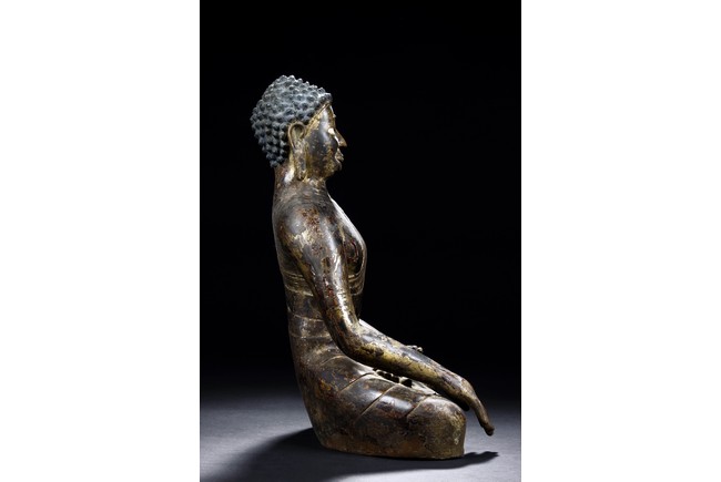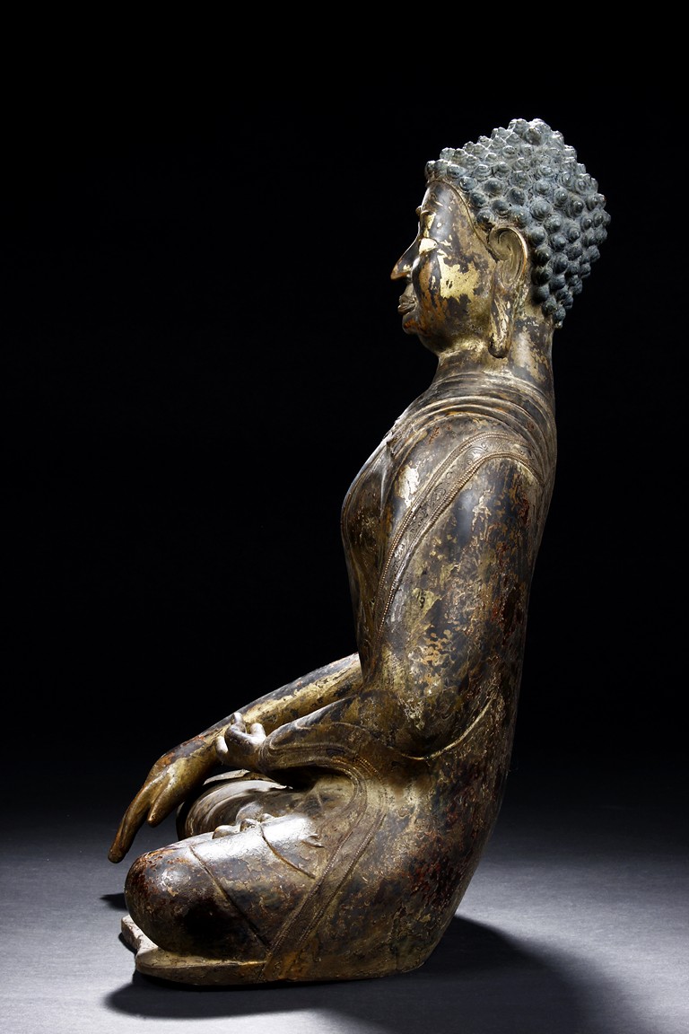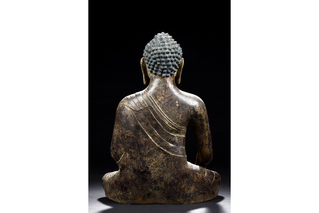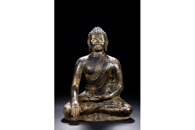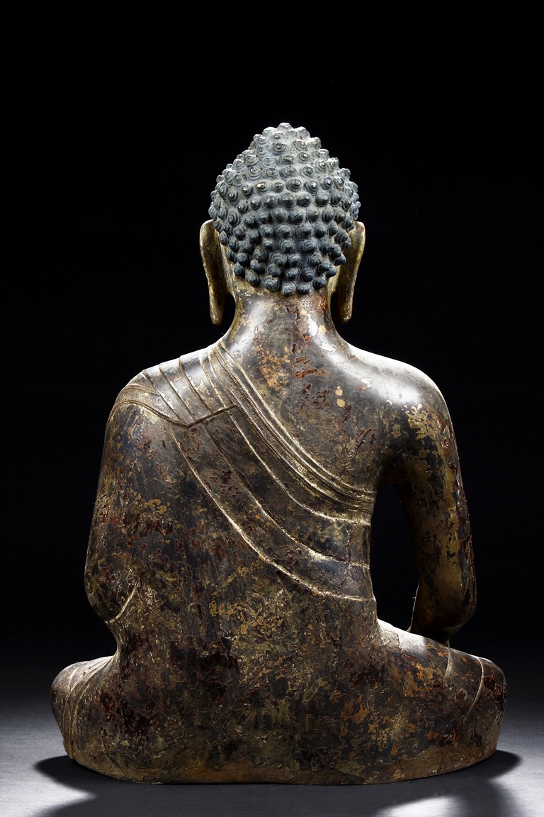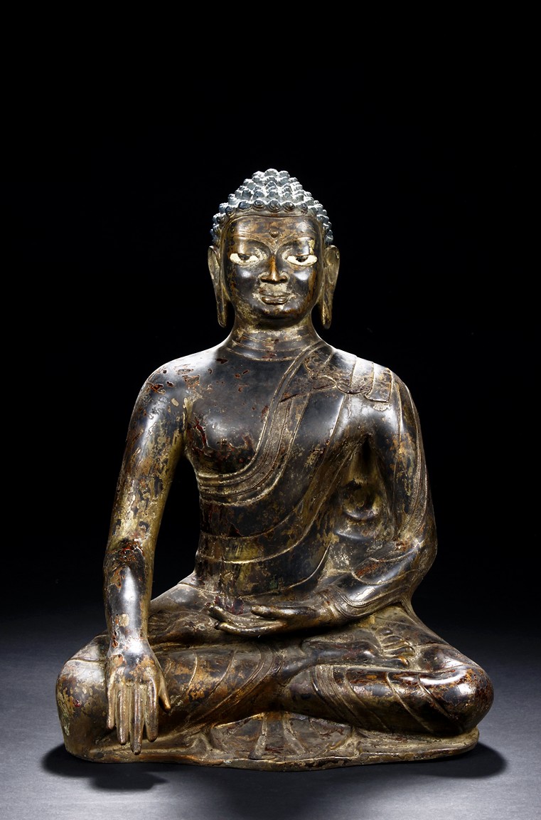 Seated in vajrasana, his right hand rests on the leg and left hand as if holding a bowl, wearing a loose robe with incised hem, the face shown with a meditative expression, the head surmounted with a blue colored ushnisha.15/16th Century.