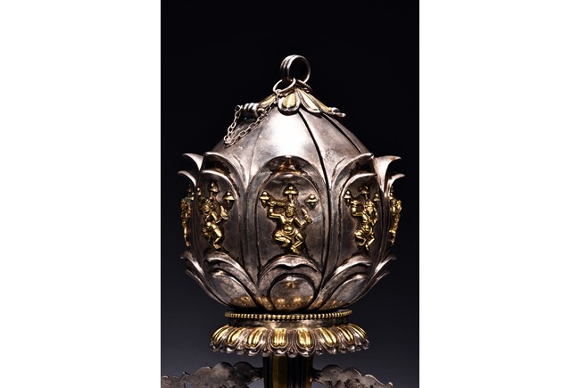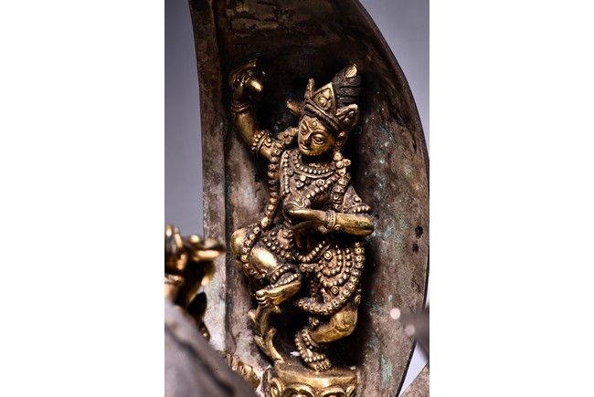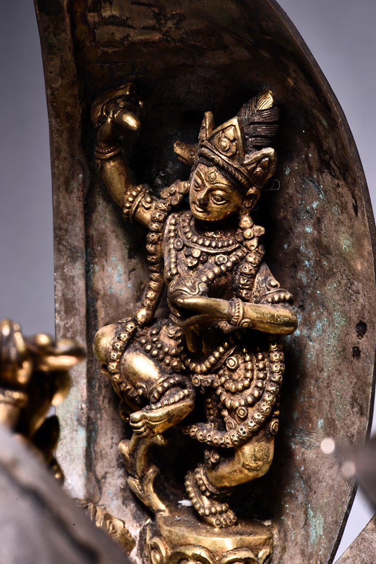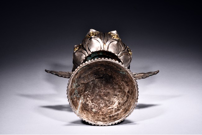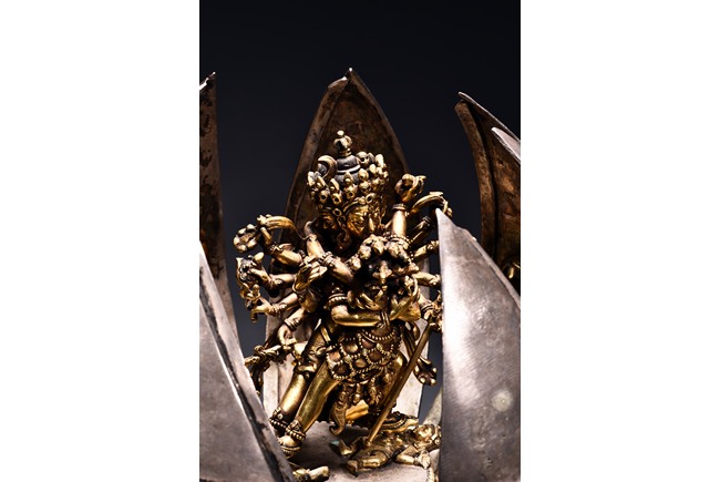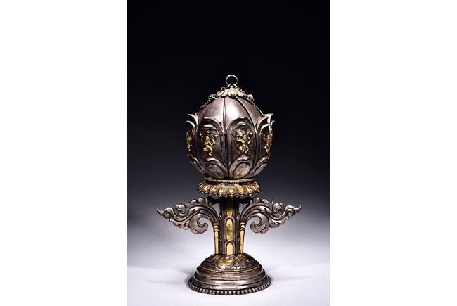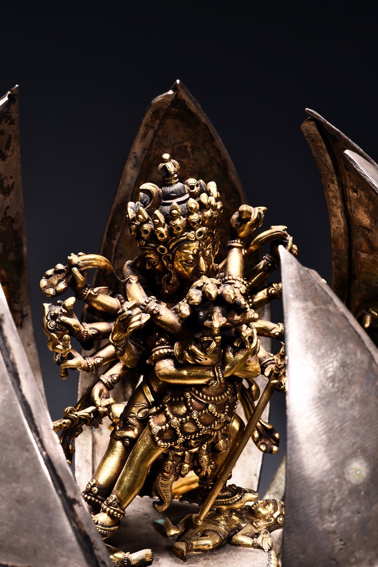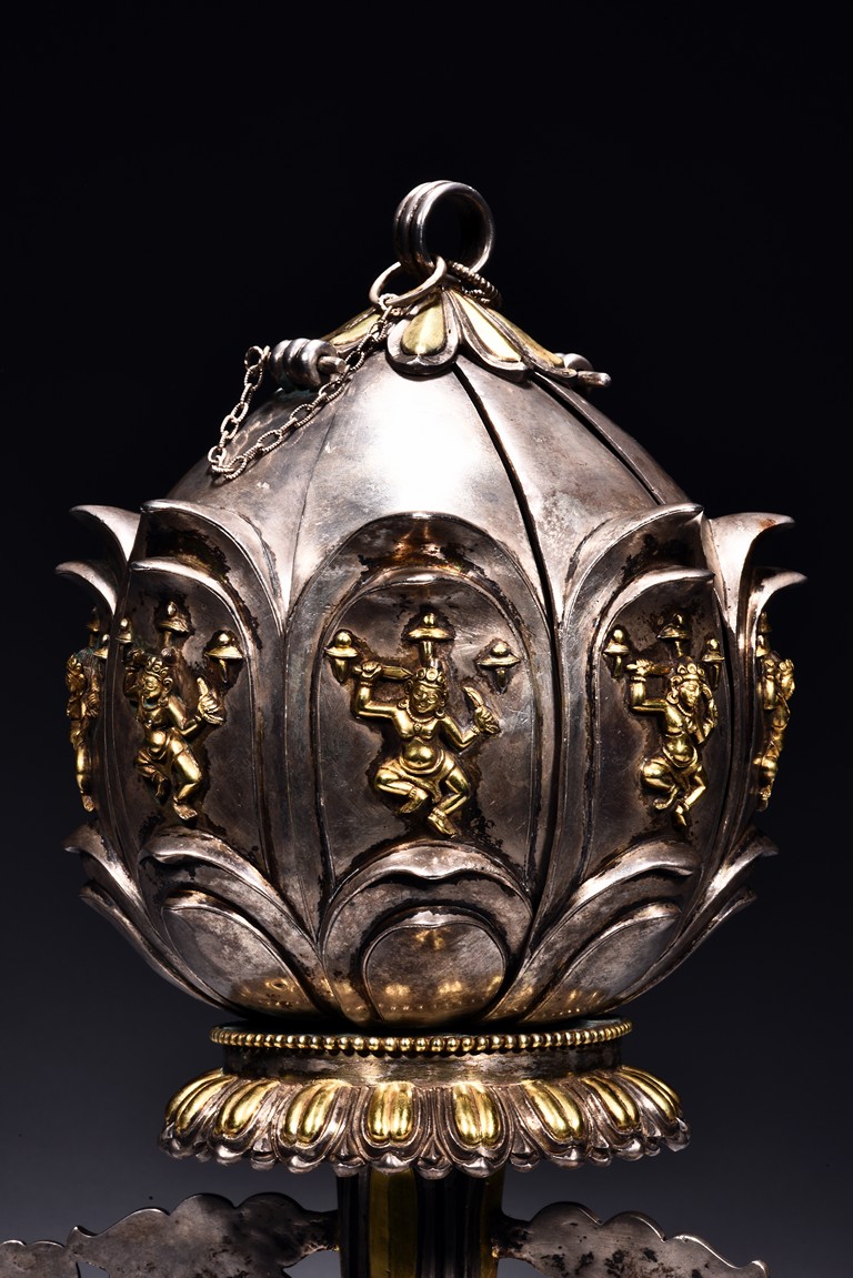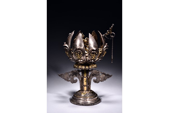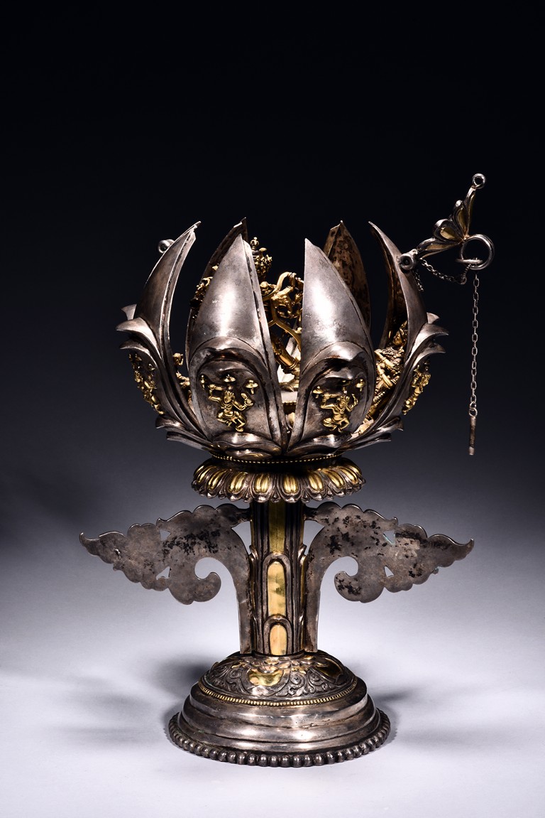 Modelled in the form of lotus blossom bud, it raises from a scrolled foliate pedestal stand, the stem flanked by two scrolled handles, with eight silver layered petals open to reveal the interior with eight gilt bronze figures Vajrayogini, with the ten-armed Cakrasamvara at the center, the exterior of the petal decorated with bodhisattva in relief. Qing Dynasty period.