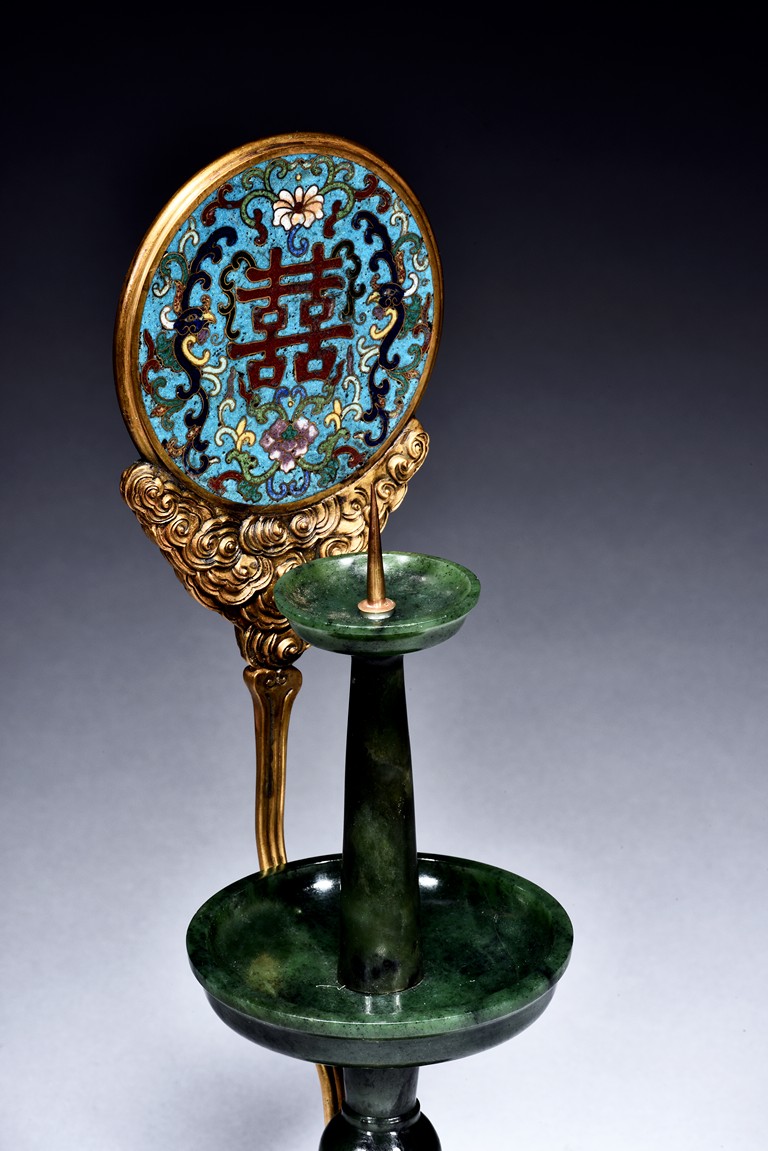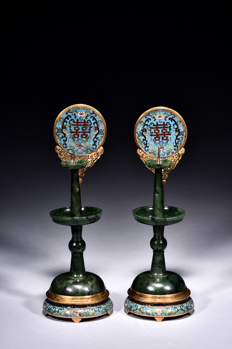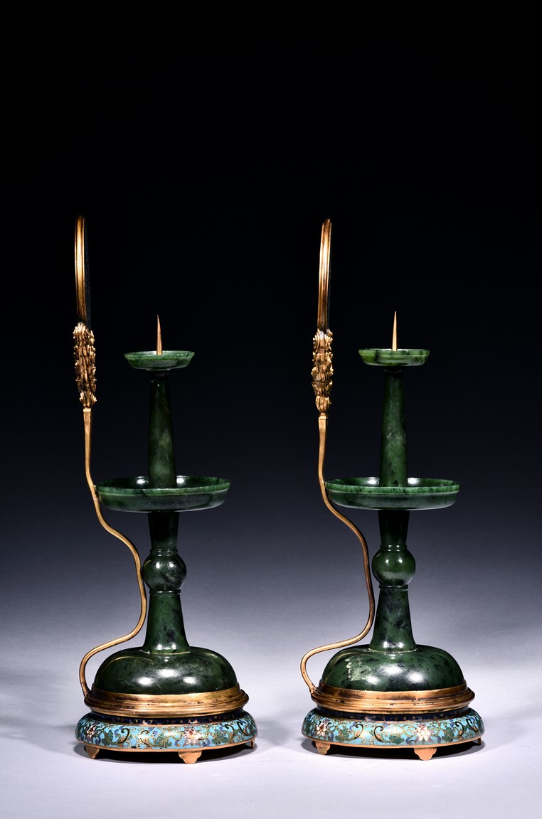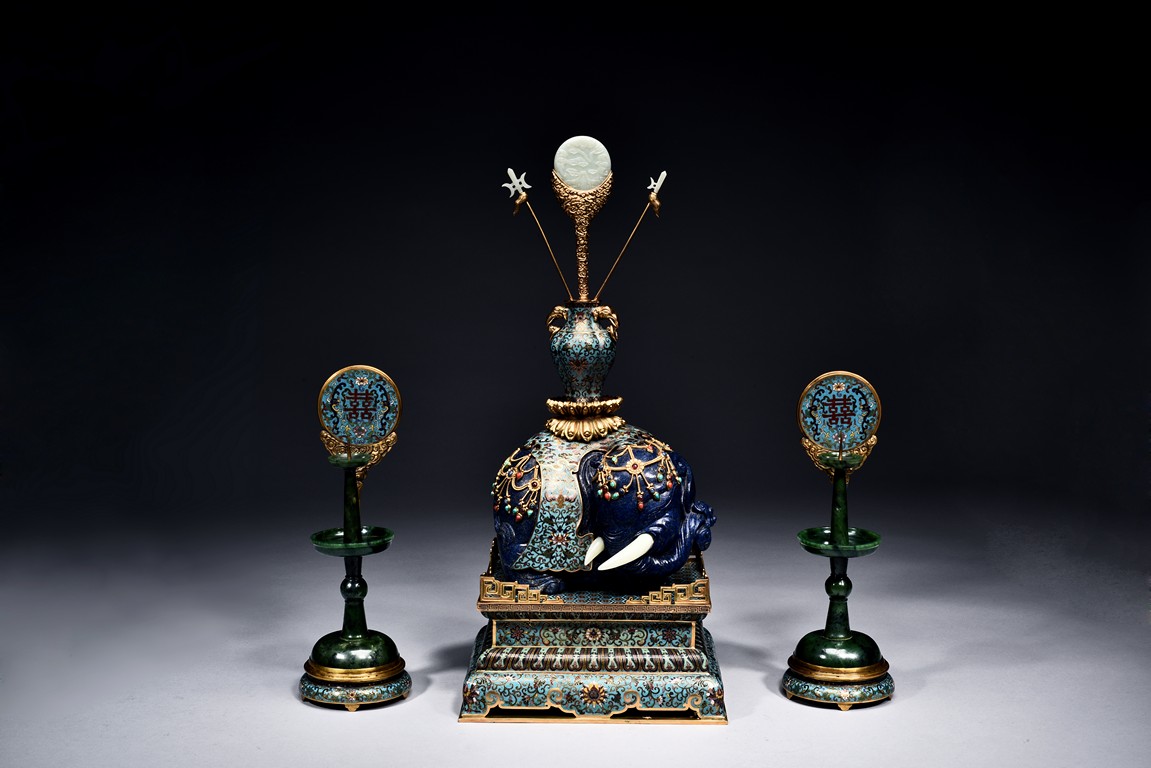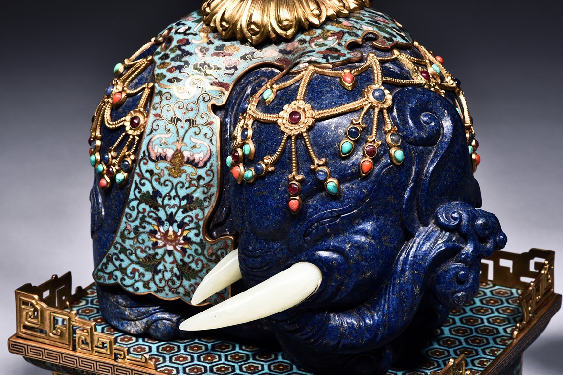 此件應是供器,身姿沉穩,氣勢雄偉,造型恢弘大氣,四足直立,長鼻卷曲,神態憨厚,以青金石制作,通體鑲紅寶,綠松石,紅珊瑚,碧璽,翡翠,白玉等。寶像下承琺琅須彌座。整體造型仍以華貴見長,工藝繁縟,制作精細,栩栩如生。另配碧玉燭台一對,寓意吉祥。