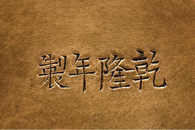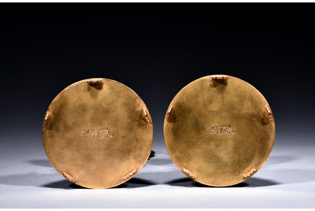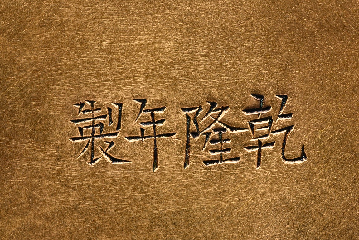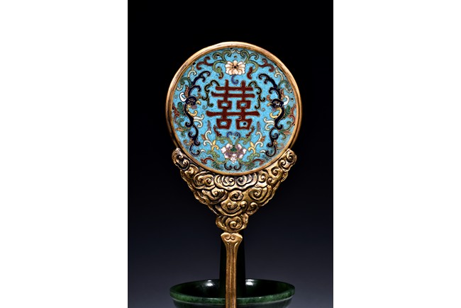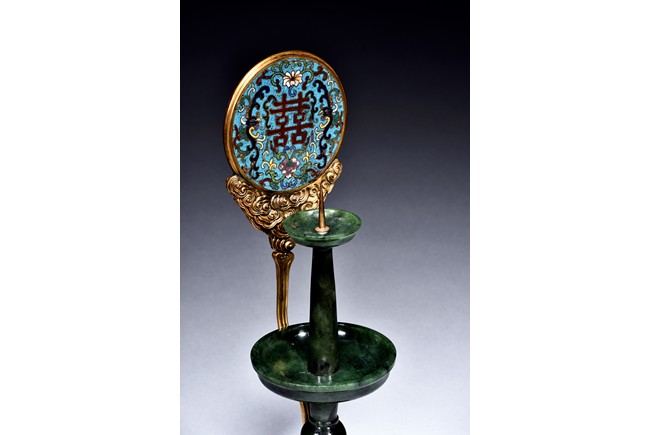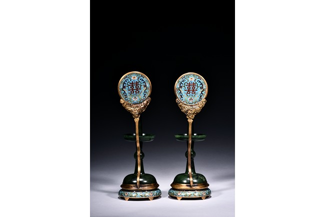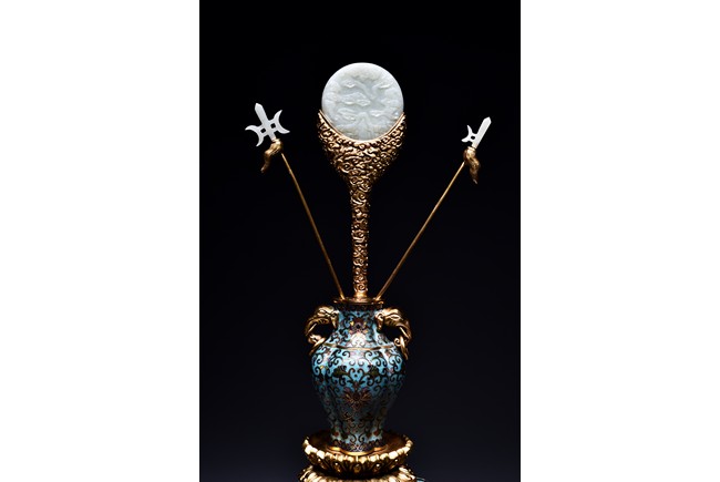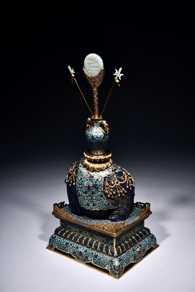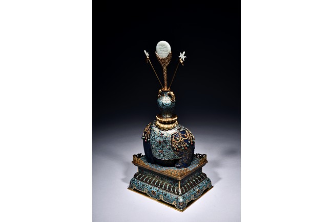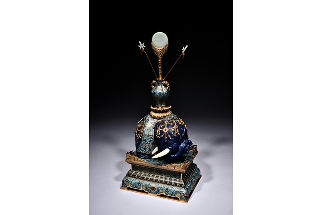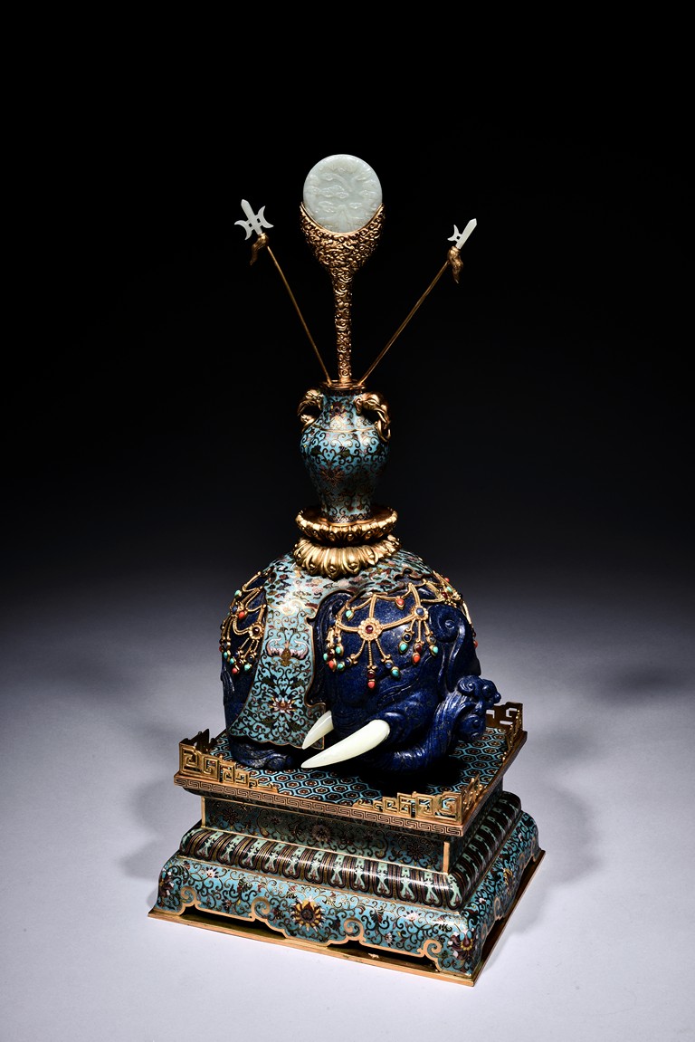 Shown in standing position with head turned to the side, with white jade forward stretching tusks, the head embellished with various gem beads including turquoise, coral, and ruby; the body fitted with cloisonne enamel saddle with fine intertwining lotus, auspicious bats, and clouds motifs, the back surmounted with a double lotus throne supporting a floriform formed vase flanked by two elephant handles with suspending rings, containing two white jade ‘Ji' and a circular white jade disc carved with bats, mountains and seas. The rectangular sectioned base is finely enamelled with hexagonal motifs, scrolling lotus, and single lotus leaves. The bottom bears a six character 'Qianlong' mark in gilt. Qing Dynasty period.