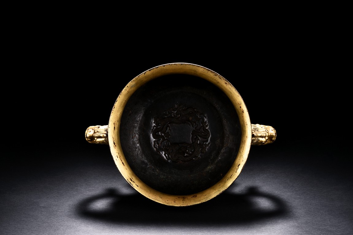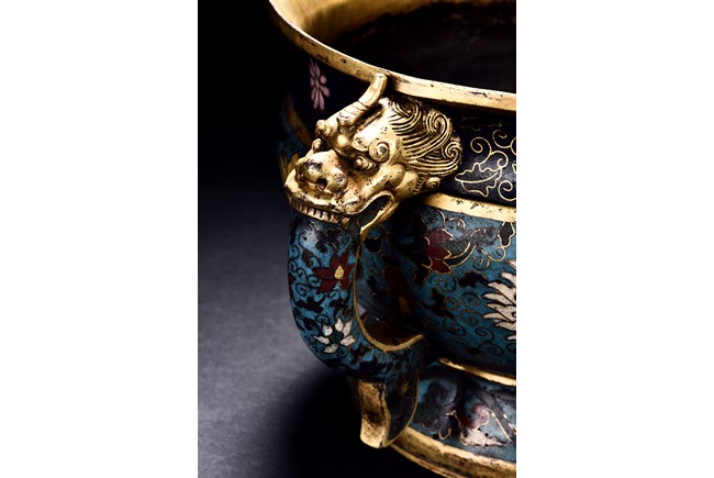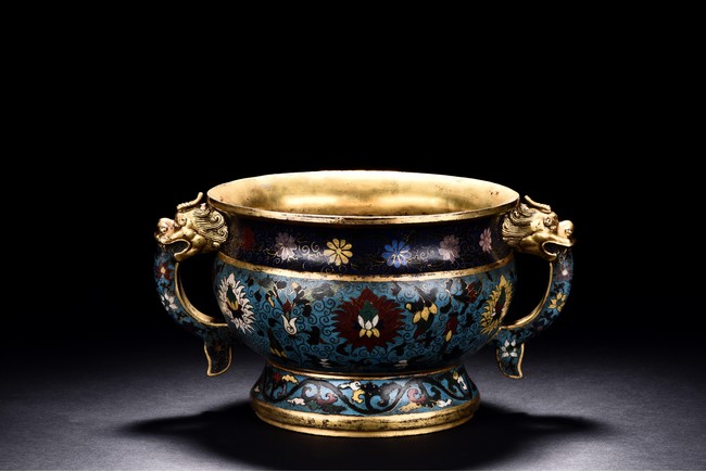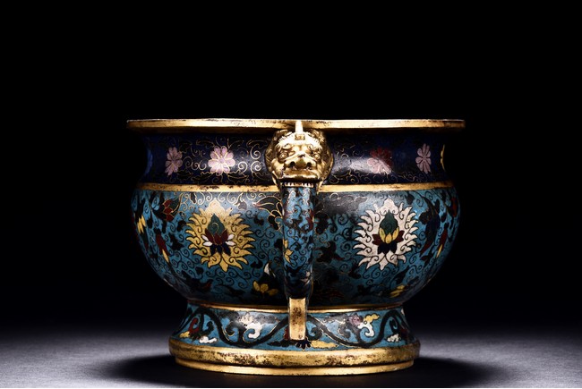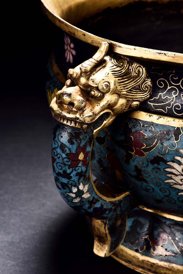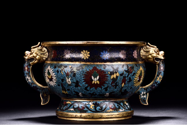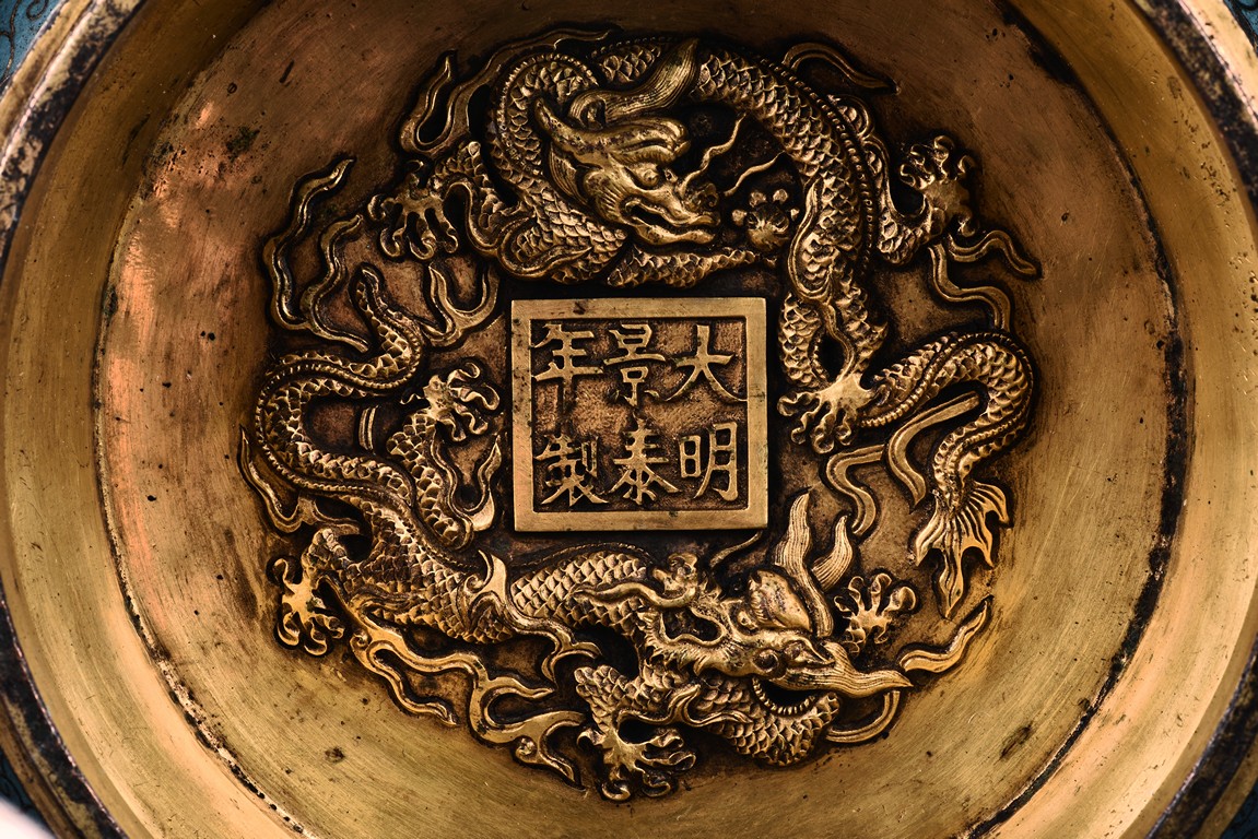 Of bombe form and with flared rim, the censer raises on a spreading foot, the body decorated with peony scrolls around the exterior against turquoise ground, flanked by a pair of elaborately cast dragon head handles, the base cast with a six character 'JINGTAI' mark flanked by two dragons.