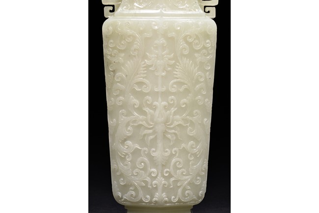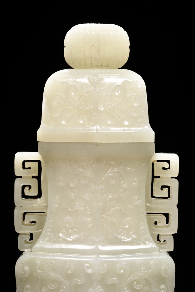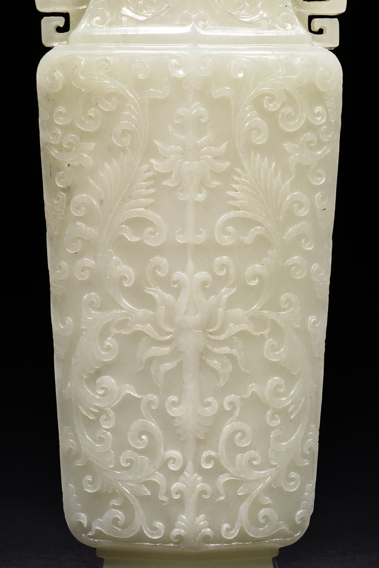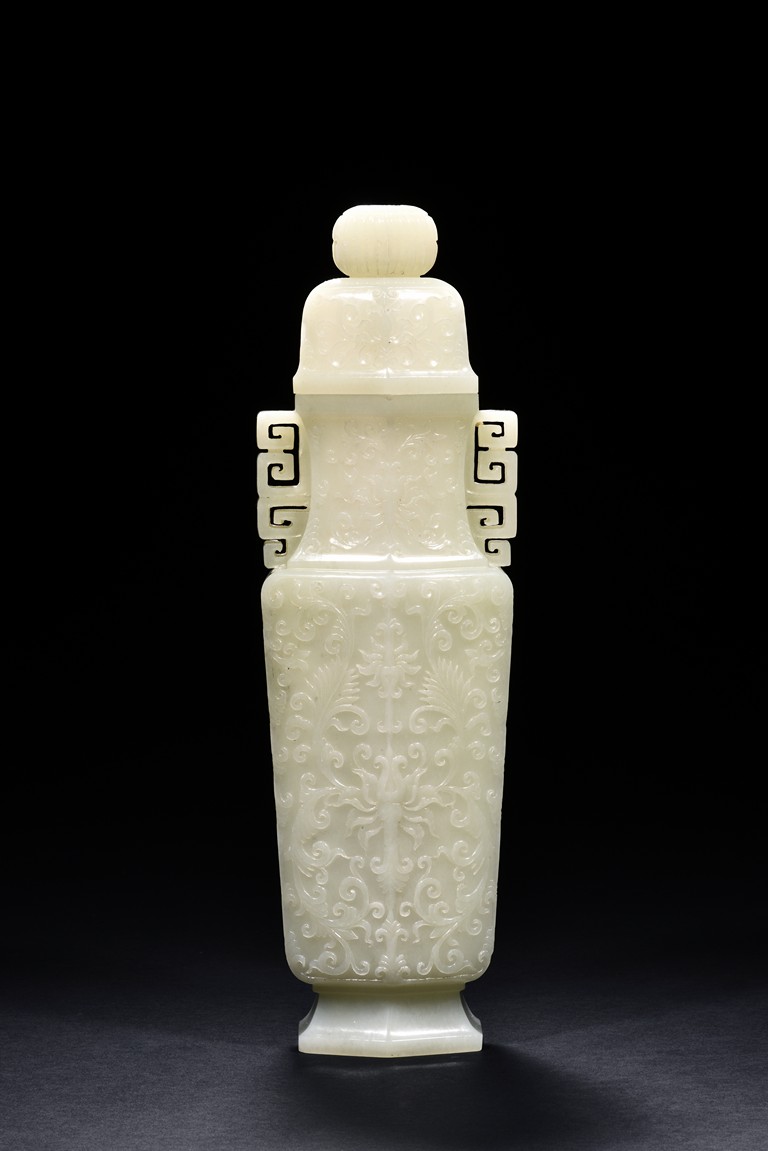 Of tall baluster form and lozenge section, the body finely decorated in relief with scrolling foliate pattern in exquisite details, rising to a waisted neck flanked with scroll handles, all supported on a spreading foot. The cover further repeated with floral pattern and surmounted with a knop finial with chrysanthemum design. Qing Dynasty period.