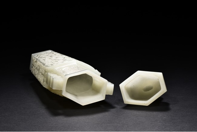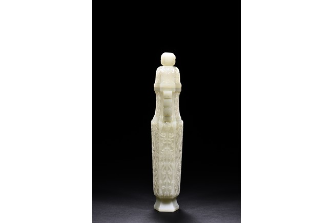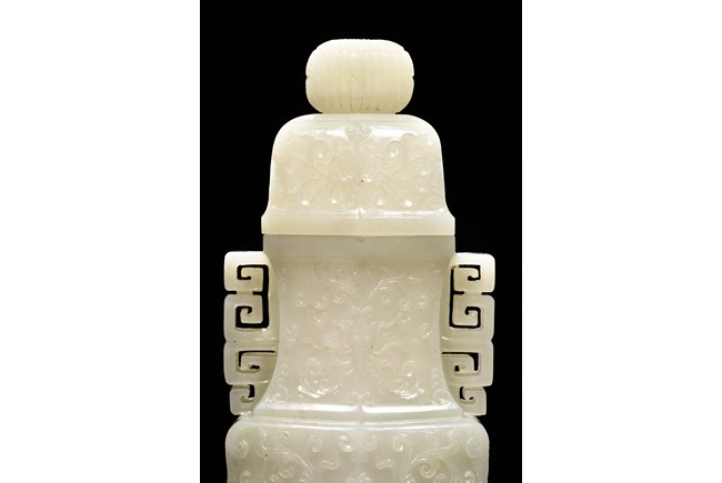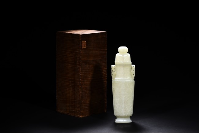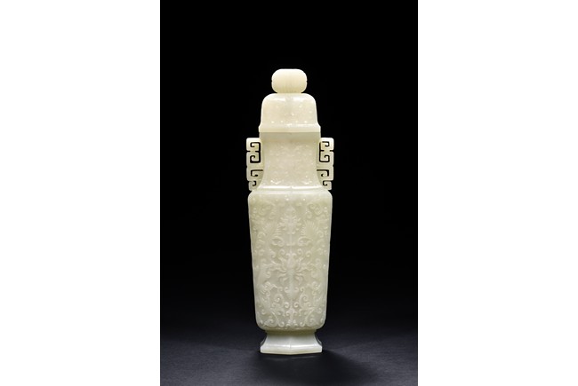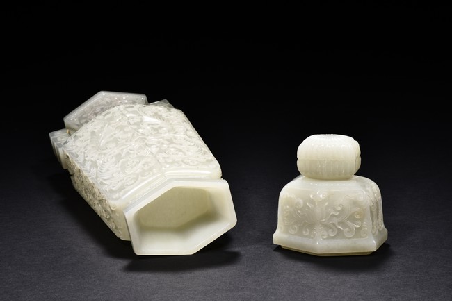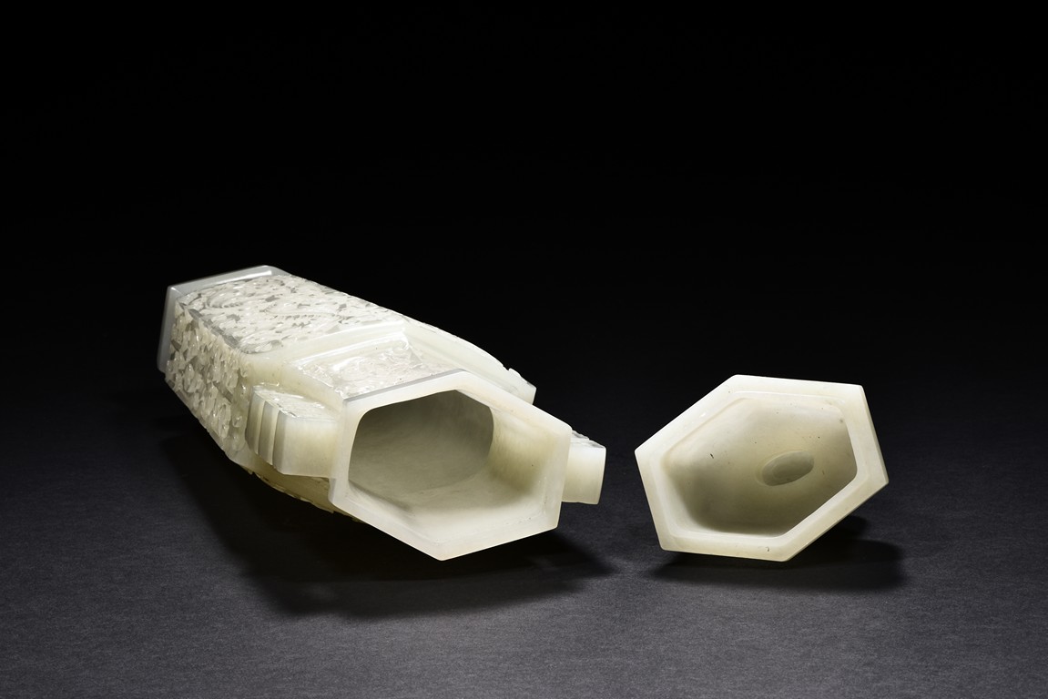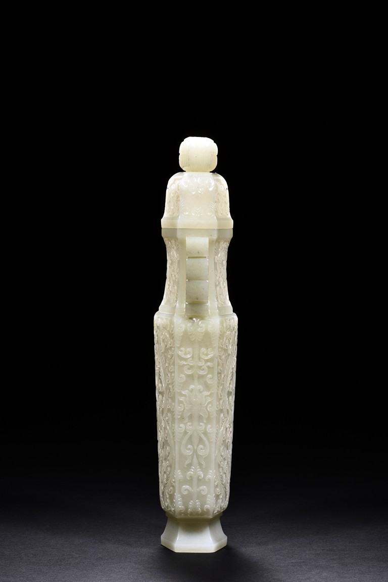 Of tall baluster form and lozenge section, the body finely decorated in relief with scrolling foliate pattern in exquisite details, rising to a waisted neck flanked with scroll handles, all supported on a spreading foot. The cover further repeated with floral pattern and surmounted with a knop finial with chrysanthemum design. Qing Dynasty period.