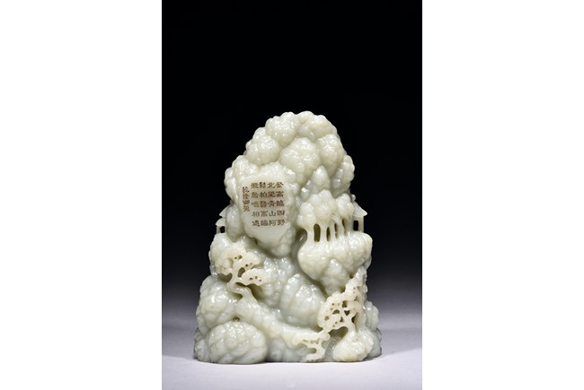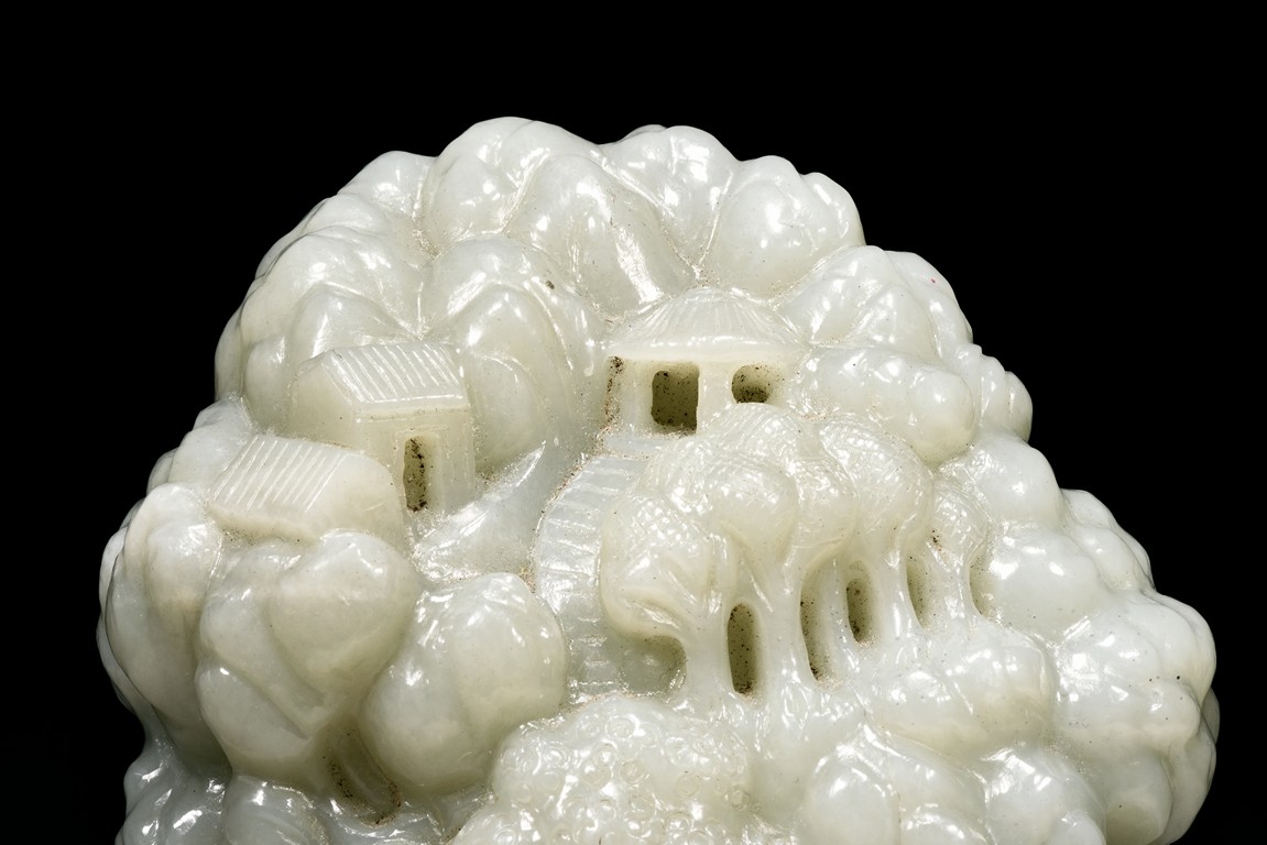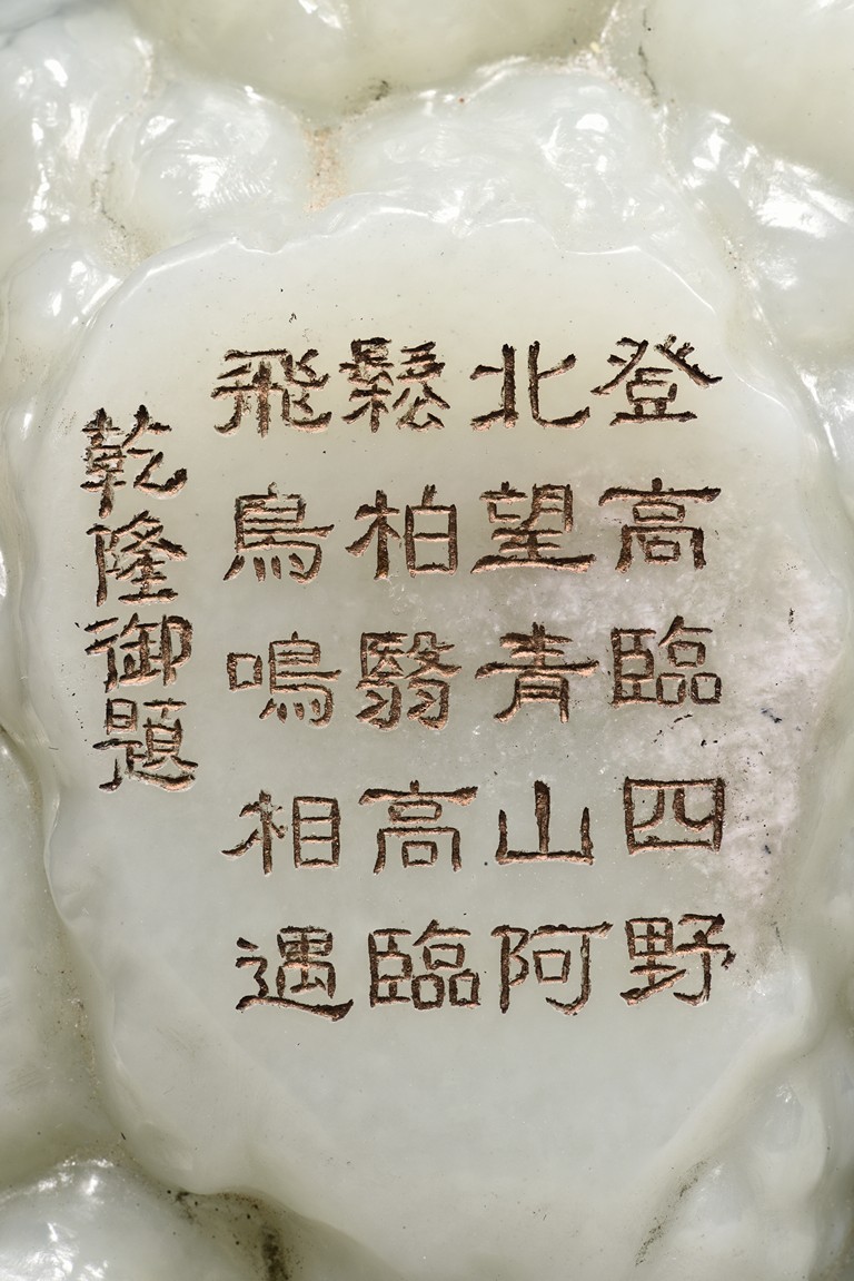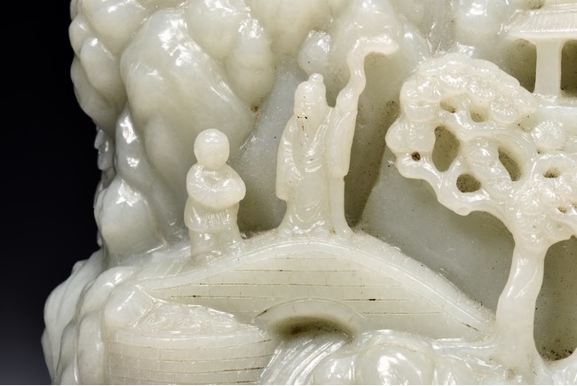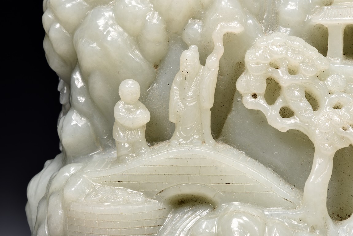 Carved with an elderly scholar holding a staff on left hand with his young attendant on an arched bridge above stream, with pavilions and trees along the rocky path. The reverse with poem inscription.