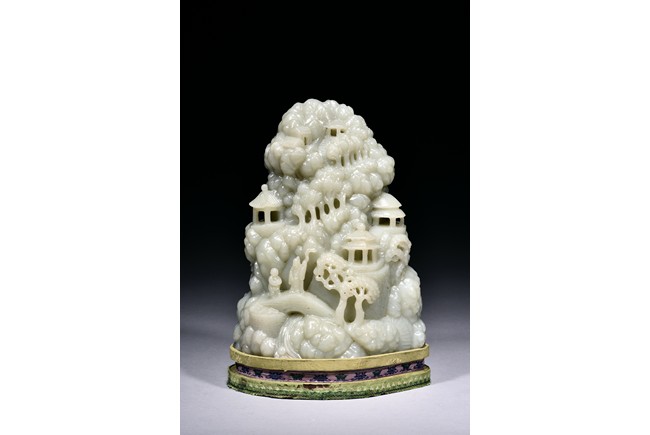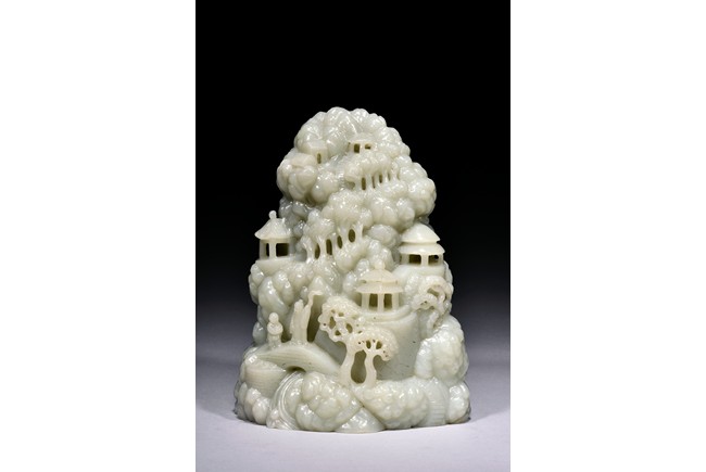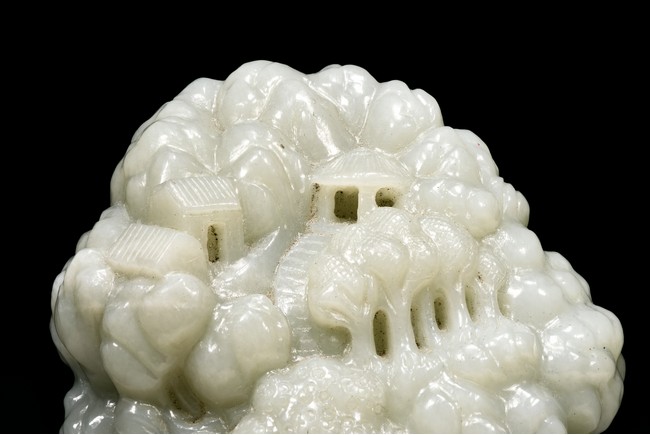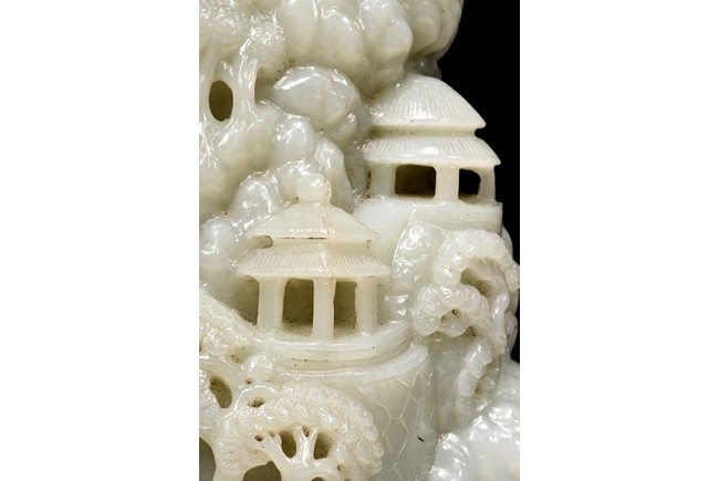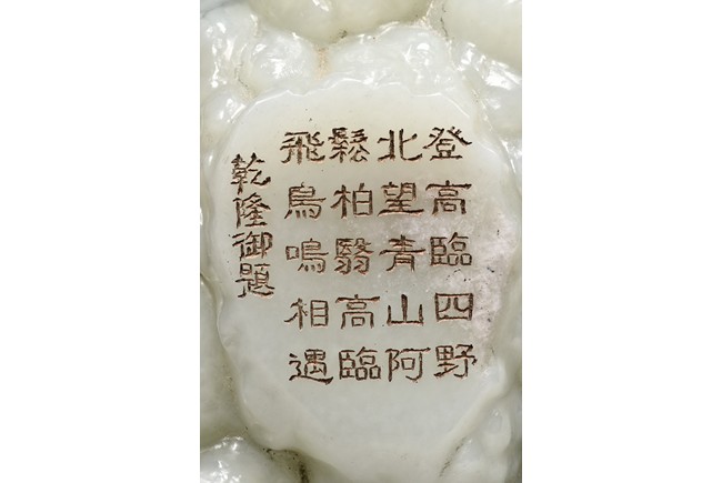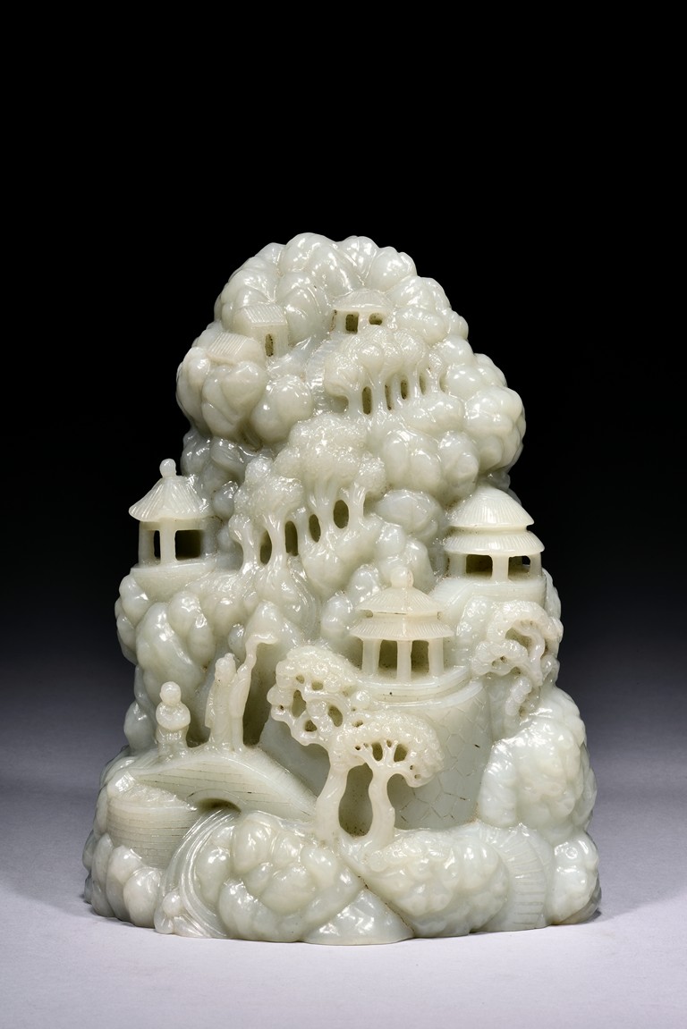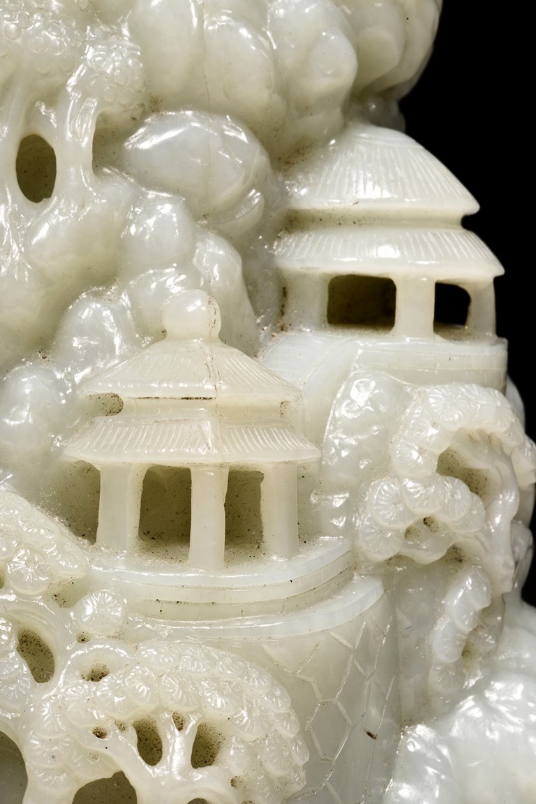 Carved with an elderly scholar holding a staff on left hand with his young attendant on an arched bridge above stream, with pavilions and trees along the rocky path. The reverse with poem inscription.