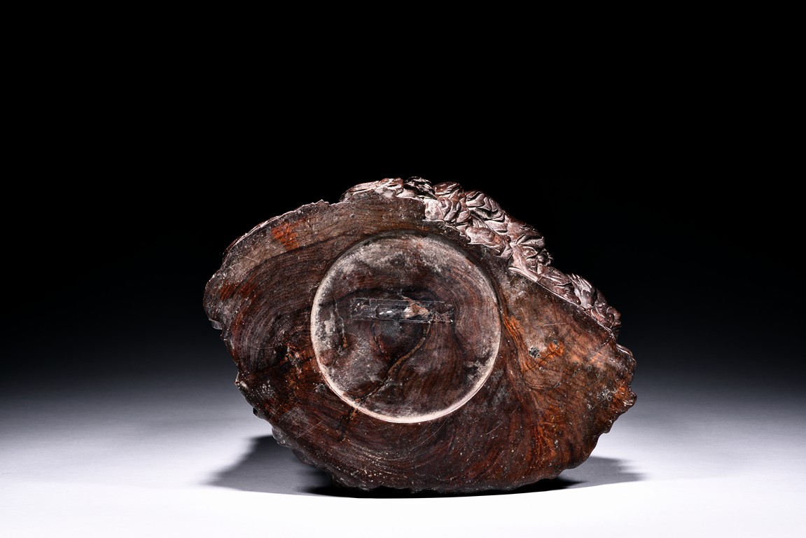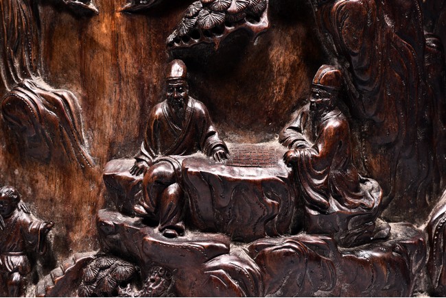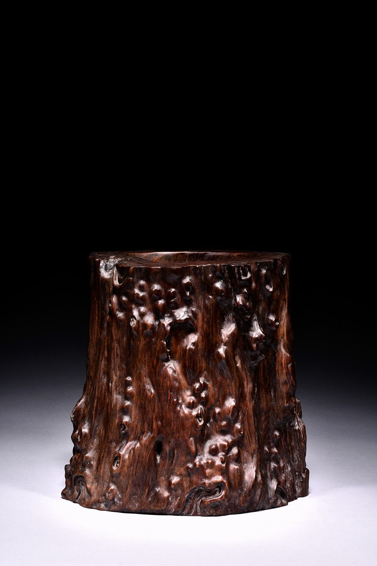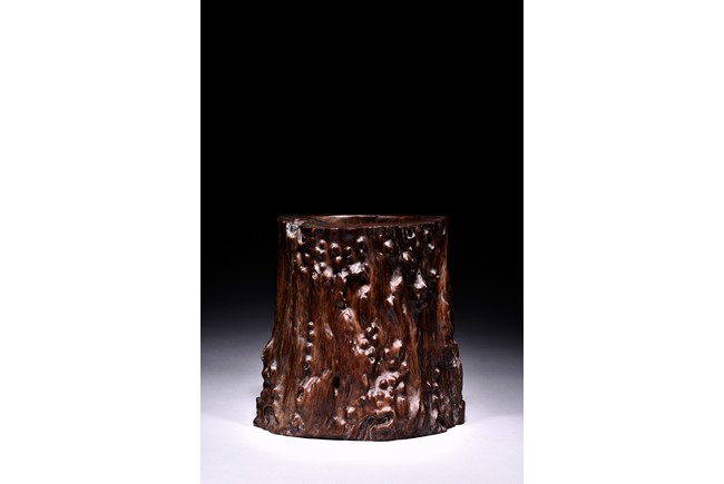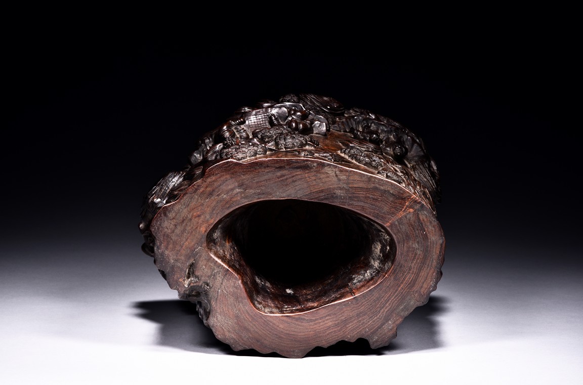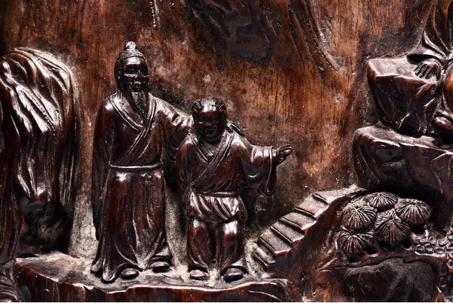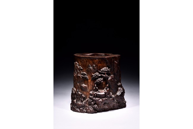 The brush pot is naturalistically carved, the sides are finely and deeply carved in relief with scenes of scholars and attendants engaging in various leisurely pursuits in a setting of terraces and pavilions amidst pine and rocks. One scene depicts two scholars gathered under pine around a table and playing Chinese chess, to their right an elderly scholar is assisted by a young boy walking up a rocky stairs, with mountains and pine trees carved to the background, the wood is of rich reddish-brown tone with natural wood crevices. Qing Dynasty period.