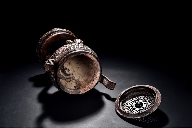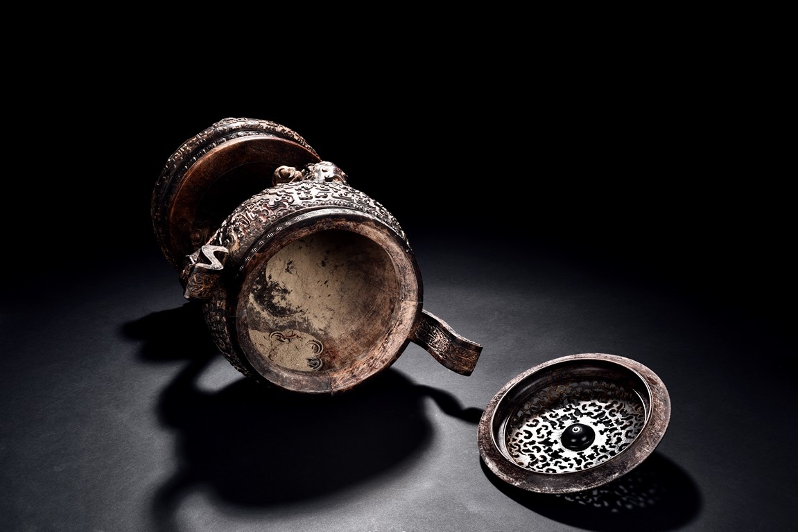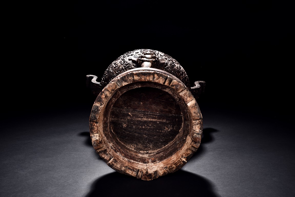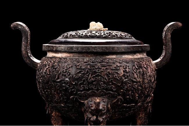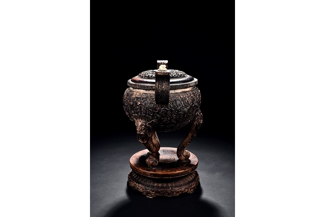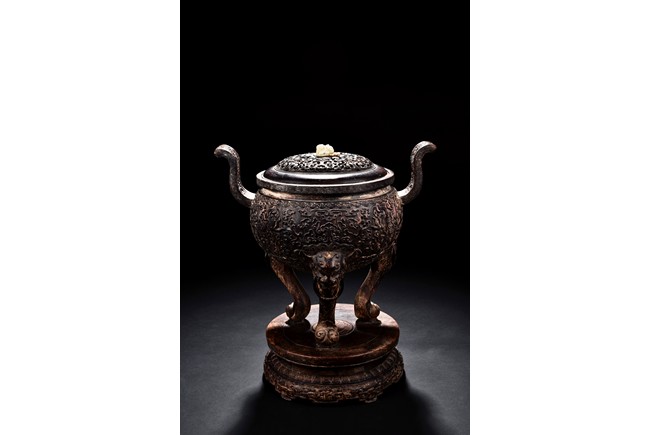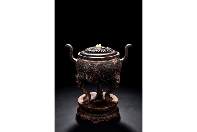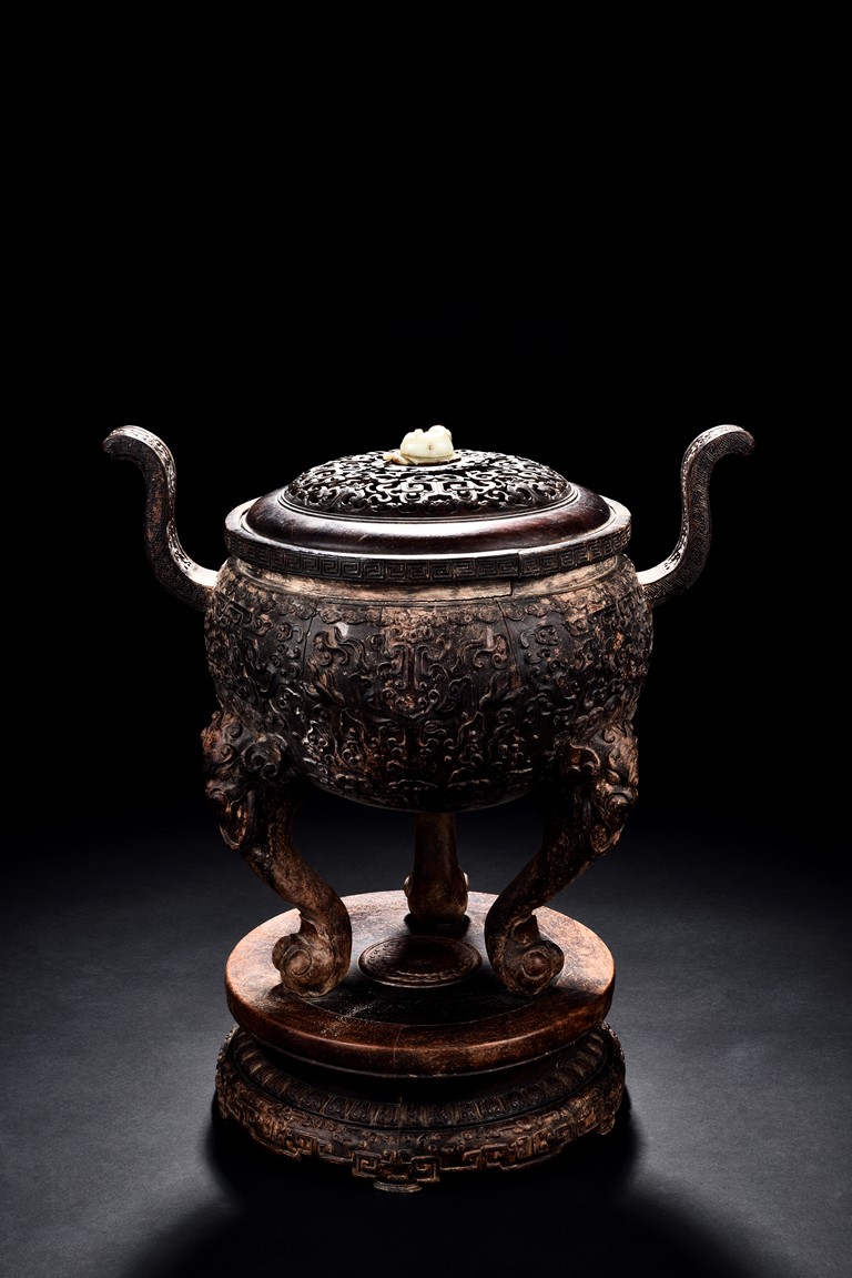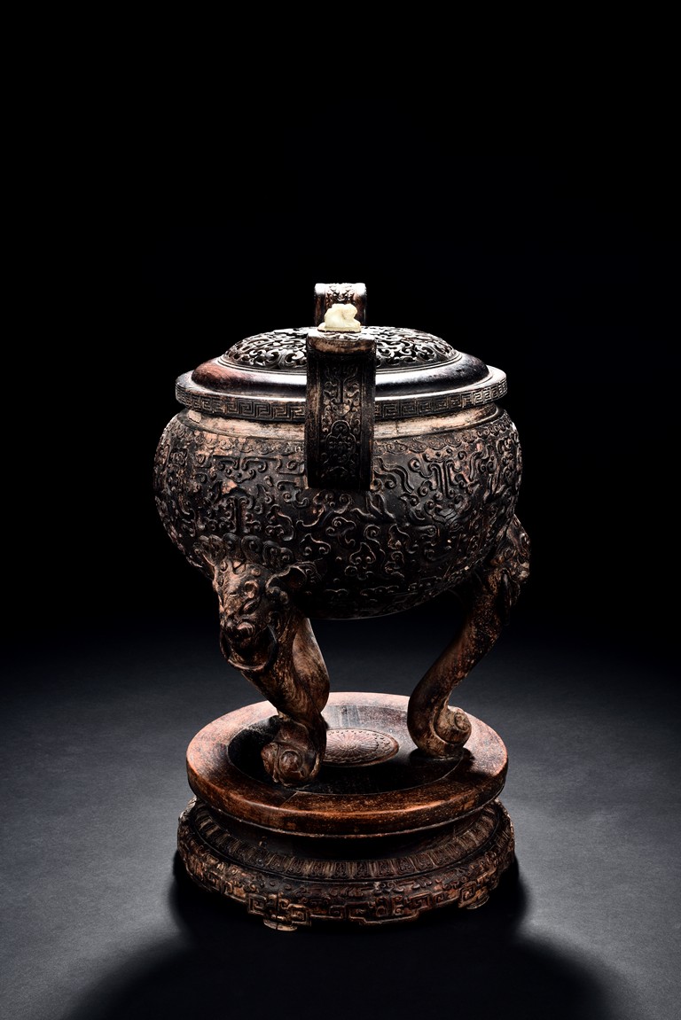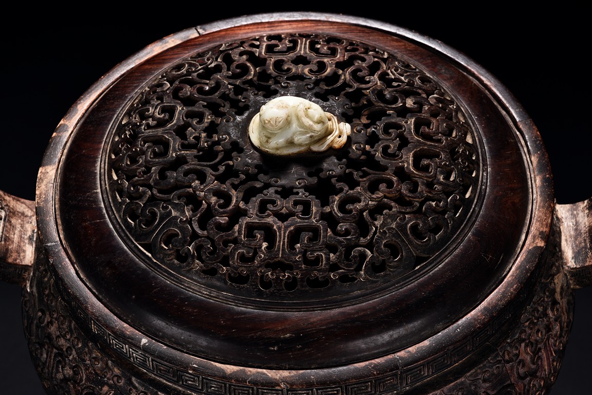 Of compressed globular form, the body is finely carved overall with archaistic geometric pattern, encircled with a band of ruyi-shaped motif above, the rim further carved with a band of key-fret pattern, the sides flanked by two curved handles, fitted with a circular reticulated wooden cover with archaistic pattern and surmounted with an archaic white jade recumbent beast finial, all supported on three curved beast-head legs, upon a circular stand with lotus-petal motif and key-fret bands. Qing Dynasty period.