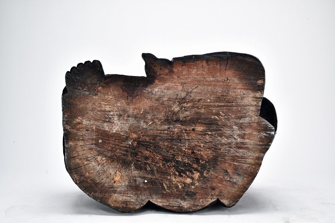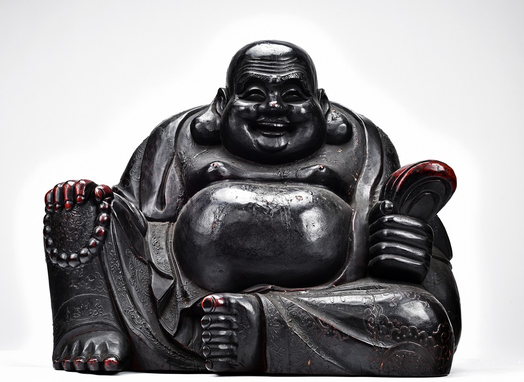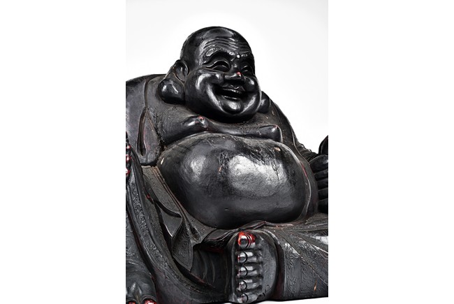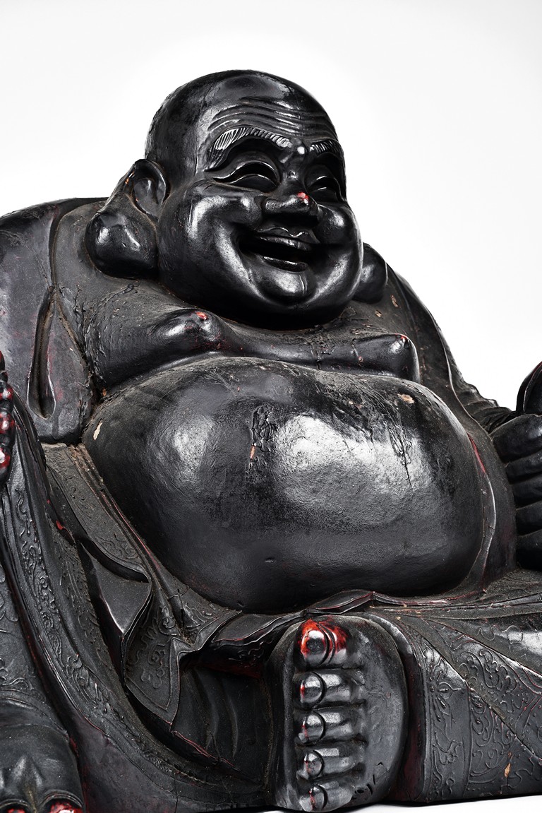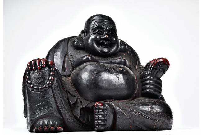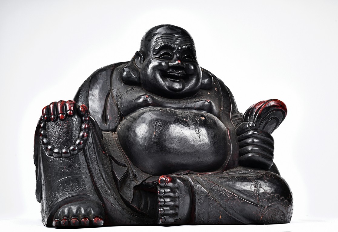 Carved with one leg raised and another resting at ease, the bodhisattva holding prayer beads in right hand and left hand holding cloth soak, the face with laughing expression. Republic period.