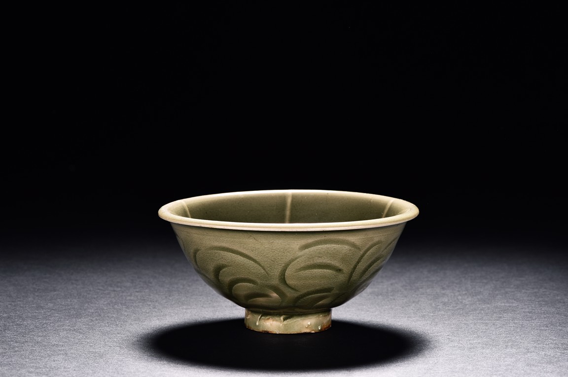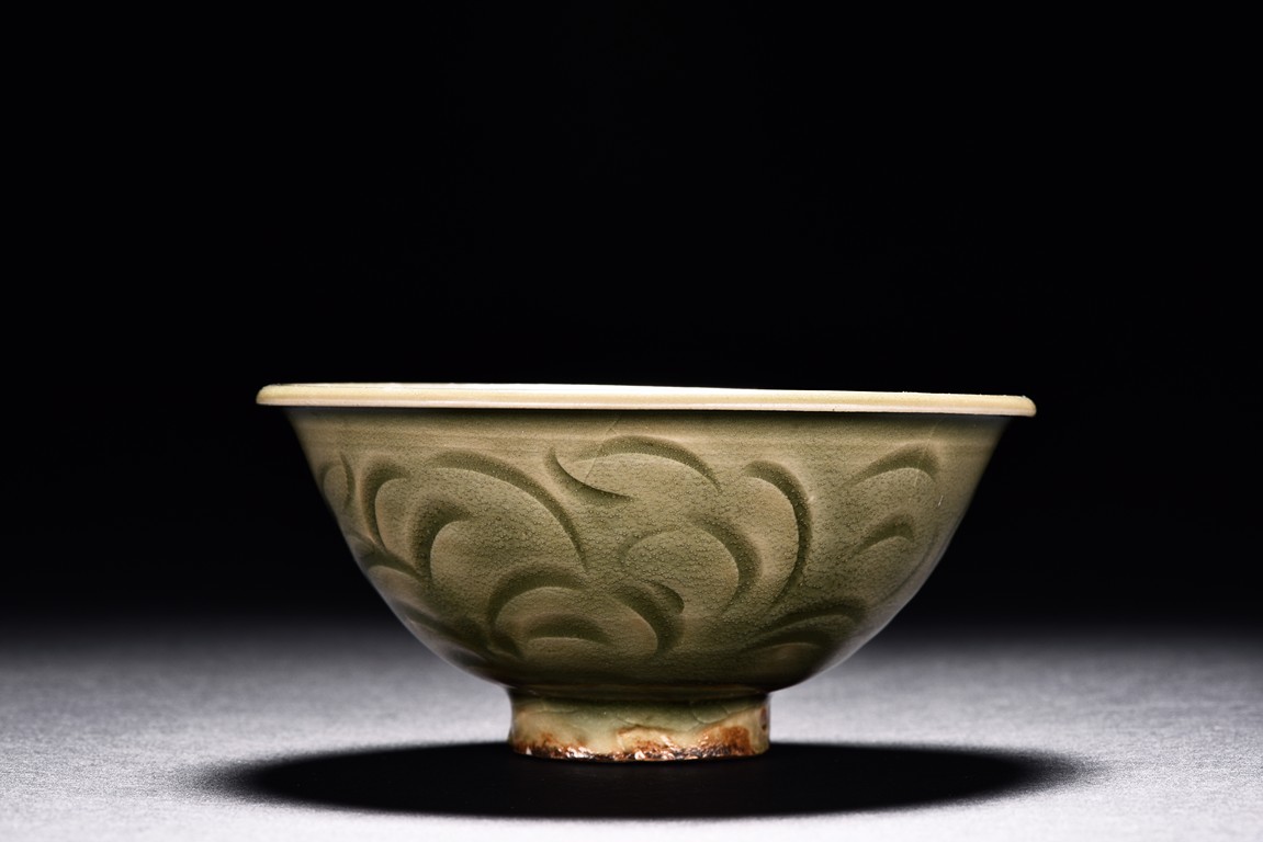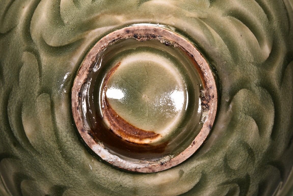 Potted with deep sides and rise to everted rim, the bowl is covered overall in olive green glaze and moulded with stylized lotus leaves. Song Dynasty period.