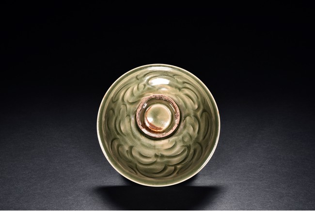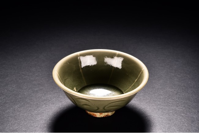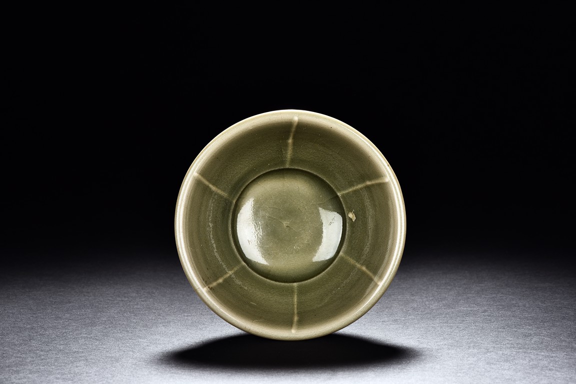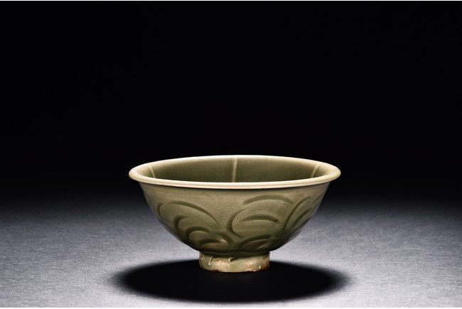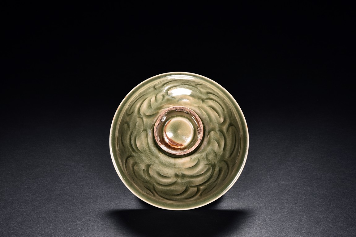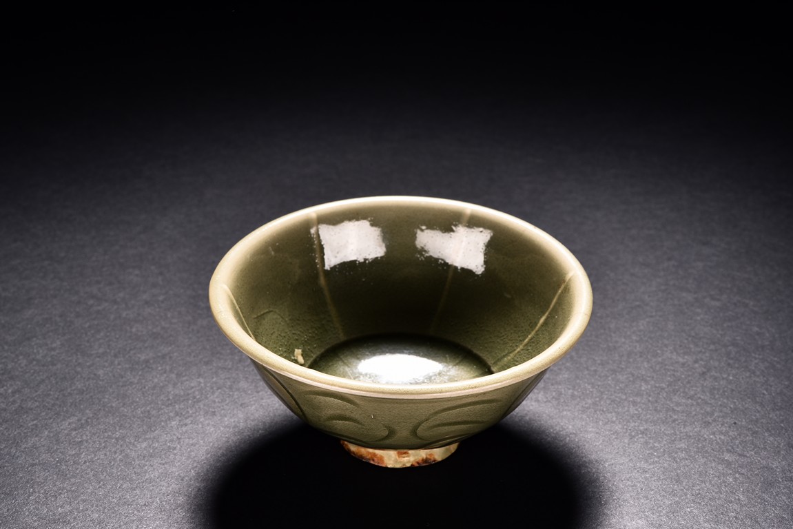 Potted with deep sides and rise to everted rim, the bowl is covered overall in olive green glaze and moulded with stylized lotus leaves. Song Dynasty period.