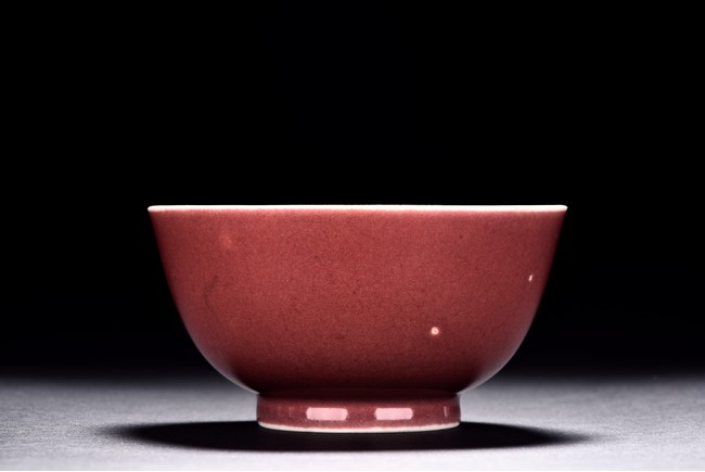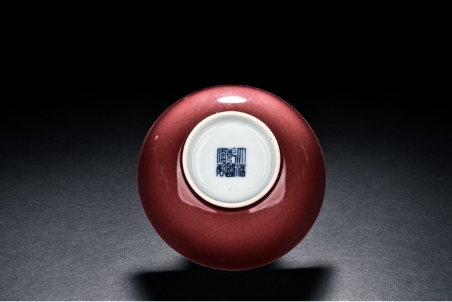 Potted with rounded sides and rising to a slightly flared rim, it is supported on short foot and covered in deep red glaze, with wide glaze to the interior and base. The bottom bears six character 'QIANLONG' mark. Qing Dynasty Period.