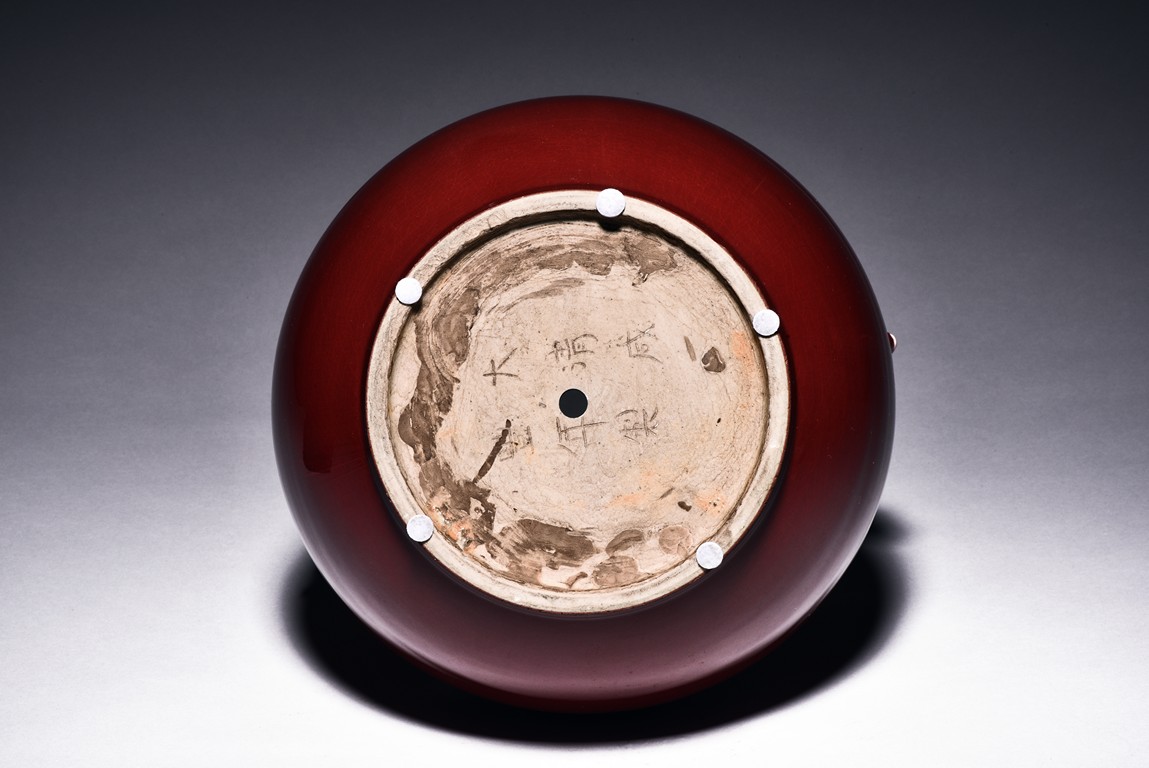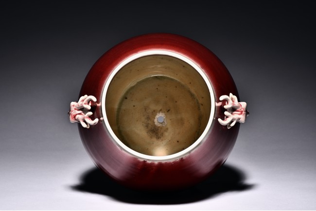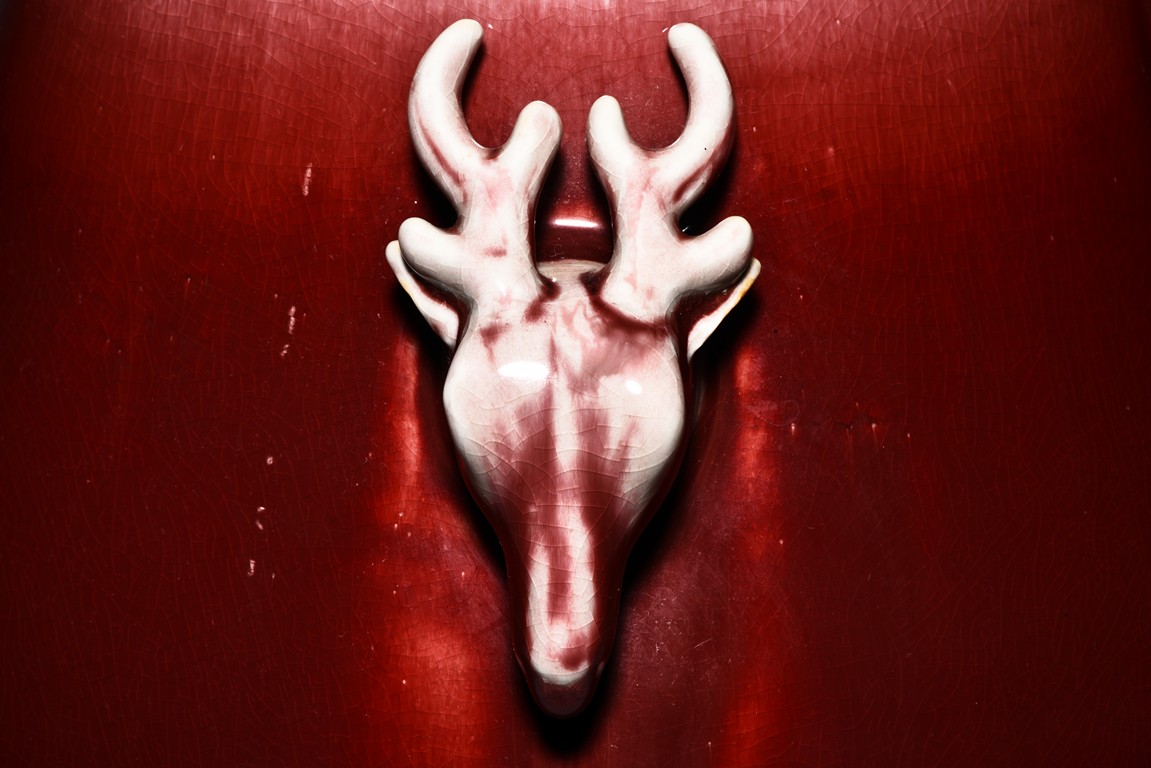 Of archaistic hu form, the body raises from a circular foot and rises to the neck flanked by two deer-head handles, the exterior covered with evenly deep red glaze and thinning towards the mouth rim. The bottom incised with six character 'XIANFENG' mark. Qing Dynasty Xianfeng period.