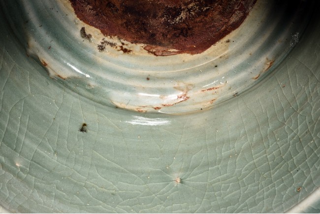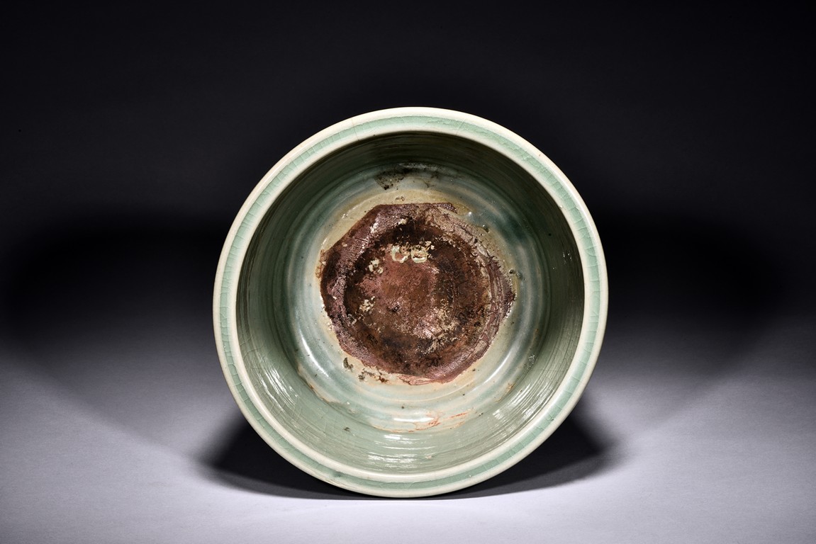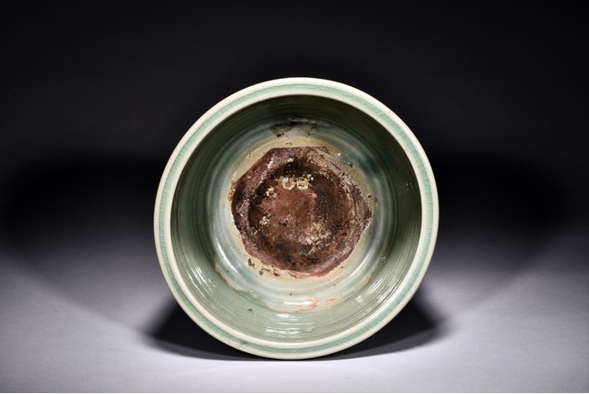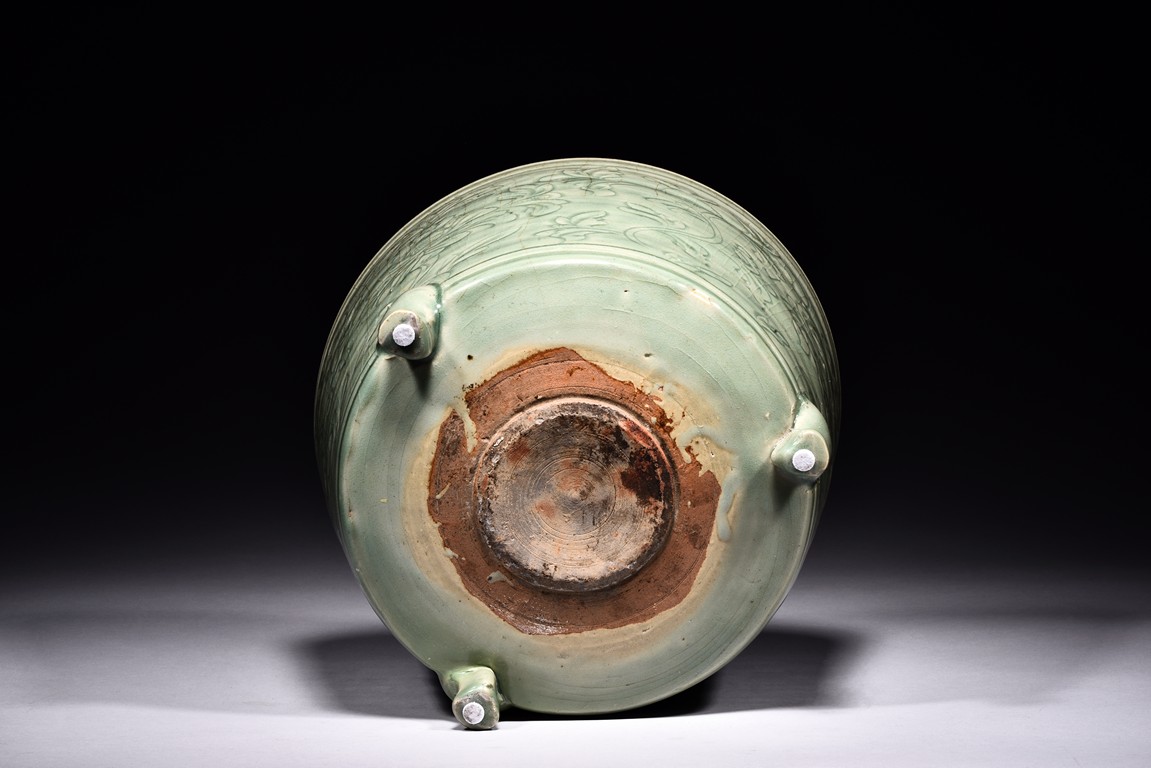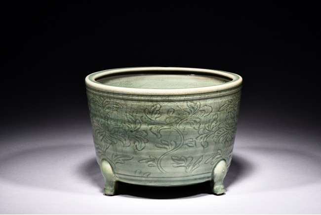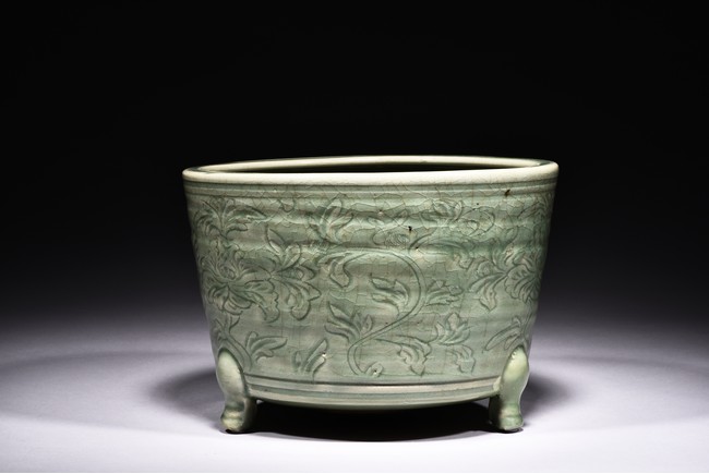 Raised on three cabriole legs and modelled in cylindrical form, the body is overall covered in sea-green glaze that continue into the unglazed interior, the exterior moulded with floral leaves and branches, the base unglazed. Ming Dynasty period.