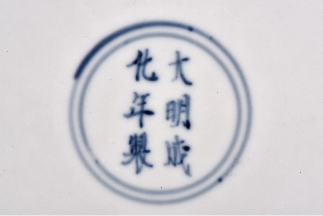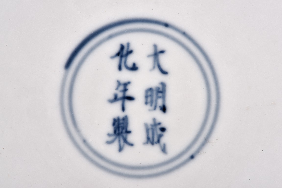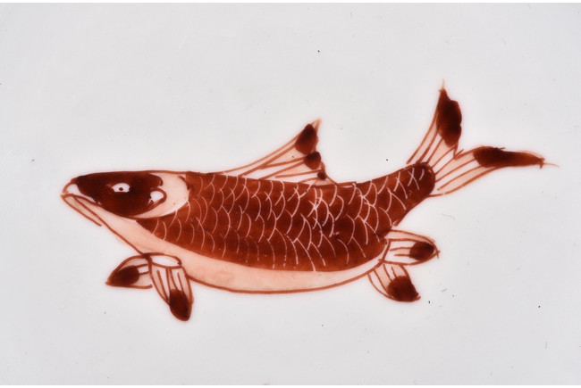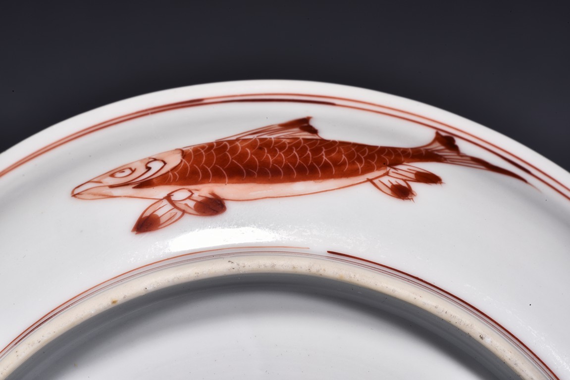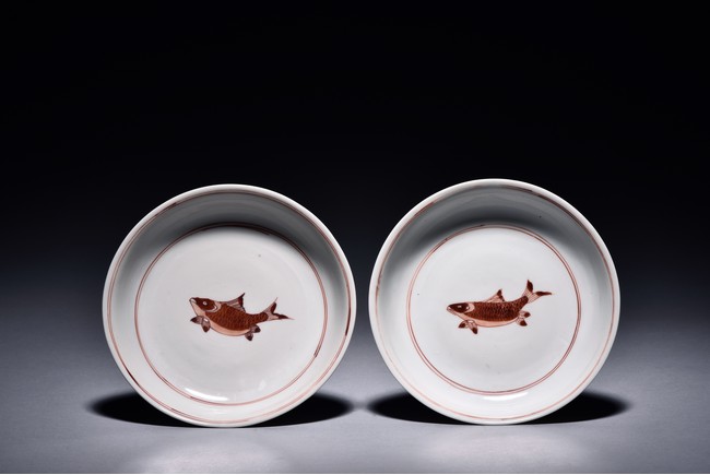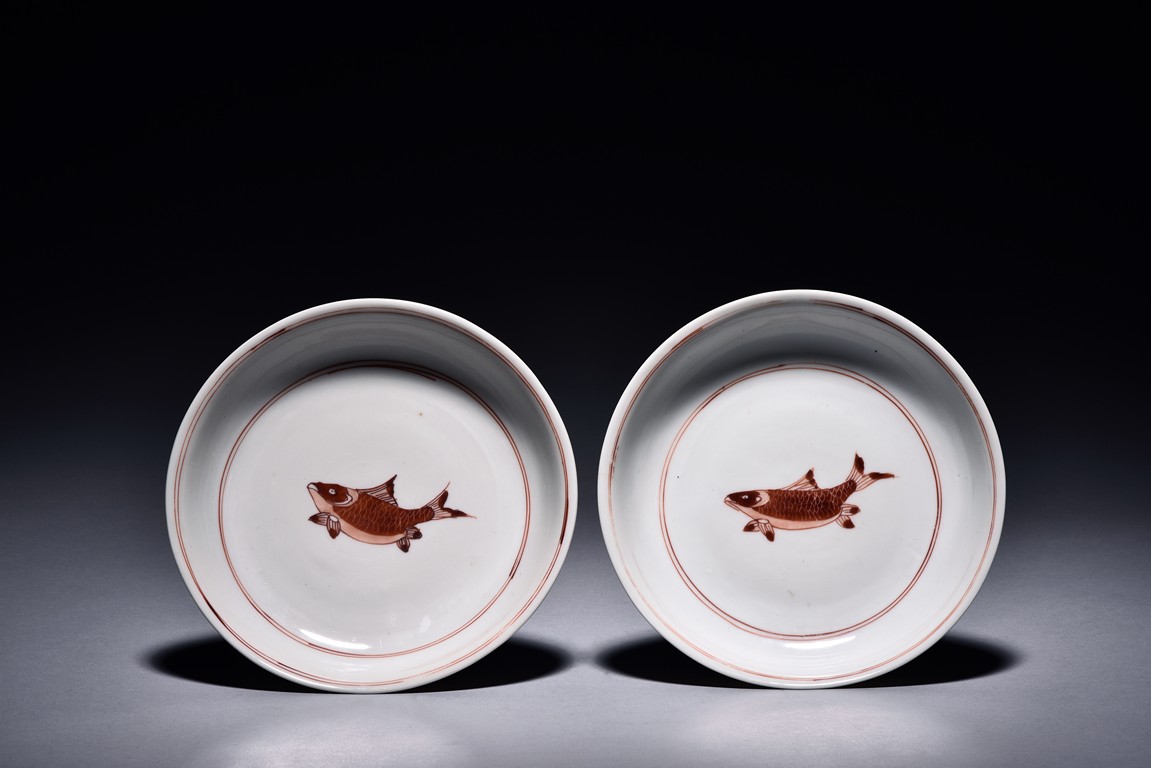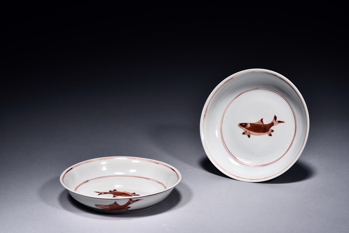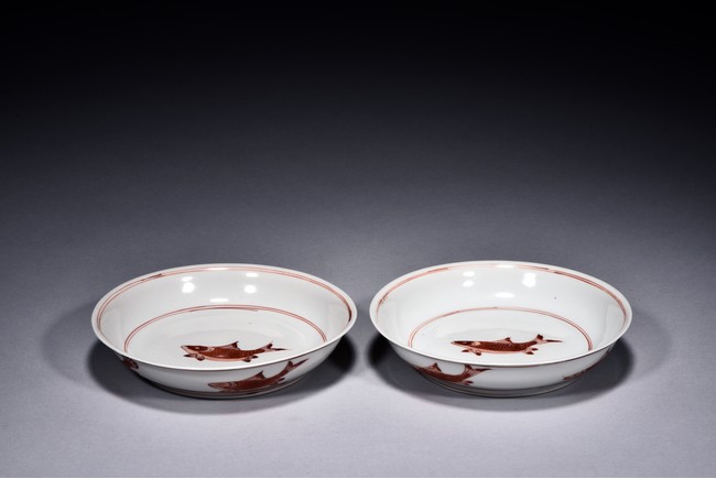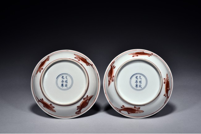 Raised from circular foot ring, the exterior finely painted with four carps motif in iron red glaze, the interior further decorated with a carp motif at center encircled by two band double rings, the base bearing six character 'CHENGHUA' mark. Ming Dynasty period.