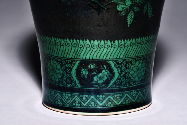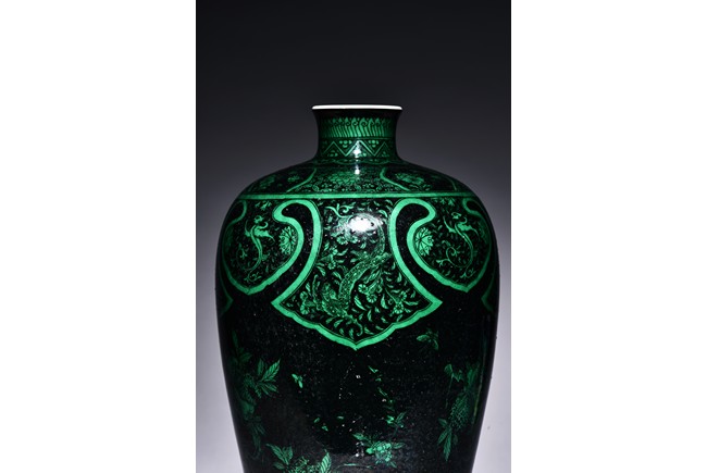 Potted with a broad shoulder and waisted neck, the vase is finely decorated in green with leafy fruit branches and sprays, flanked by alternating ruyi-shaped head band enclosing chilong and floral pattern above, and geometric bands around the base, all reserved on black ground. The bottom bears six character 'KANGXI' mark. Qing Dynasty period.