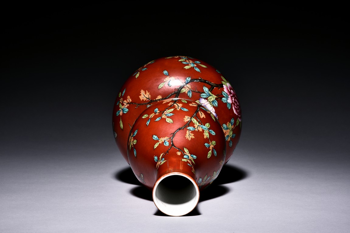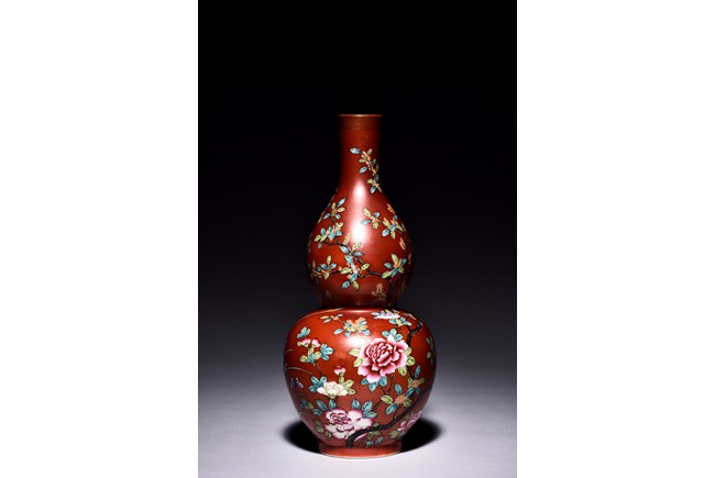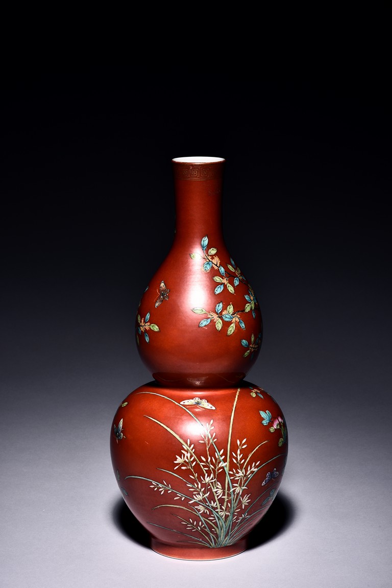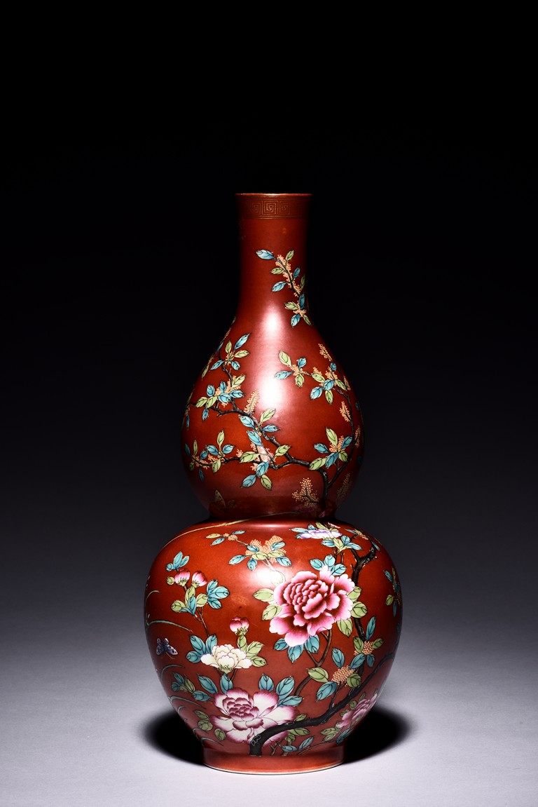 Of double gourd form, each section is finely enamelled with peony flower blossoms and buds growing from leafy branches with various colored glaze, the reverse painted with orchids and butterfly, the rim gilt-decorated with key-fret pattern, all against impressive coral-red ground, the bottom bearing four character 'YONG QING CHANG CHUN' mark. Qing Dynasty period.