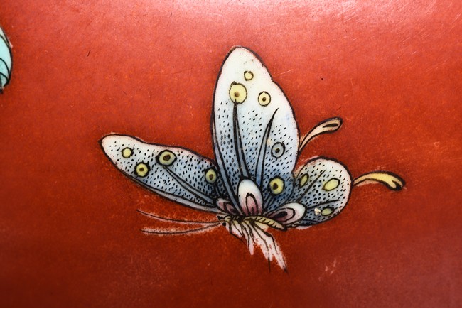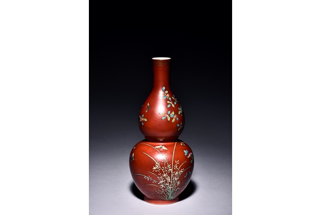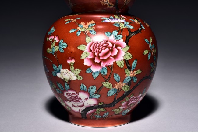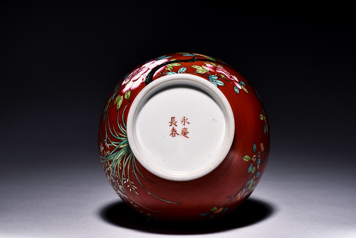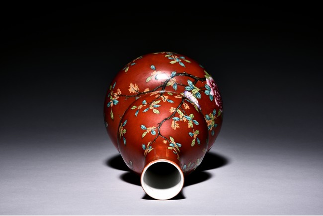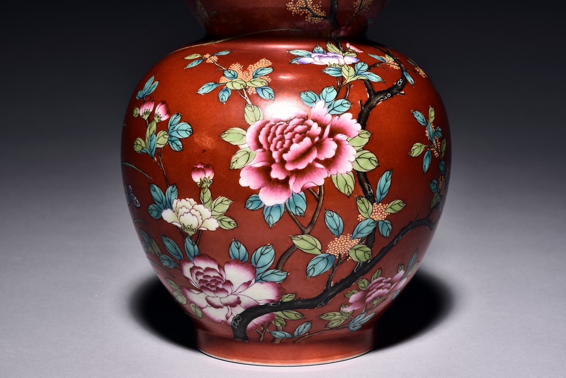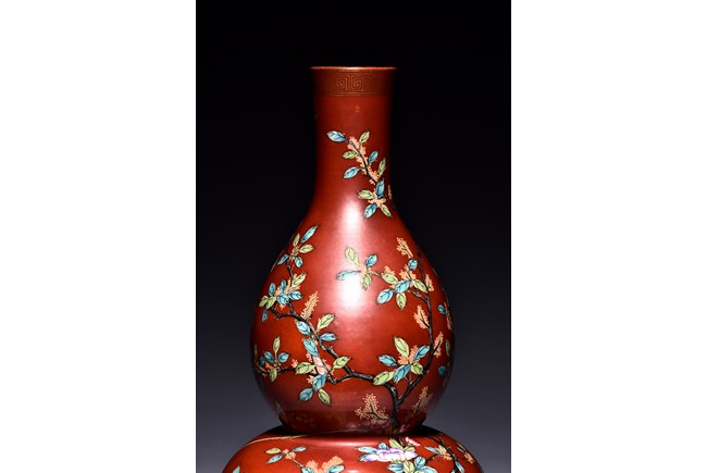 Of double gourd form, each section is finely enamelled with peony flower blossoms and buds growing from leafy branches with various colored glaze, the reverse painted with orchids and butterfly, the rim gilt-decorated with key-fret pattern, all against impressive coral-red ground, the bottom bearing four character 'YONG QING CHANG CHUN' mark. Qing Dynasty period.