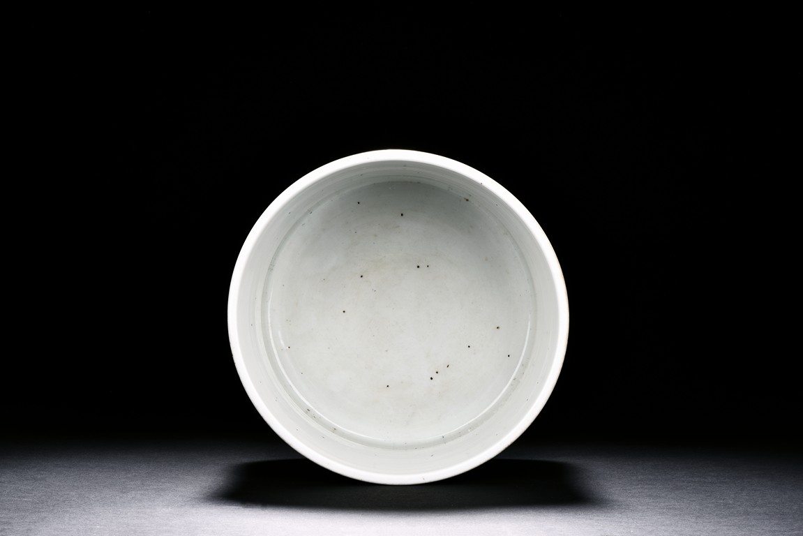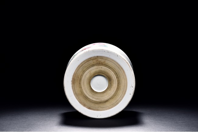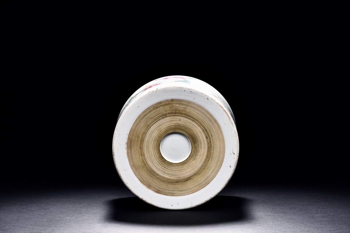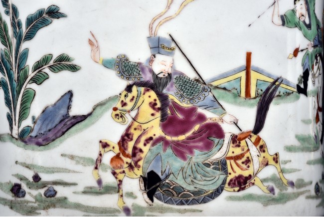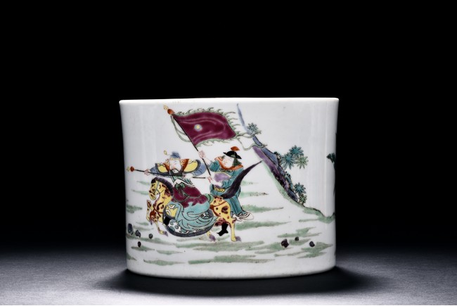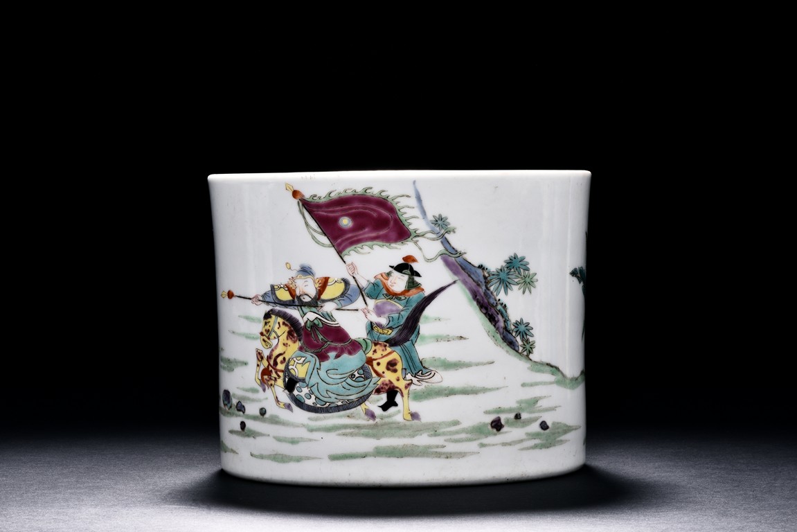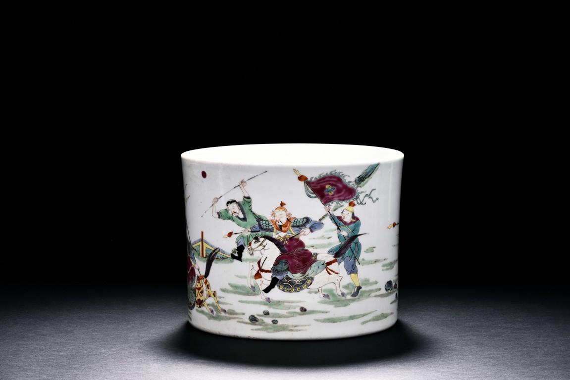 Of cylindrical form, the exterior is finely painted in various colors with a continuous scene of a fierce battle among generals on horseback and warriors amidst a rocky landscape, including two fully armed generals with long spears, accompanied by three foot soldiers holding banner and spear, all chasing a horseback general to the front. Qing Dynasty period.