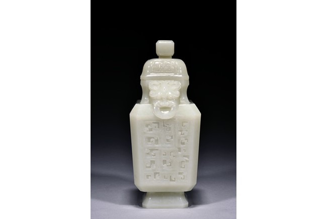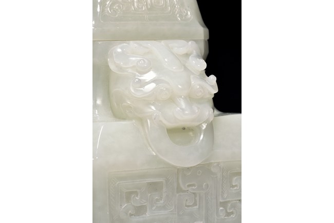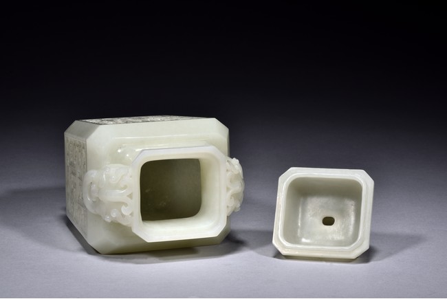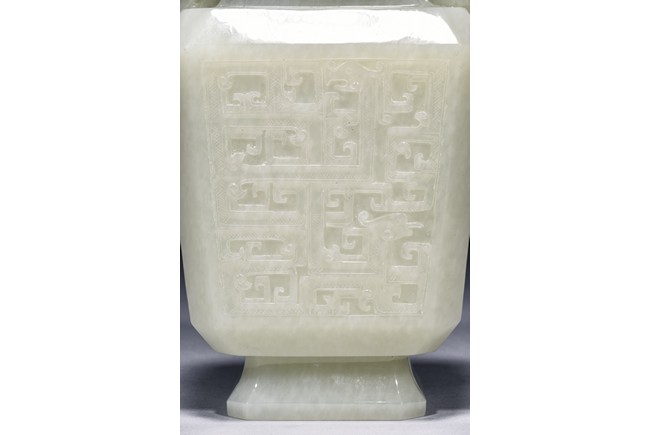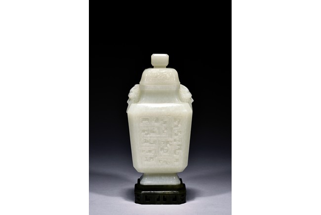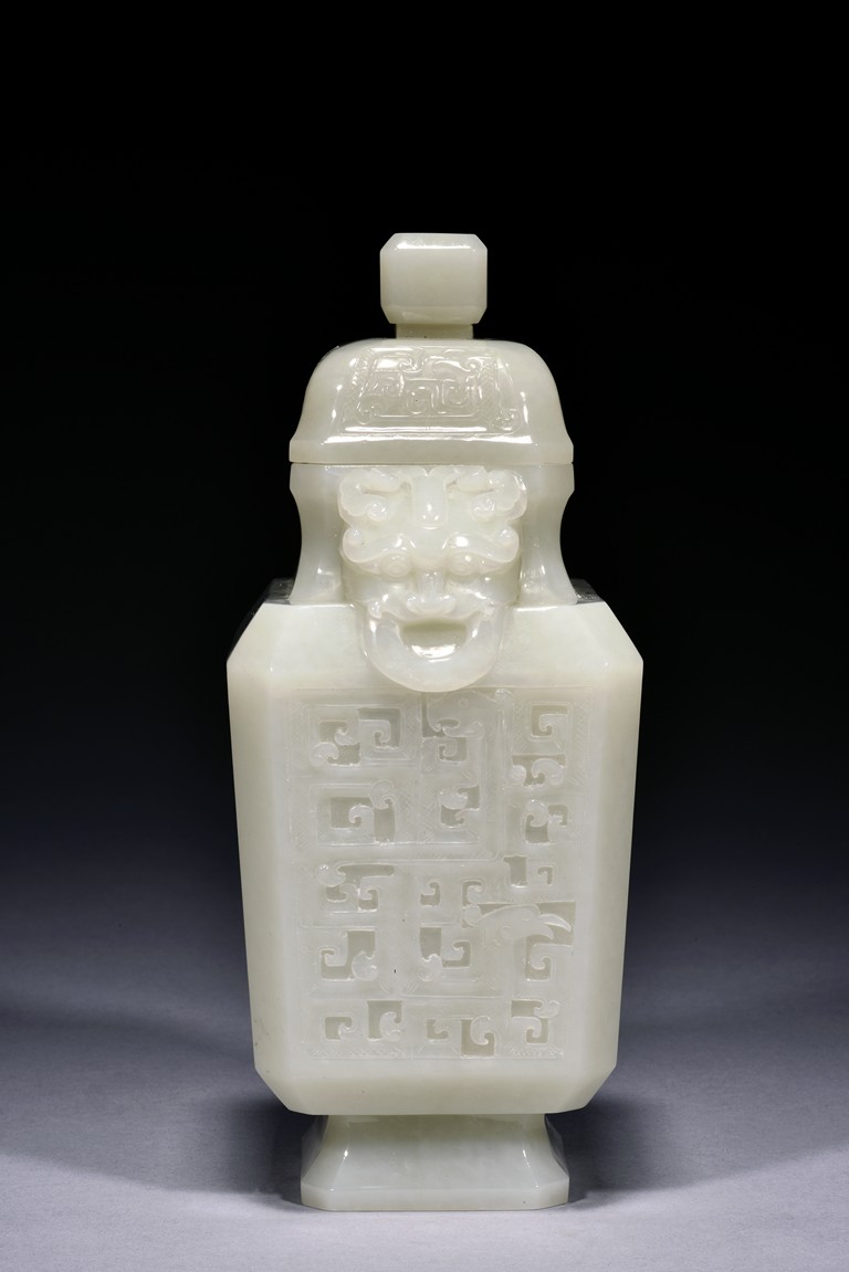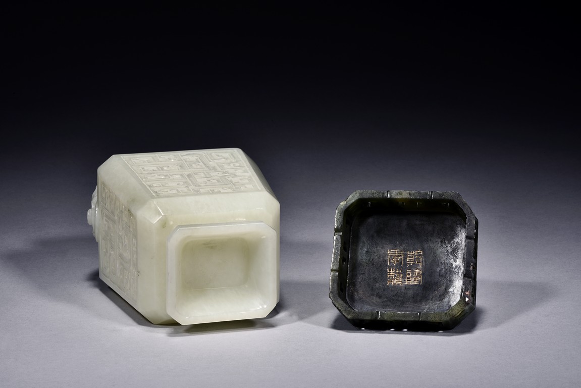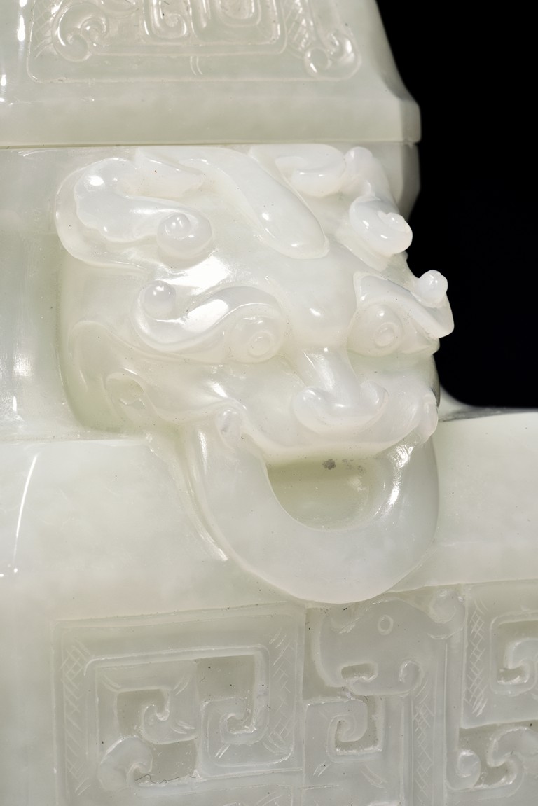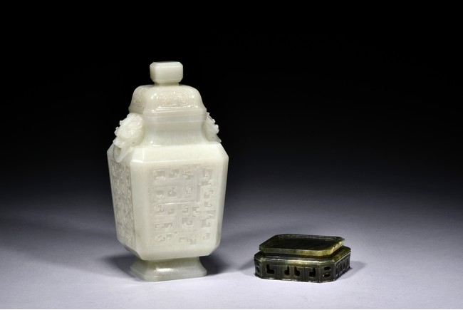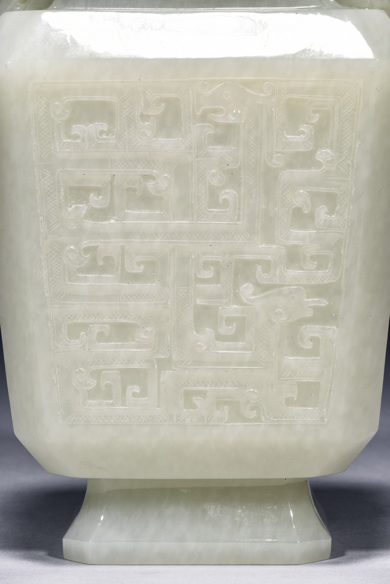 Of baluster form and square section, the body carved with stylized scrolling mythical beast in shallow relief on four sides, rising to a narrow neck flanked by buddhist lion handles, the domed cover topped with a knop finial, all supported on spinach jade stand. Qing Dynasty period.